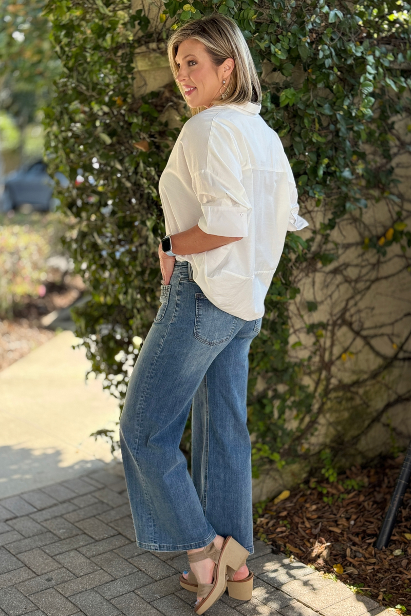 Charlie B White Cropped Patch Pocket Flare Twill Pants
