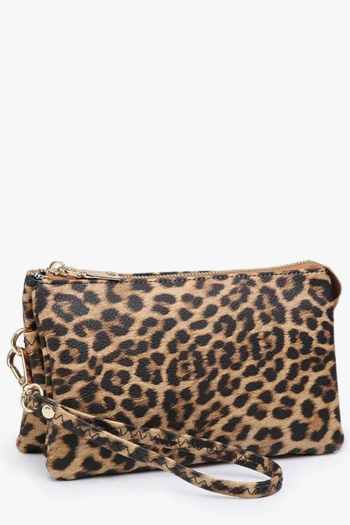 Turn heads with the Jen & Co Riley Monogrammable 3-Compartment Crossbody & Wristlet in leopard print. Designed for both fashion and function, this best-selling vegan leather bag features a chic animal print exterior and three spacious compartments for easy organization. The secure middle zipper pocket and interior card slots keep your essentials neatly stored, while the detachable wristlet strap and adjustable crossbody strap allow for versatile wear. Choose your preferred hardware tone—gold or silver—for a personalized touch, and add a custom monogram to make it uniquely yours. Finished with soft herringbone or branded lining, the Riley adds the perfect mix of sophistication and practicality to your everyday style.
