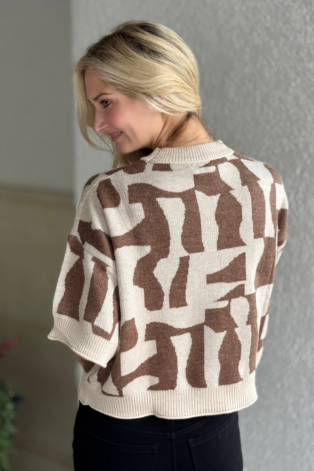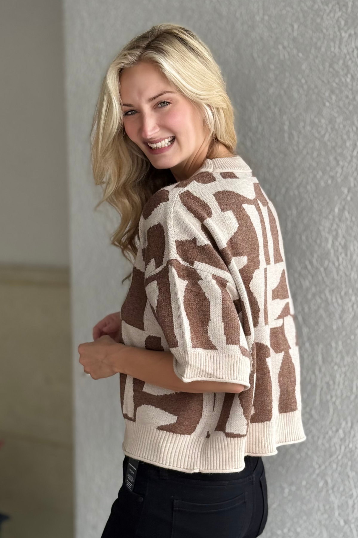 Elevate your everyday look with the Better Than Basic Abstract Sweater, a modern knit that’s anything but ordinary. Designed in soft neutral tones of brown and cream, this lightweight sweater features an eye-catching geometric pattern that adds a touch of artistic charm. The relaxed fit and short sleeves make it perfect for layering or wearing solo as the seasons change.