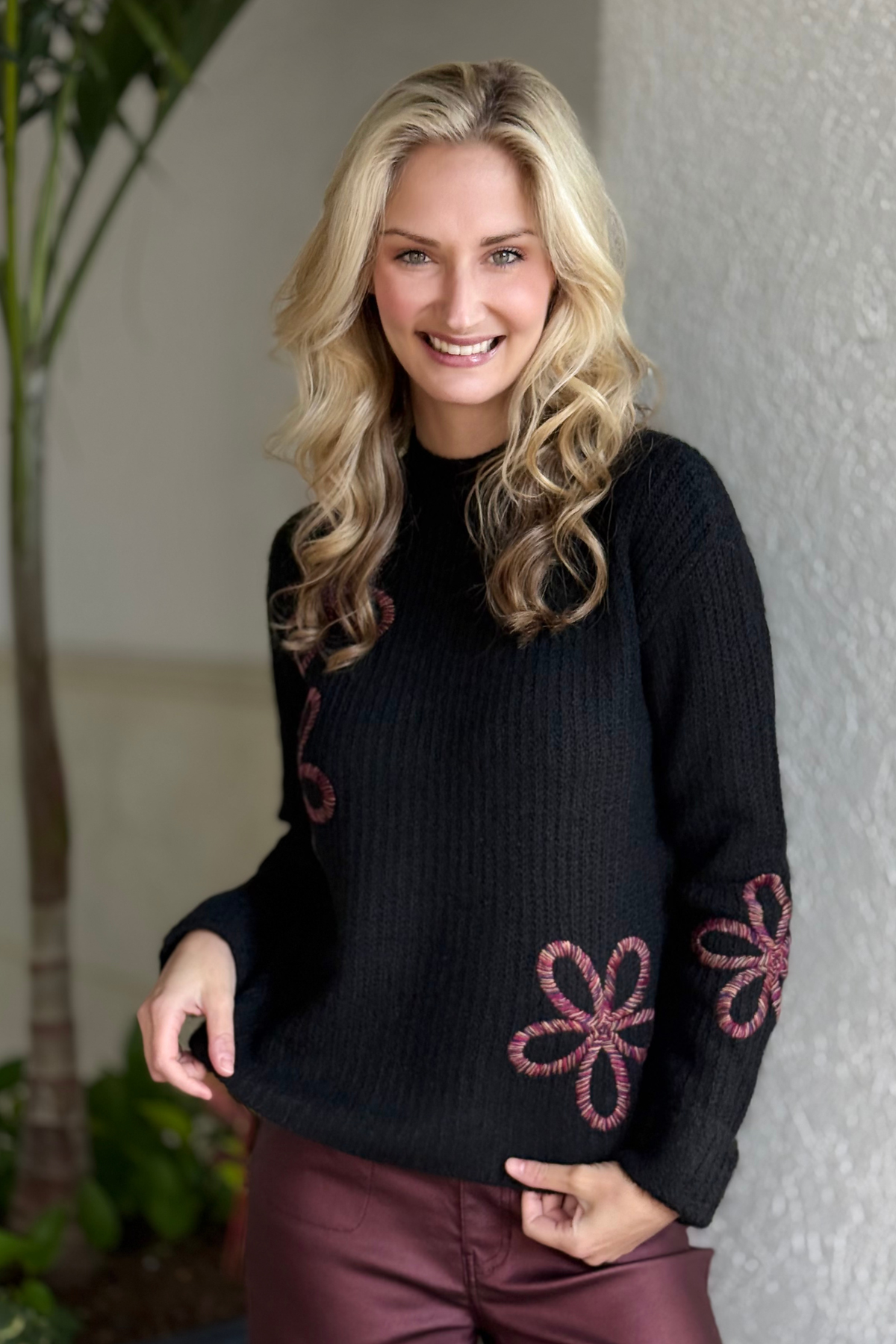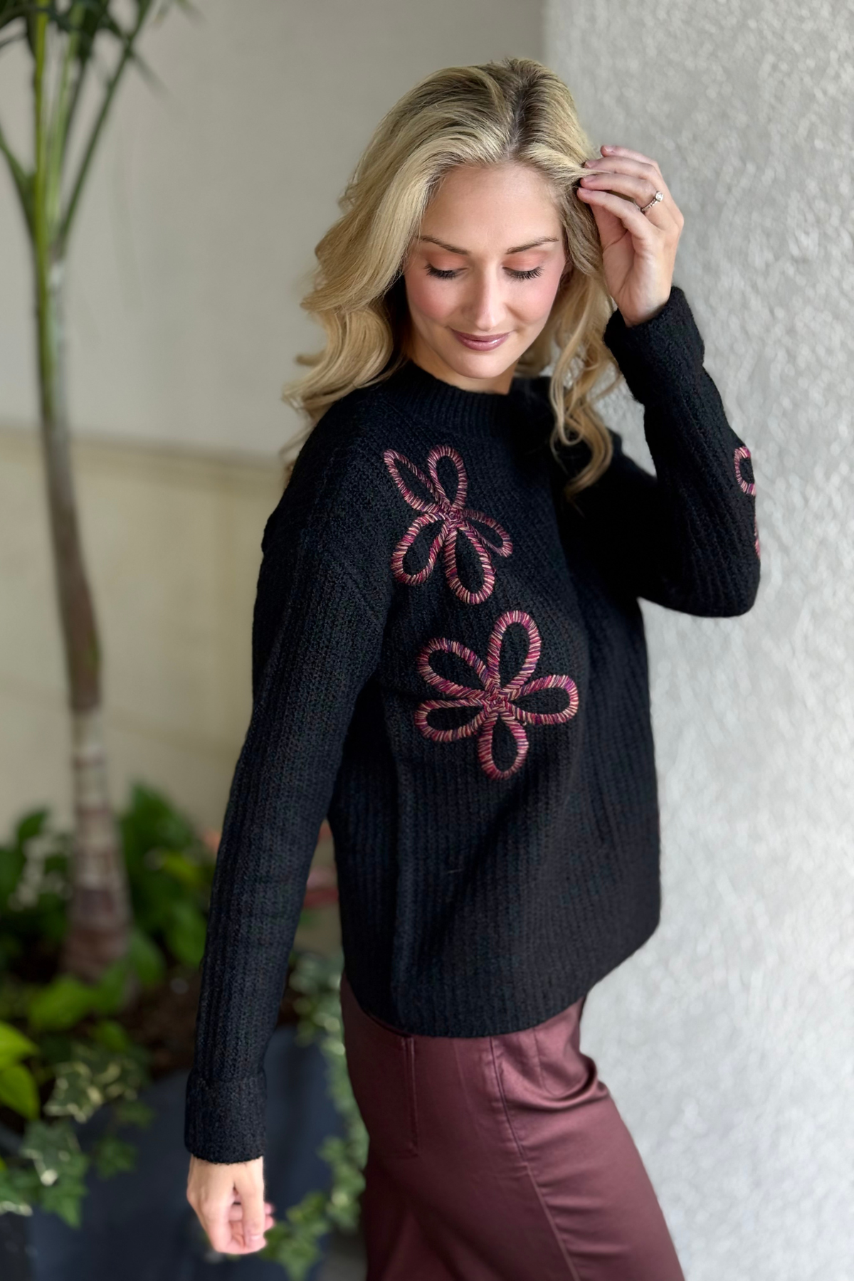Elevate your fall style with the Charlie B Mock Neck Floral Soutache Sweater in classic black. This cozy knit features delicate, hand-stitched soutache floral accents that bring texture and charm to its refined design. The relaxed silhouette and wide cuffs offer an effortlessly chic fit, perfect for layering over denim or pairing with sleek trousers. With its soft feel and durable knit, this sweater blends elegance and comfort, making it a must-have piece for the cooler season.