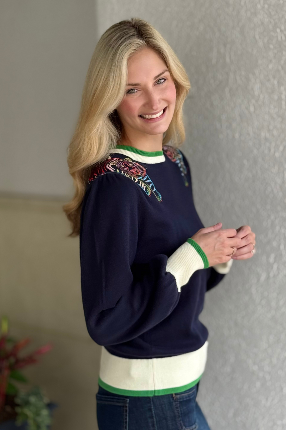 Make a bold yet effortlessly chic statement with the Colorblock Tiger Embroidered Knit Sweater Top. Crafted from a lightweight knit fabric, this navy pullover features stunning multicolor tiger embroidery on each shoulder for a playful yet sophisticated touch. The contrast trim in ivory and green adds a pop of fresh detail, while the relaxed silhouette keeps it comfortable for all-day wear. Perfect for everything from casual weekends to dinner with friends, this standout sweater will instantly elevate your style with a touch of fearless charm.