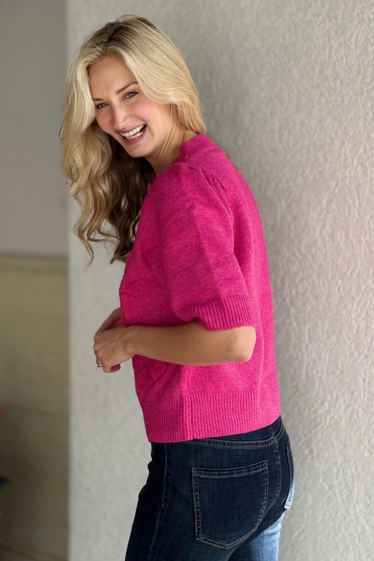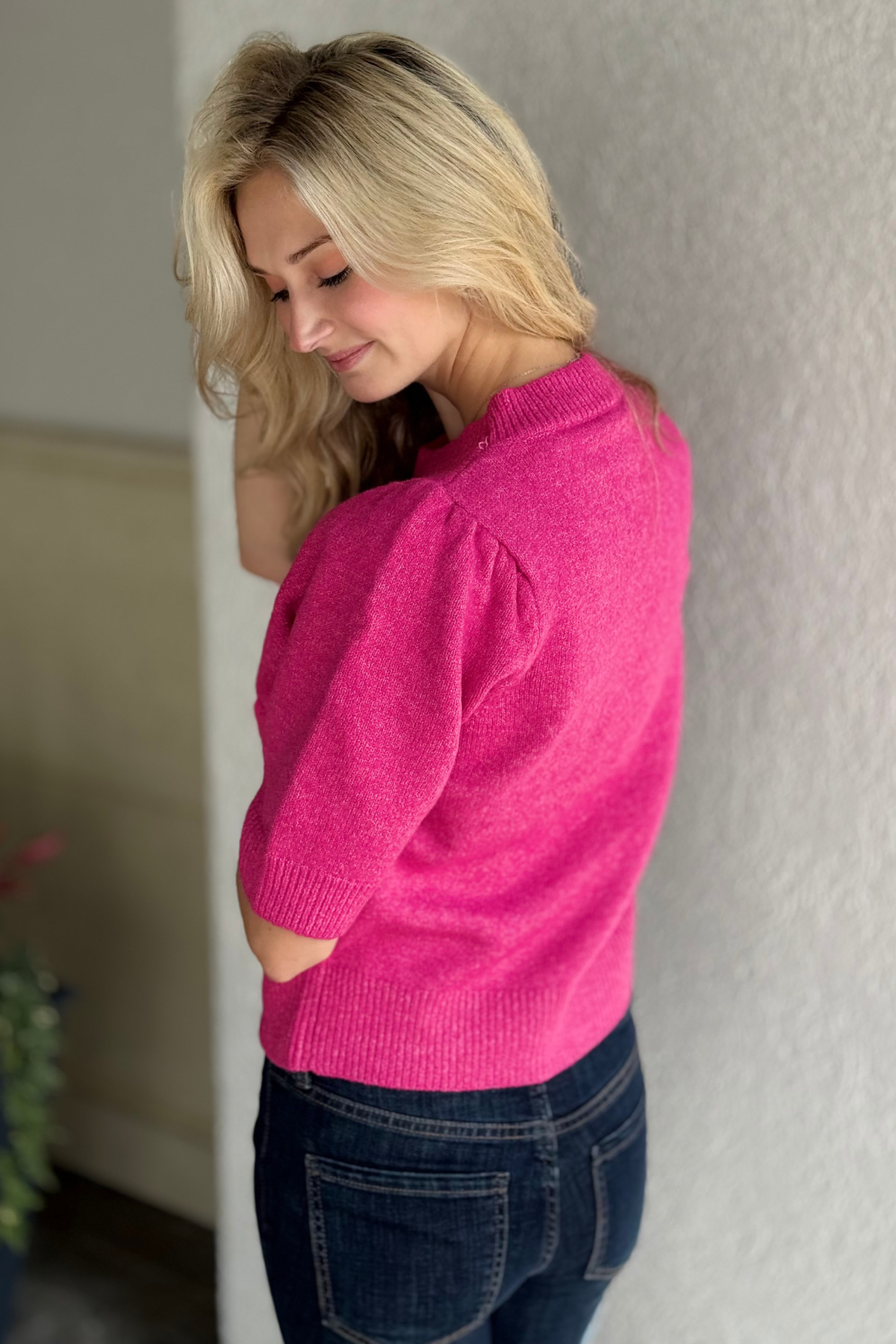 Floral Appliqué Puff Sleeve Sweater Top in Fuchsia
