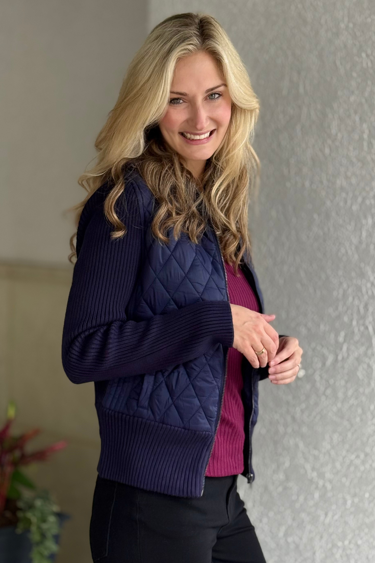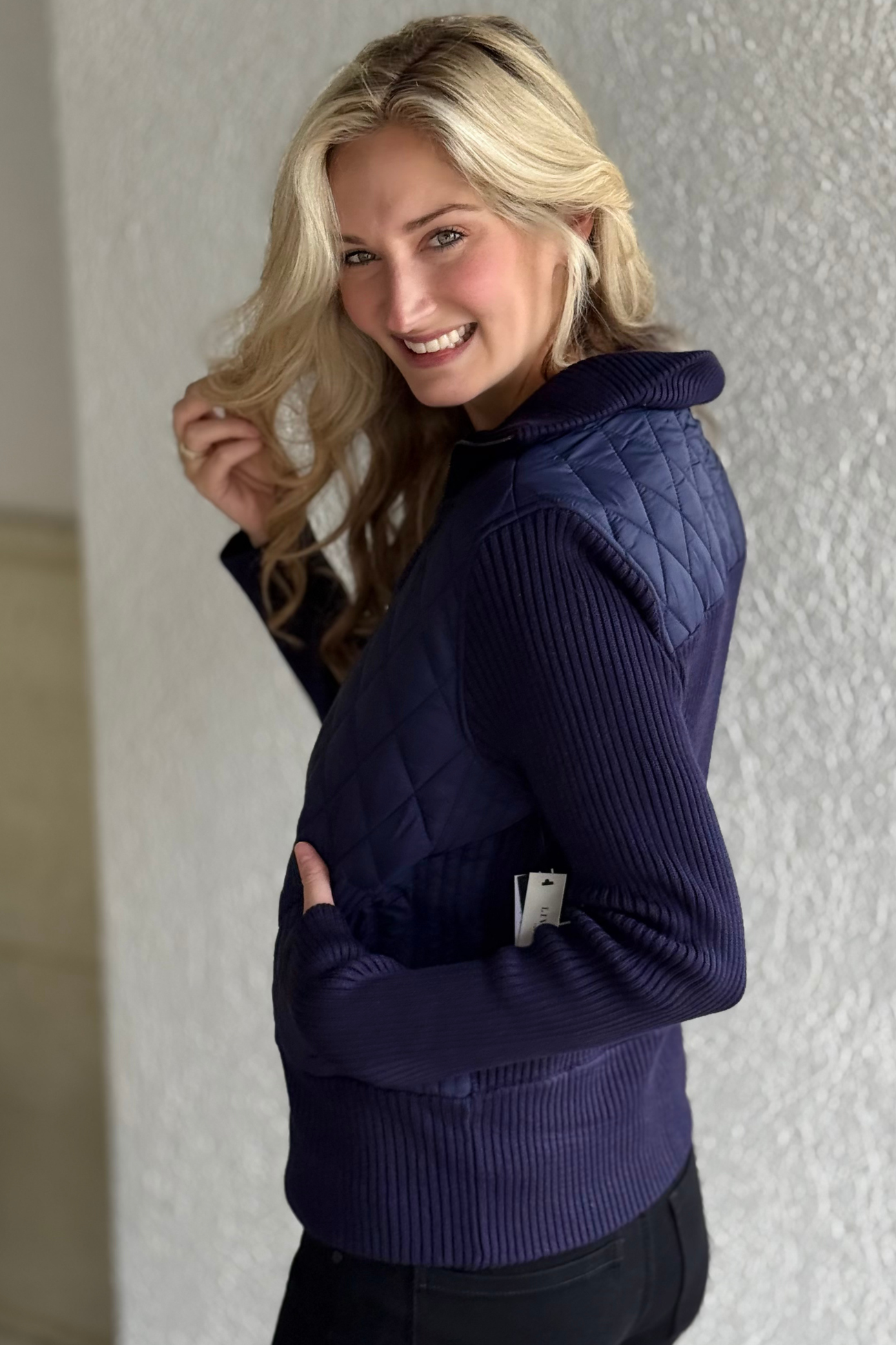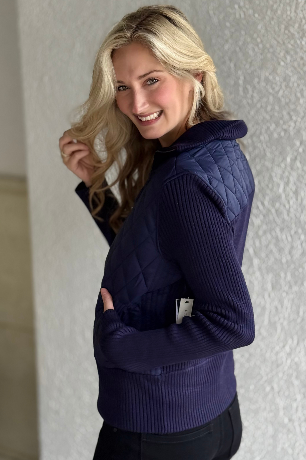 Liverpool Quilted Zip-Front Sweater Jacket in Sleek Navy