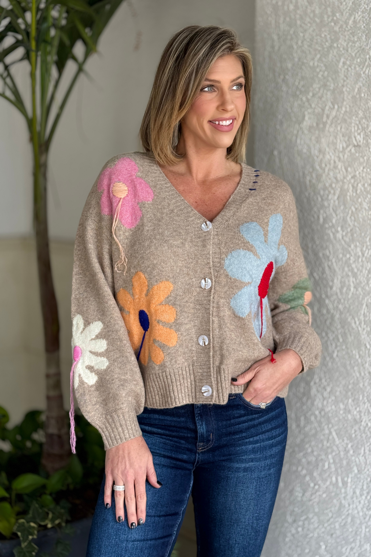 Turn every outfit into a statement with the Petal Parade 3D Floral Patchwork Cardigan. This soft knit button down features oversized floral appliqués in dreamy pastel hues with textured fringe embroidery for a dimensional, artistic look. The flattering V-neckline and relaxed fit make it easy to layer over tanks, tees, and dresses, while the cozy knit keeps you comfortable from morning errands to evening dinners. Designed for women who love unique details and boutique flair, this cardigan adds personality, charm, and effortless style to your everyday wardrobe.