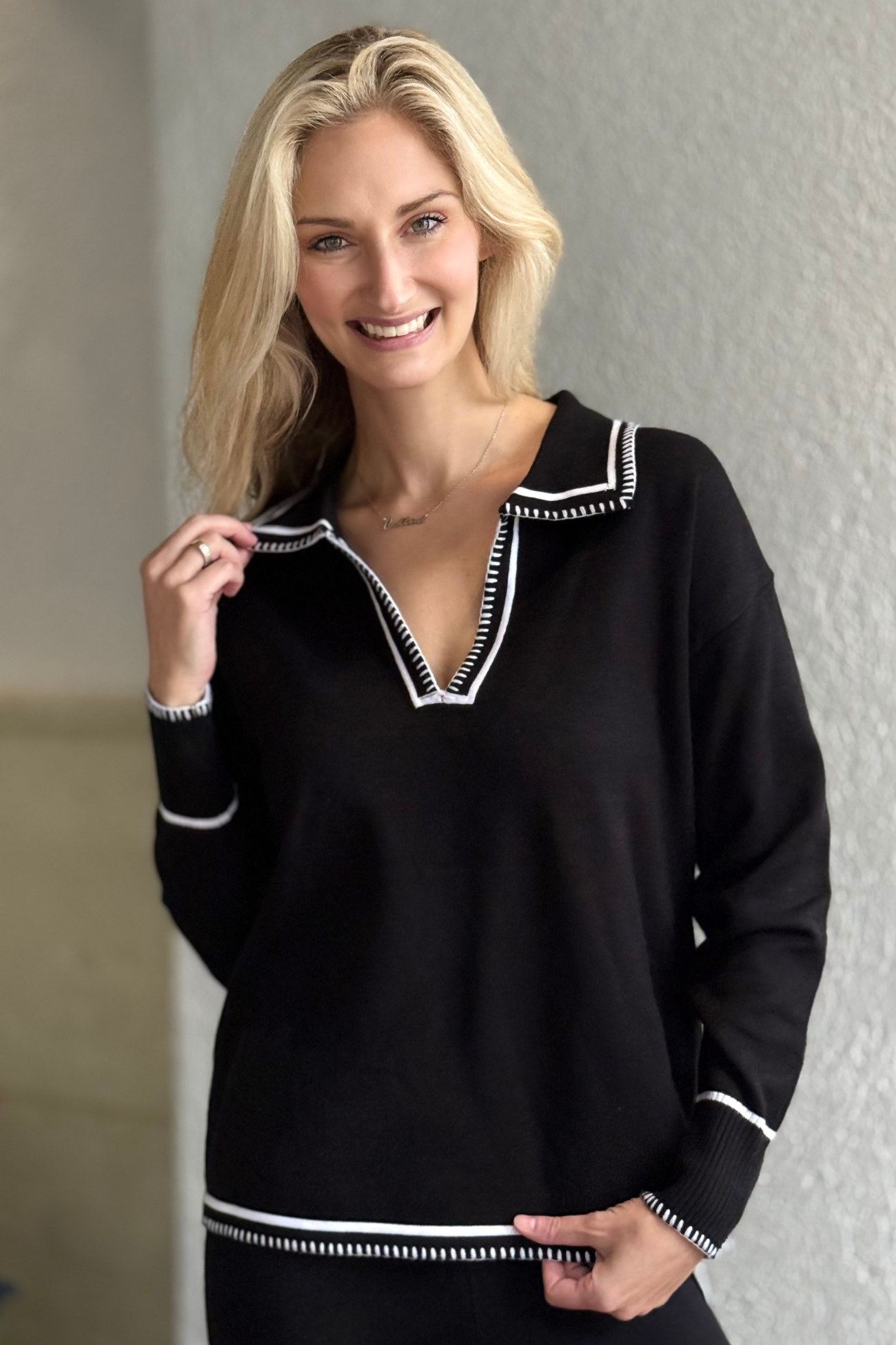 The Six Fifty Kellie Contrast Stitch Top blends modern comfort with timeless style. Designed in a soft black knit, this top features crisp white stitching along the collar, cuffs, and hem for a touch of playful detail. The v-neckline with a relaxed collar adds a flattering, effortless look that transitions from casual days to polished evenings. Pair it with the matching Kellie Pant for an instantly elevated set that’s as cozy as it is chic.