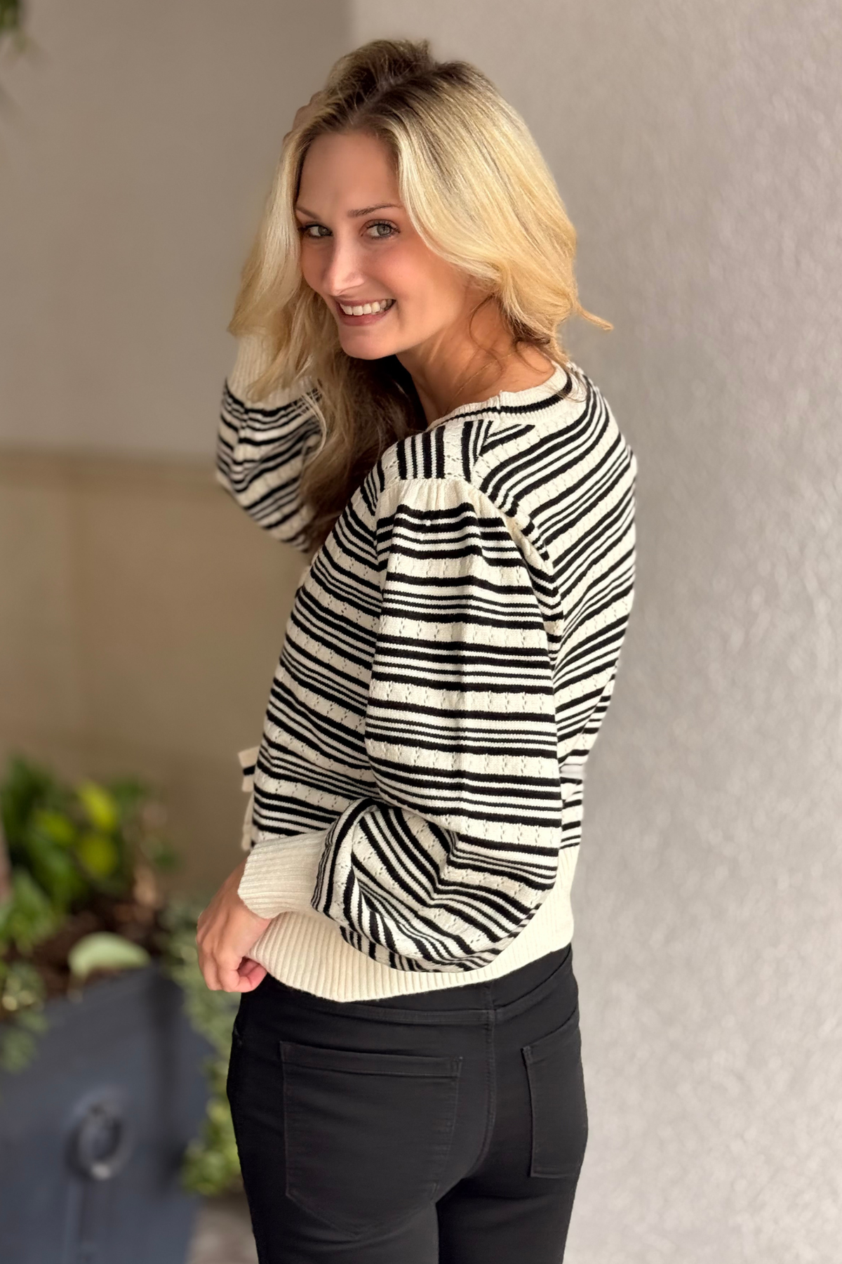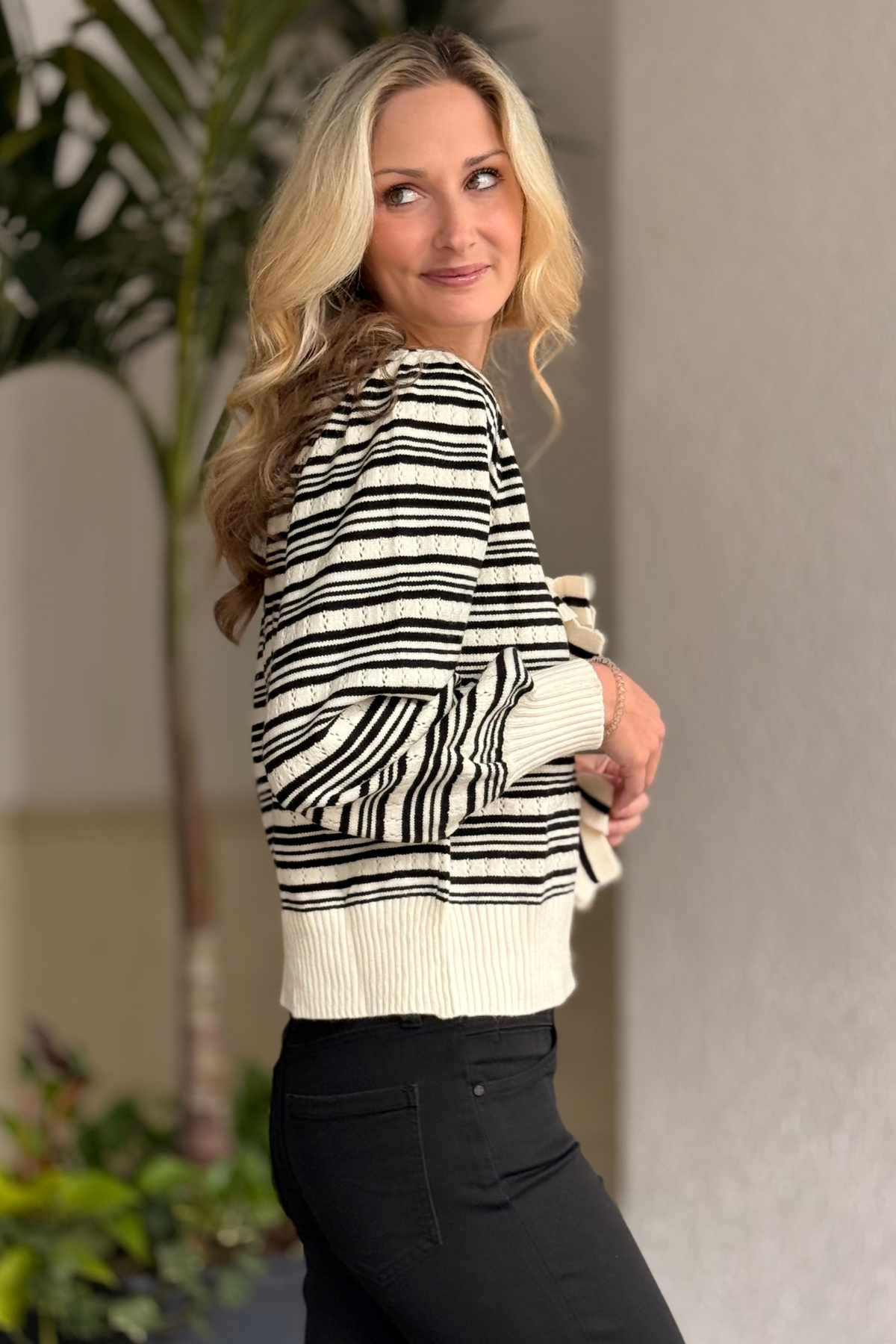 Make the season extra sweet with The Holiday Bow Stripe Sweater – Black. This charming V-neck knit features a classic black and cream stripe design accented with adorable front bows for the perfect festive touch. Soft, cozy, and effortlessly feminine, it’s a holiday must-have for parties, family photos, or adding a little merry magic to your everyday look. A relaxed fit and comfortable knit blend make it a piece you’ll reach for all season long.