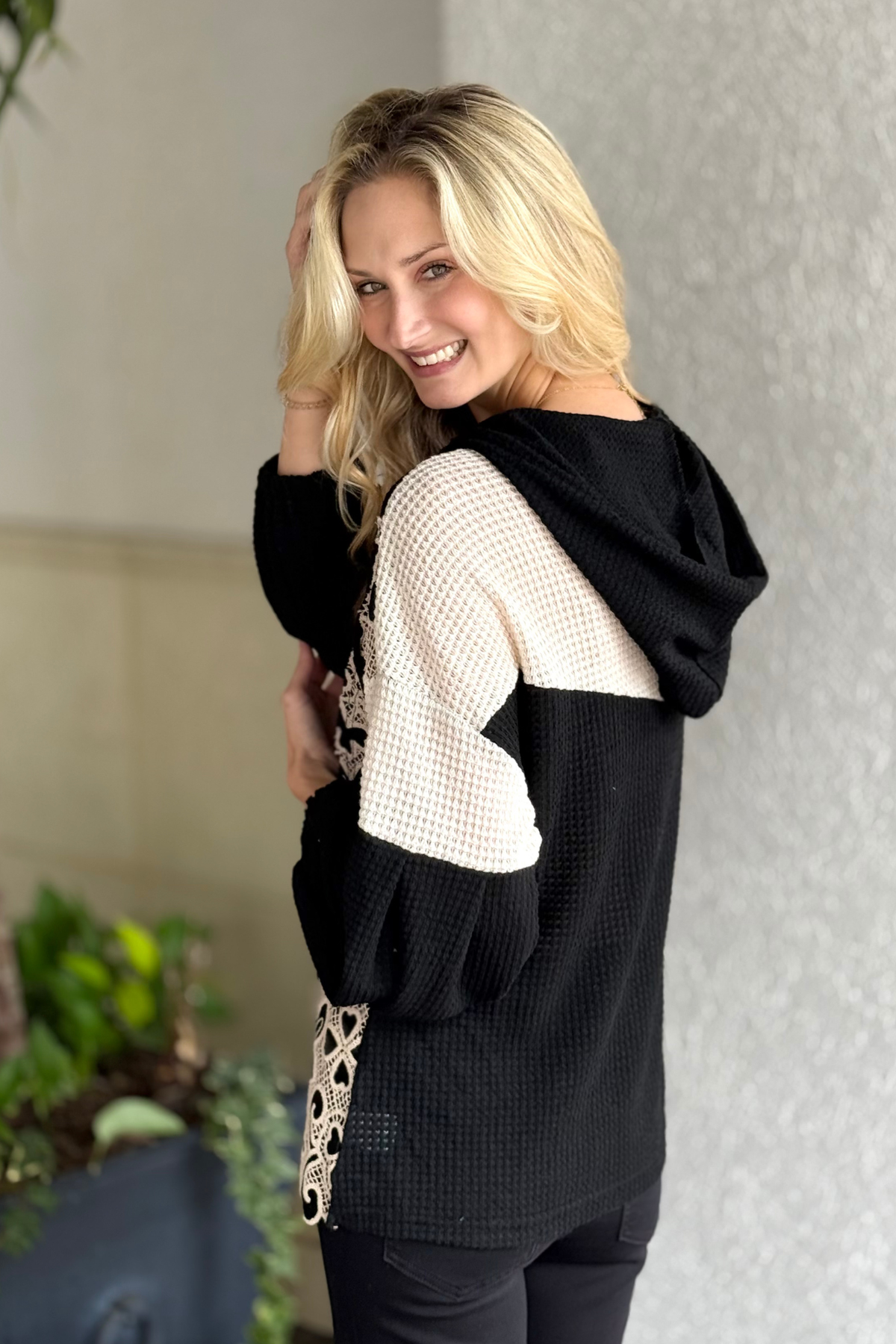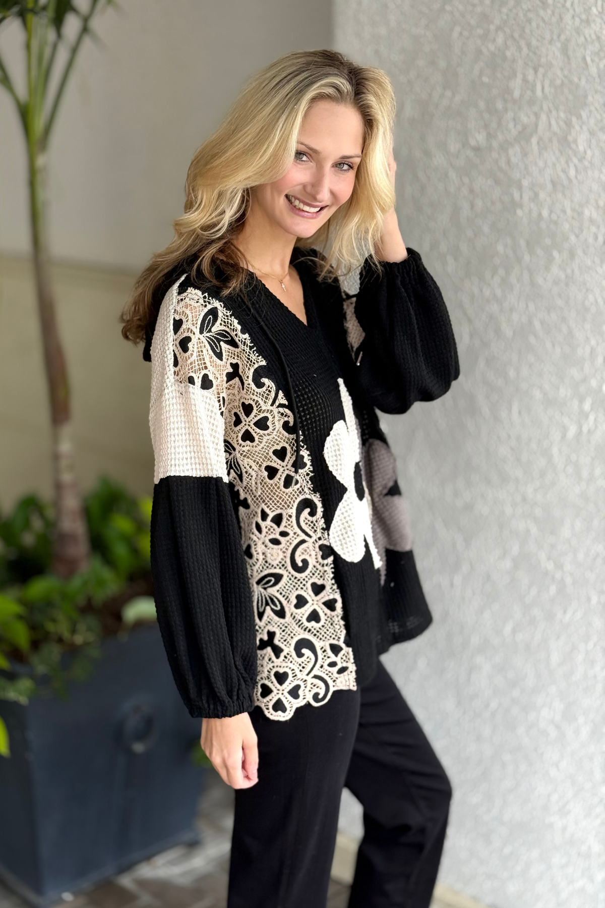 Cozy meets artsy in The Meadow Bloom Lace Patch Hoodie. Designed in a soft waffle knit, this oversized hoodie features statement flower appliqués and intricate crochet lace panels for a bold, boho-inspired look. The relaxed fit, balloon sleeves, and drawstring hood make it the perfect blend of comfort and standout style. Pair it with the matching pants for the cutest coordinated set.