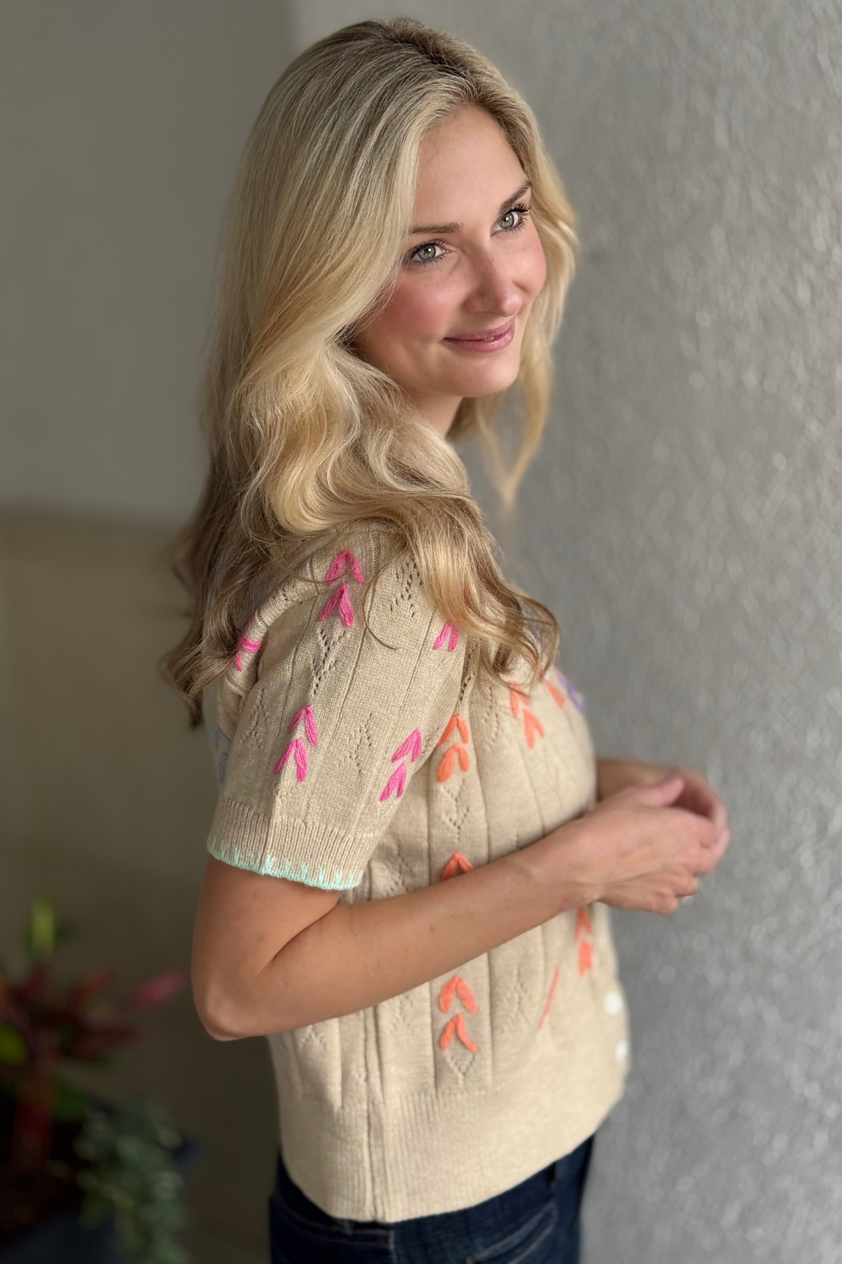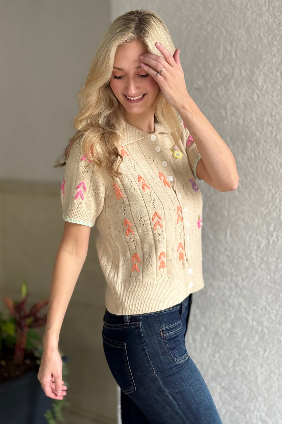 Effortlessly chic and full of charm, The Meadow Stitch Sweater is a statement knit that brings artistry to everyday style. Crafted from a lightweight pointelle fabric, this short sleeve button down features colorful hand-stitched embroidery that pops beautifully against its soft neutral base. The collared neckline with blanket stitch trim and twisted button placket add a touch of vintage flair, while the semi-cropped fit pairs perfectly with high-rise denim or skirts. Feminine, fun, and unmistakably unique—this piece is pure boutique perfection.