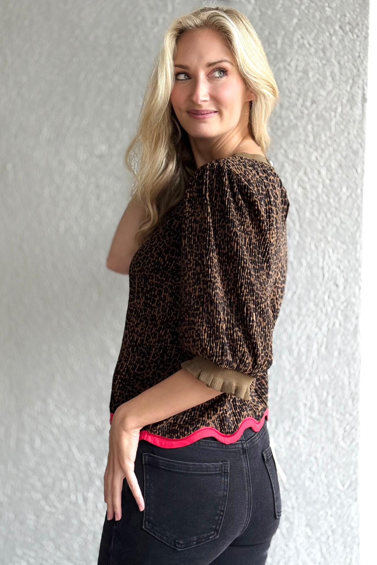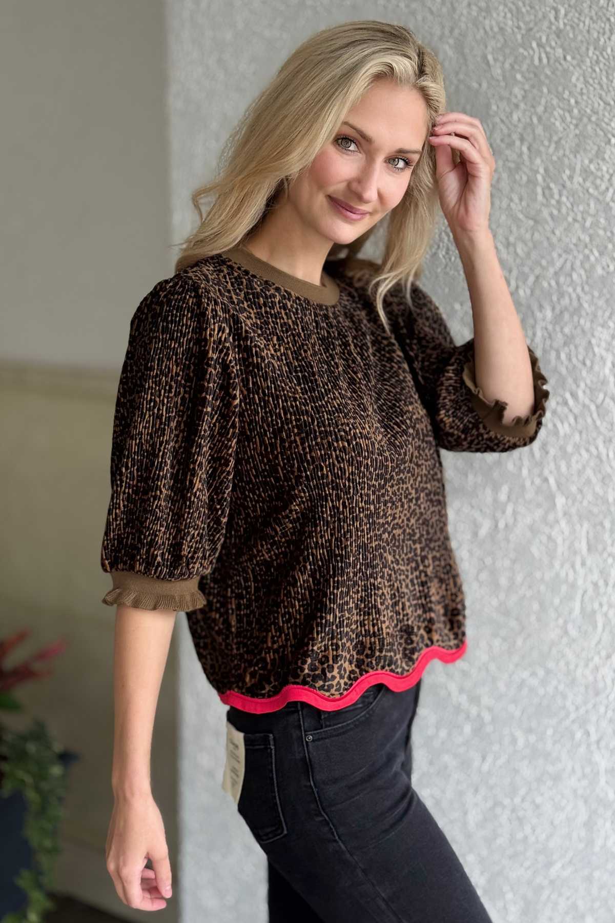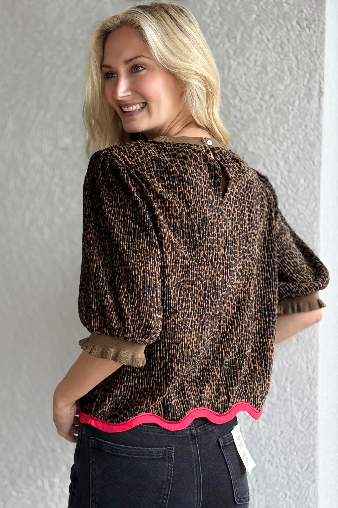 Make a statement with the Velvet Wild Waves Top, where playful texture meets bold contrast. Crafted from a ribbed velvet animal print fabric, this top features a flattering round neckline, short puff sleeves, and elastic banded cuffs for a comfortable yet polished fit. The standout detail—a vibrant wavy red hem—adds a pop of personality to this chic design. Whether dressed up with sleek black denim or paired with a skirt for a night out, this top brings effortless flair to any look. Finished with a back button-and-loop closure and soft, touchable texture, it’s the perfect mix of fun and sophistication.