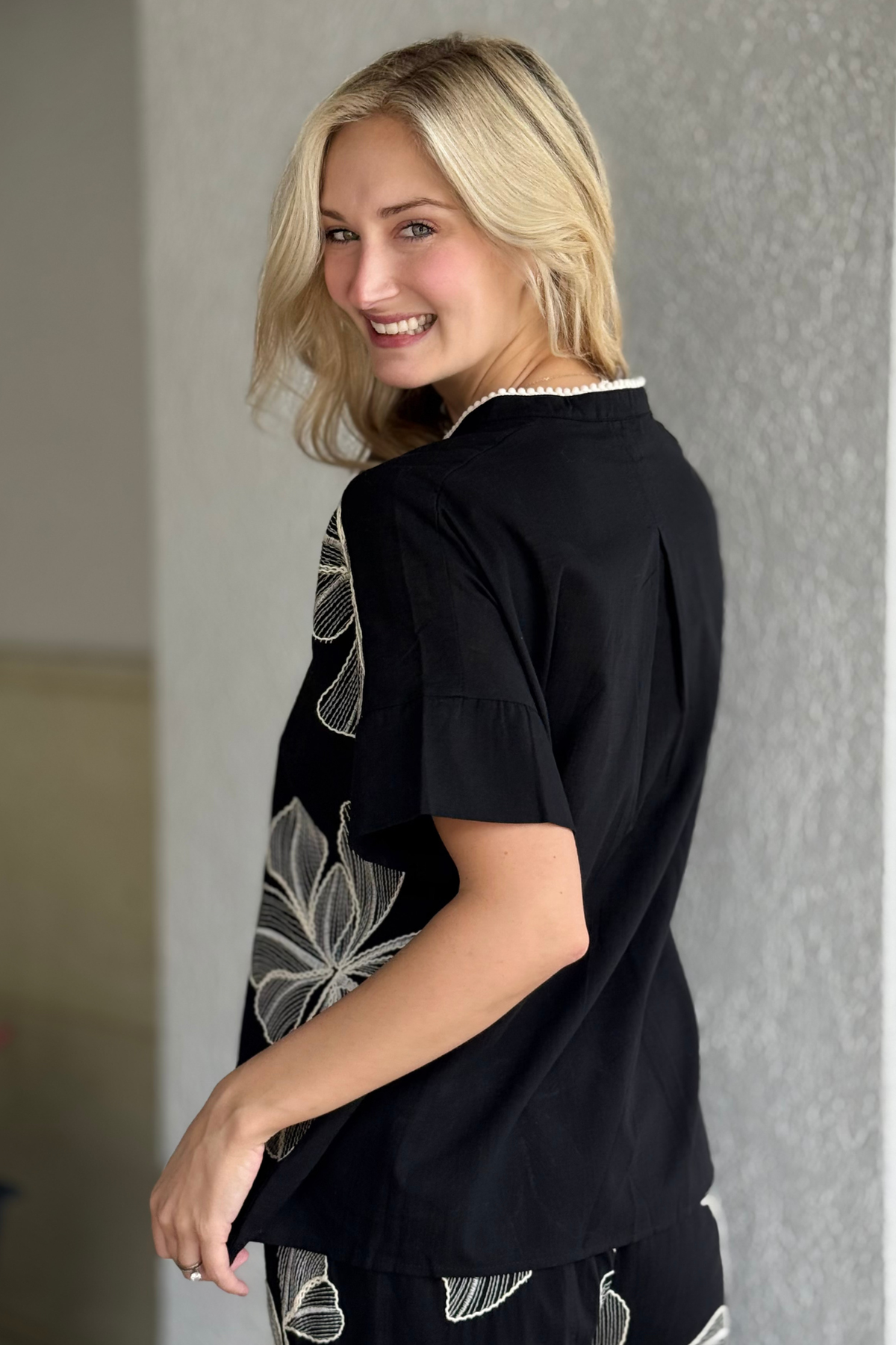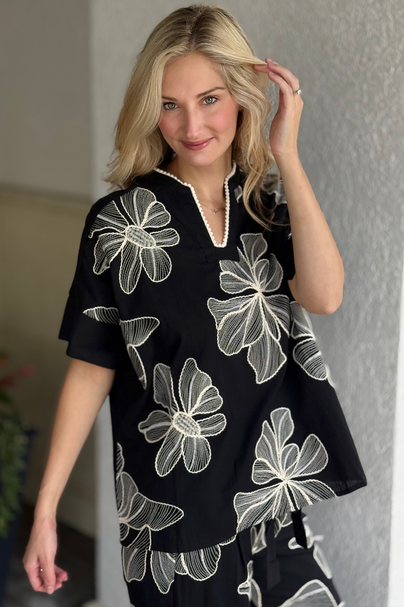 Bring effortless sophistication to your look with the Vineyard Petal Embroidered Popover Top. Crafted from a lightweight woven fabric, this black top features bold ivory floral embroidery that adds texture and charm. The split neckline is trimmed with delicate contrast edging, while the relaxed silhouette and short cuffed sleeves make it perfect for all-day comfort. Pair it with our matching Vineyard Petal Embroidered Pants for a chic, coordinated set or style it with your favorite denim for a polished casual outfit.