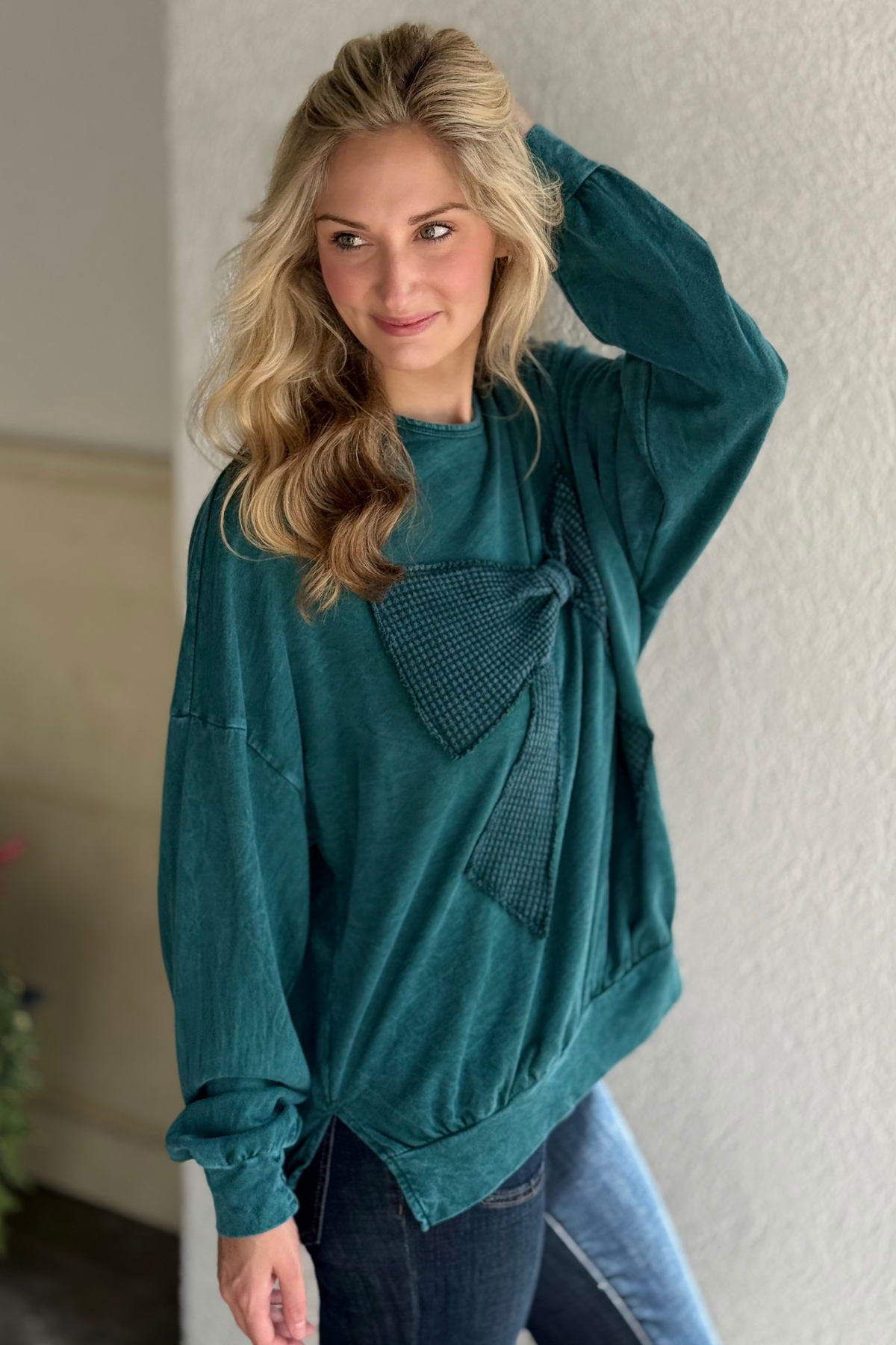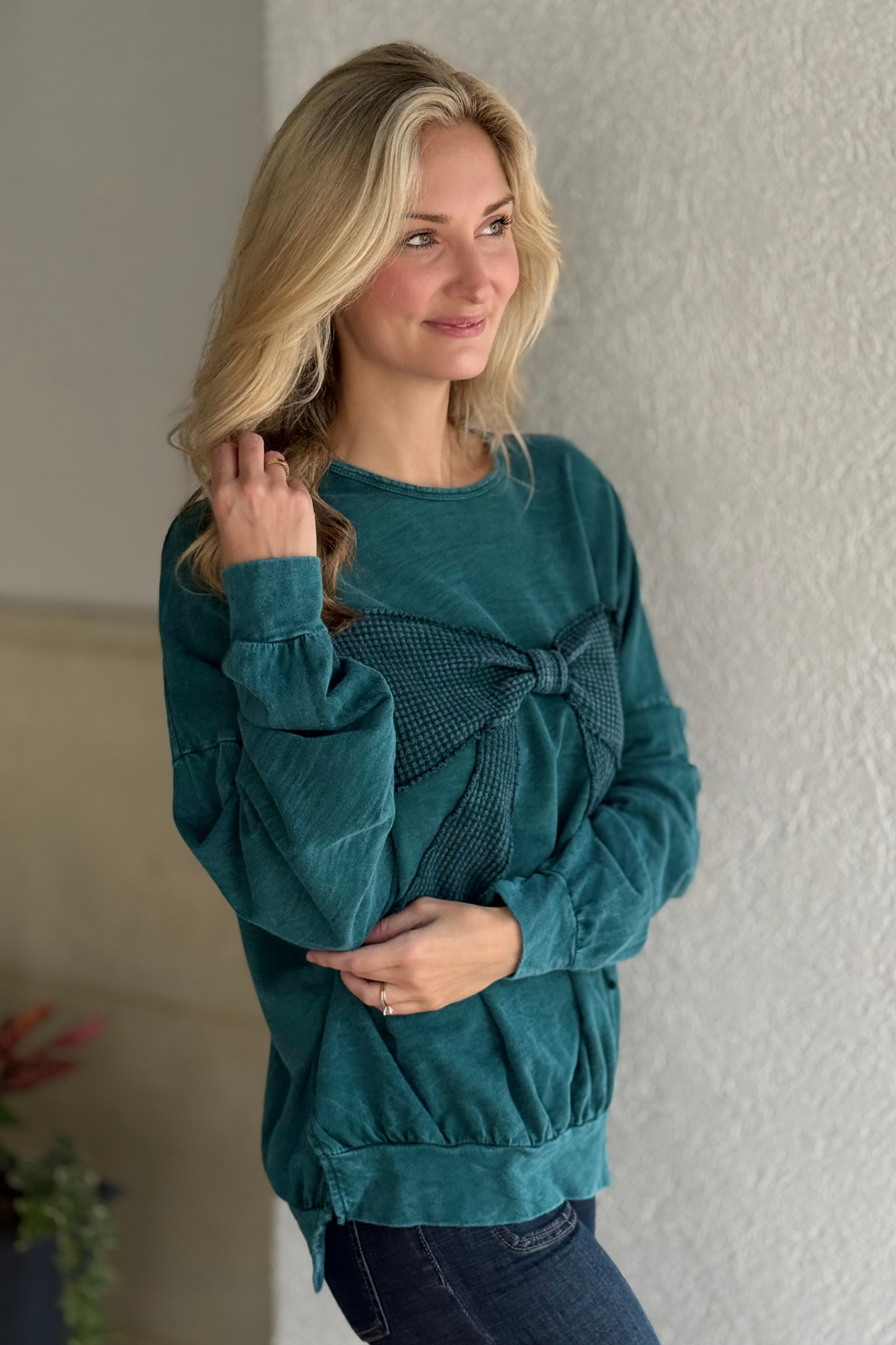Waffle Bow Terry Sweatshirt in Midnight Green