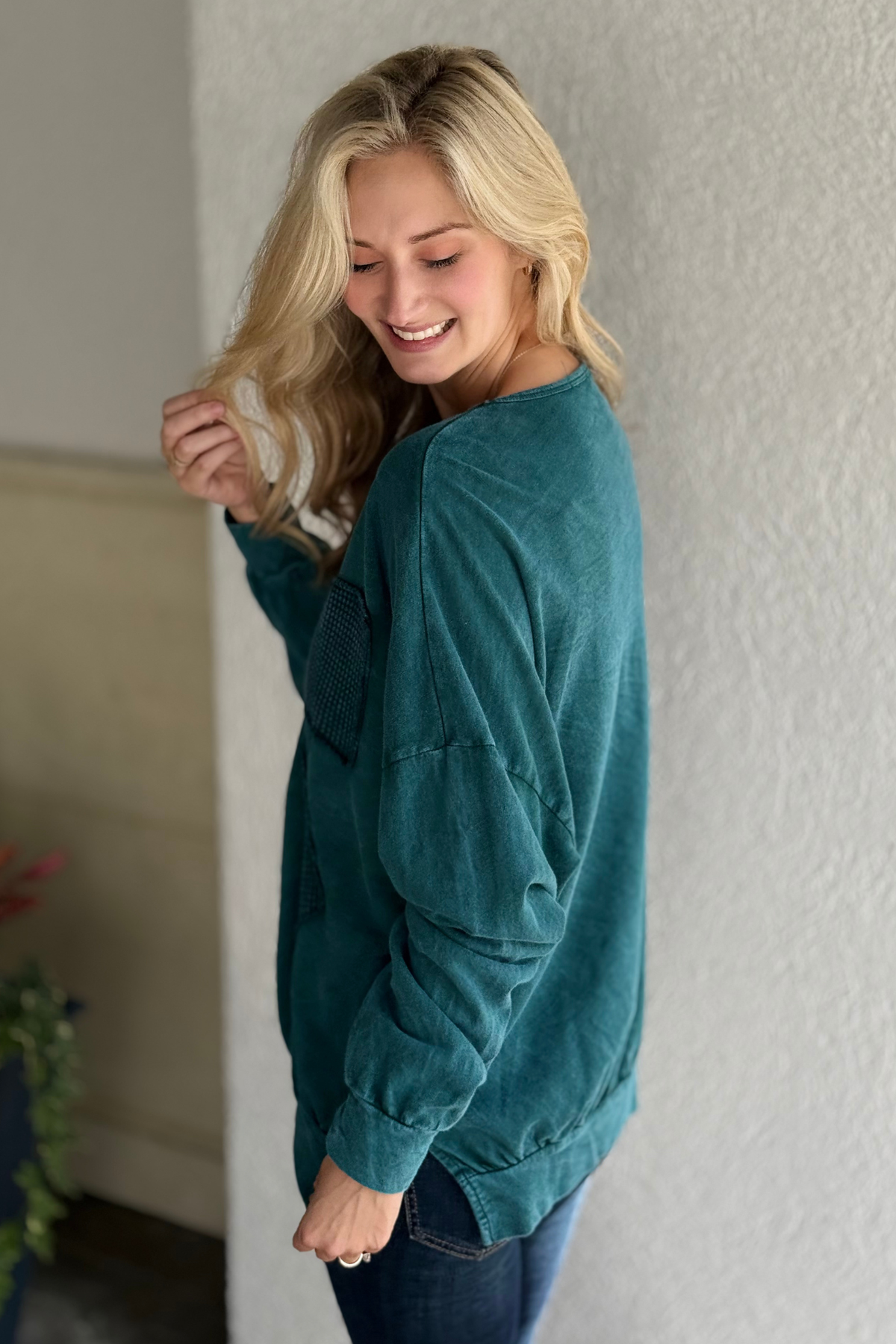 Effortlessly cozy with a playful twist, the Waffle Bow Terry Sweatshirt adds a touch of charm to your casual wardrobe. This soft, mineral-washed terry top features an oversized fit, drop shoulders, and a statement waffle knit bow across the chest — the perfect blend of comfort and style. Designed for easy everyday wear, it pairs beautifully with your favorite jeans or leggings for a relaxed yet polished look. Whether you choose the rich Eggplant hue or deep Midnight Green, this sweet sweatshirt makes the ultimate gift-ready piece or a treat for yourself.
