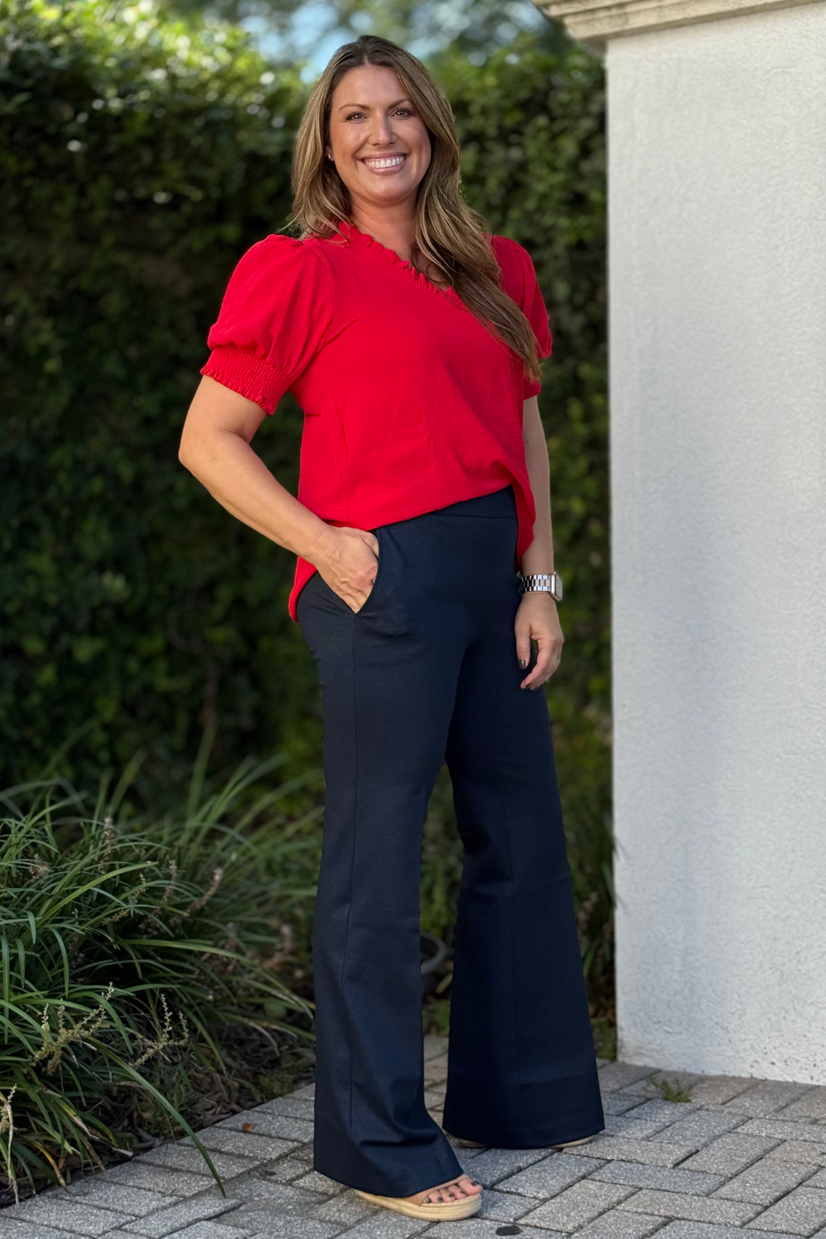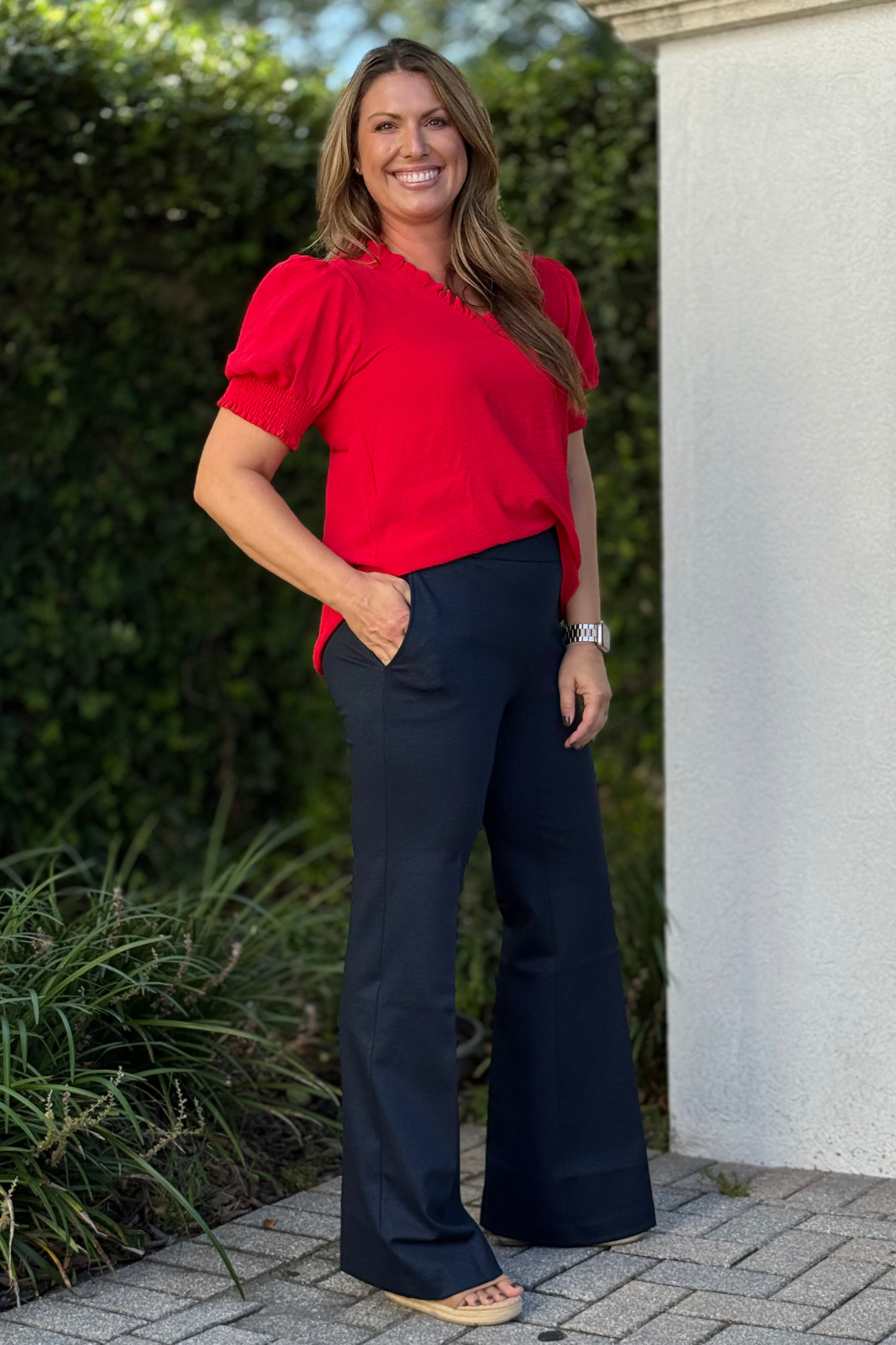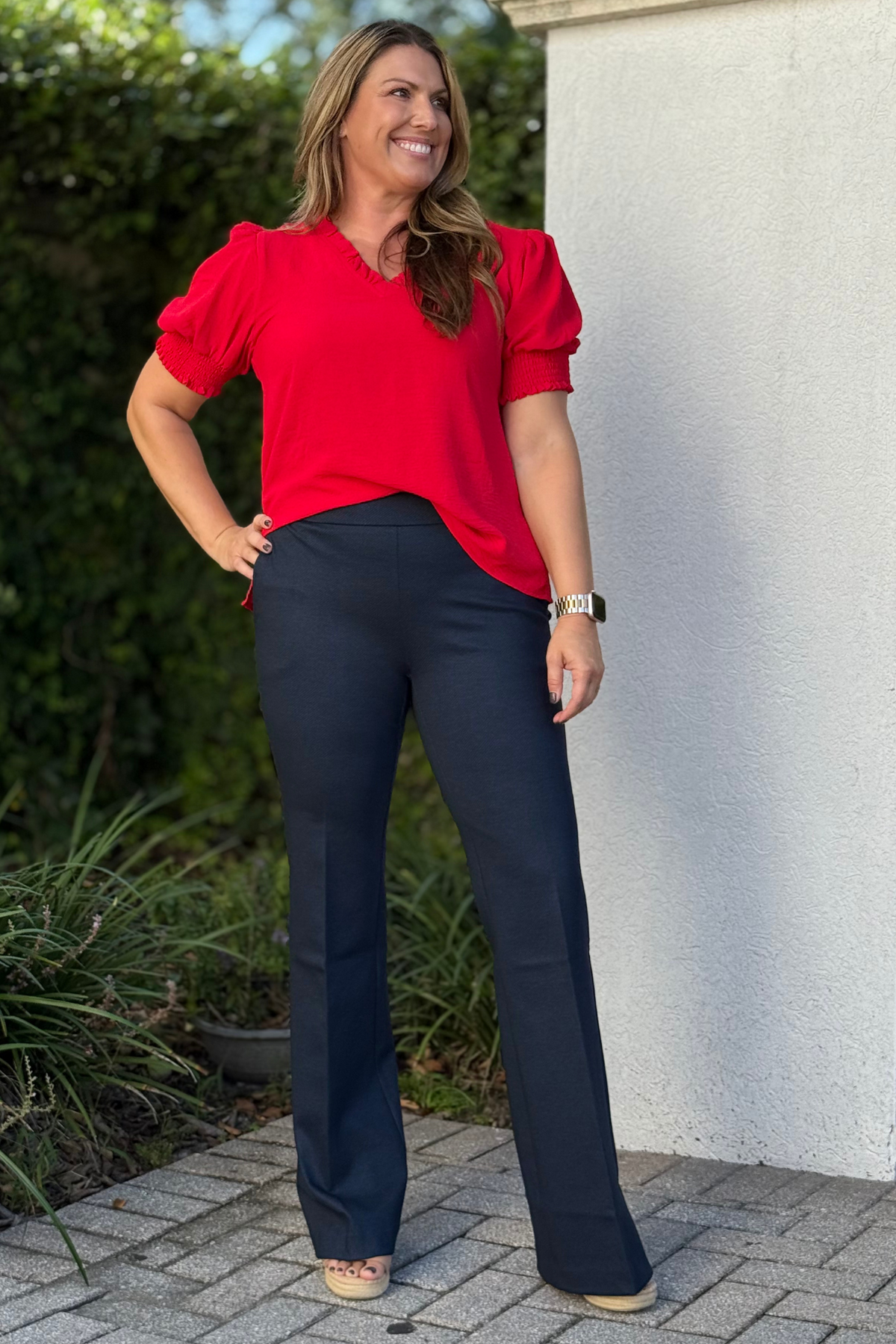 Step into effortless comfort with the Renuar Bounce Knit Flare Pants in Navy Nights. Crafted from a soft blend of rayon, nylon, and spandex, these pull-on pants feature a flattering elastic waistband that moves with you all day. The flared leg and generous 23” opening create a sleek silhouette while side pockets keep your essentials close. Whether paired with sneakers or heels, these knit pants bring playful polish to your everyday wardrobe.