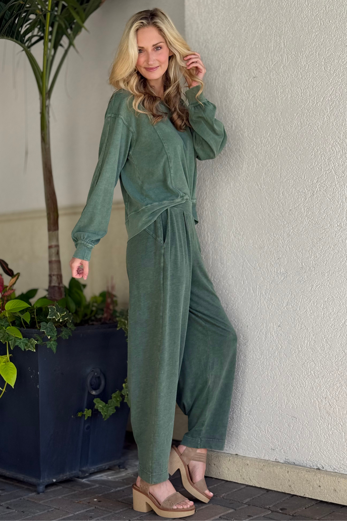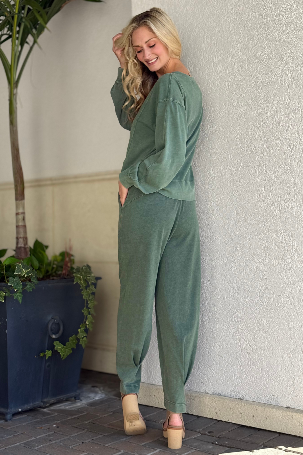 Elevate your everyday comfort with The Regency Green Slub Cotton Cocoon Joggers. Designed in the same soft, breathable slub cotton as our matching pullover, these joggers offer an effortless blend of ease and style. The cocoon-inspired silhouette delivers a relaxed, drapey fit through the legs, while the wide pull-on waistband provides all-day comfort. Side pockets add practicality, and the tapered hem keeps the look polished. Whether you're lounging, running errands, or styling a coordinated set, these joggers bring a chic, laid-back vibe to your wardrobe in the beautiful Regency Green hue.