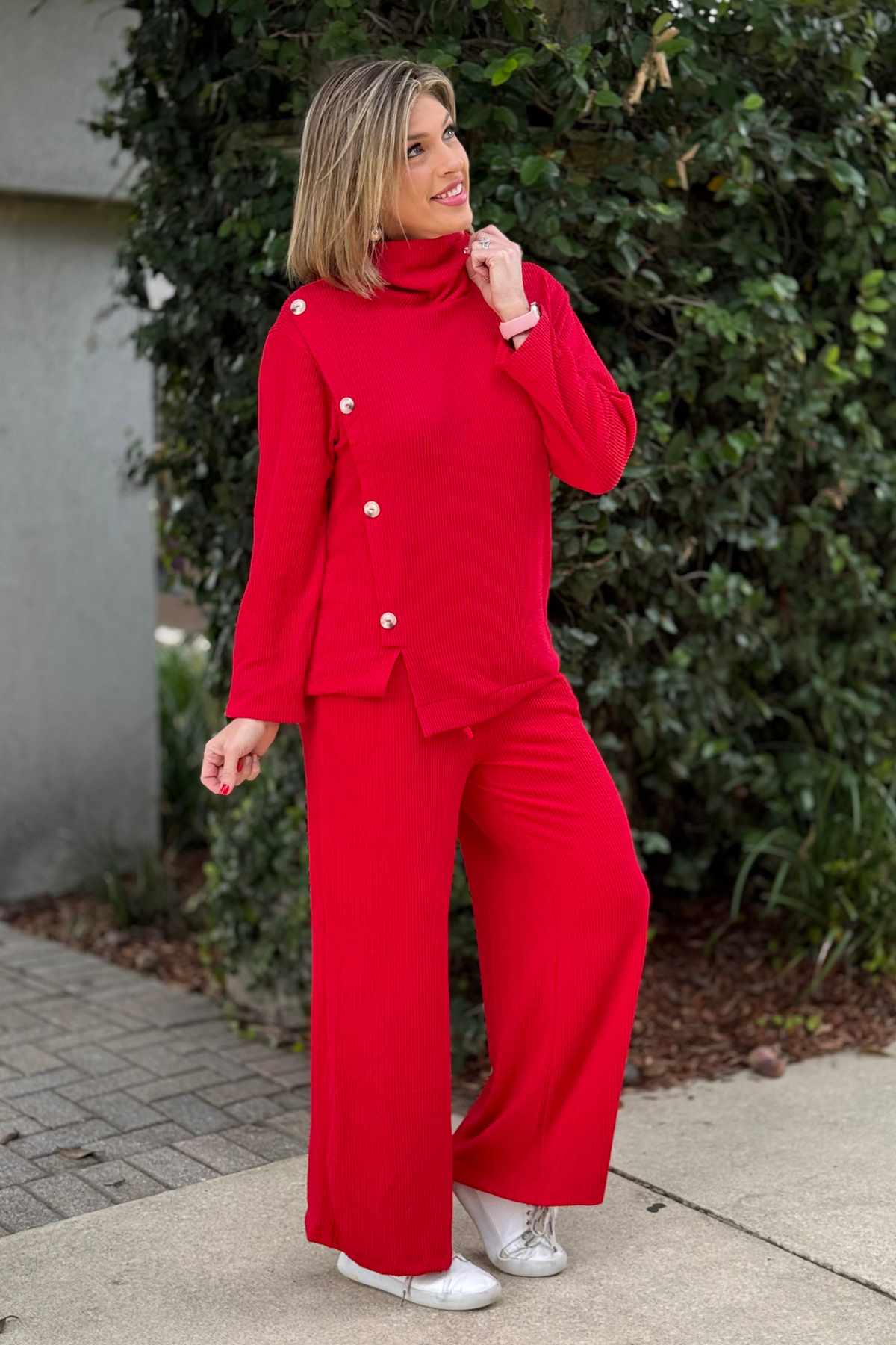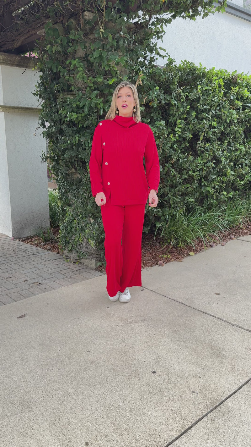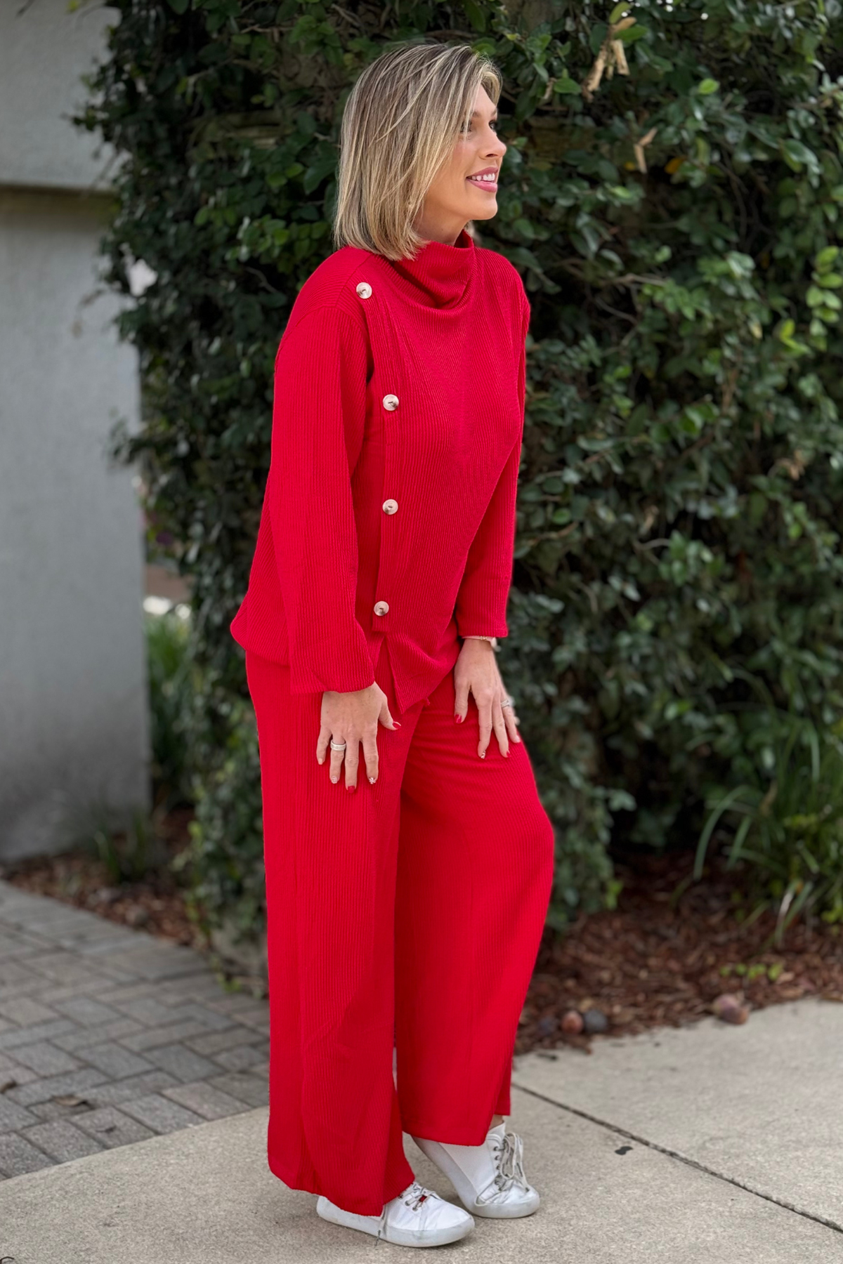 Wrap yourself in effortless luxury with The Lavish Lounge Rib Set – Red. This ultra-soft two-piece ribbed set features a chic cowl-neck tunic with eye-catching button details and a relaxed, flowy silhouette. Designed for comfort without sacrificing style, the matching elastic-waist pants offer easy movement and an elevated lounge look you can wear anywhere.