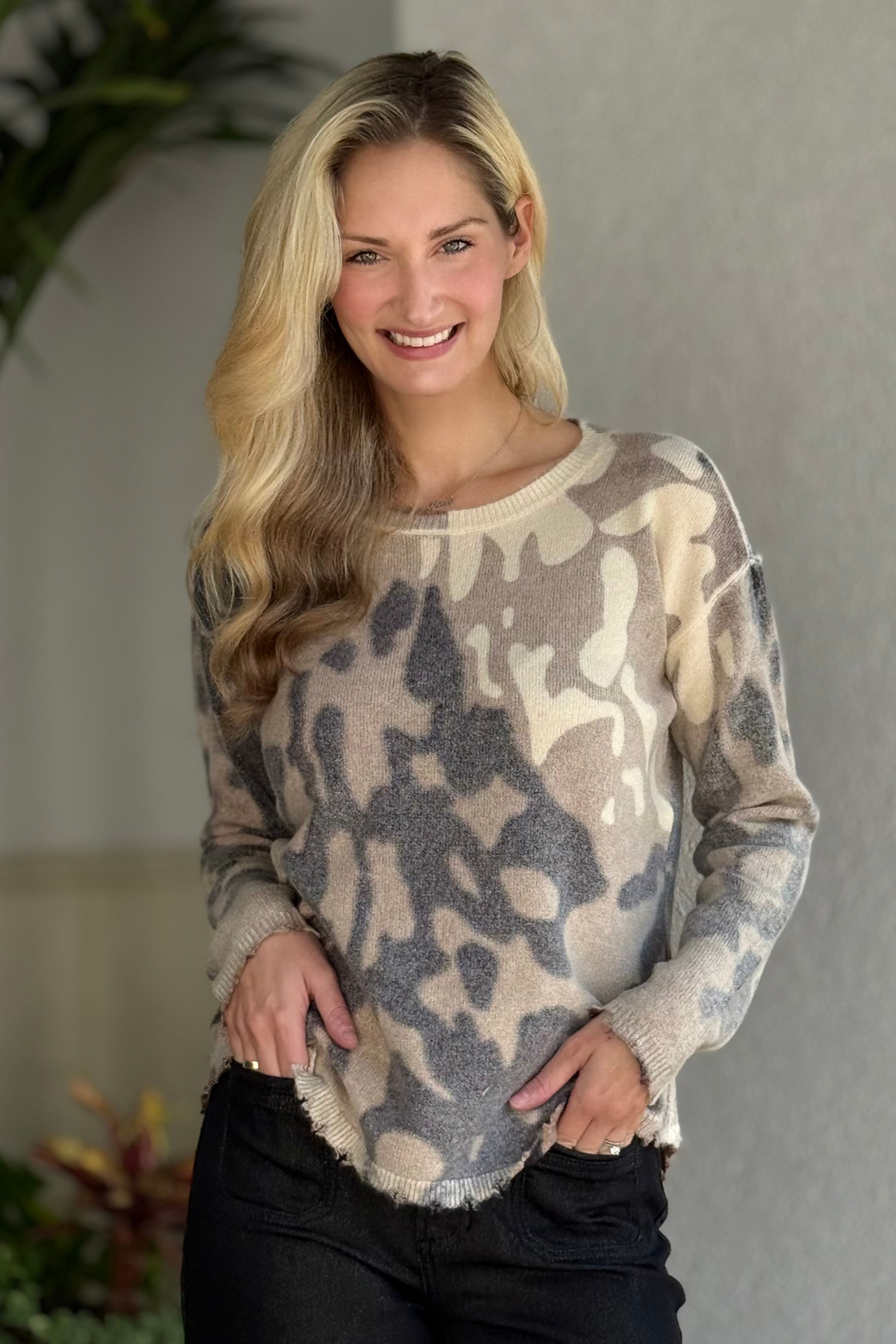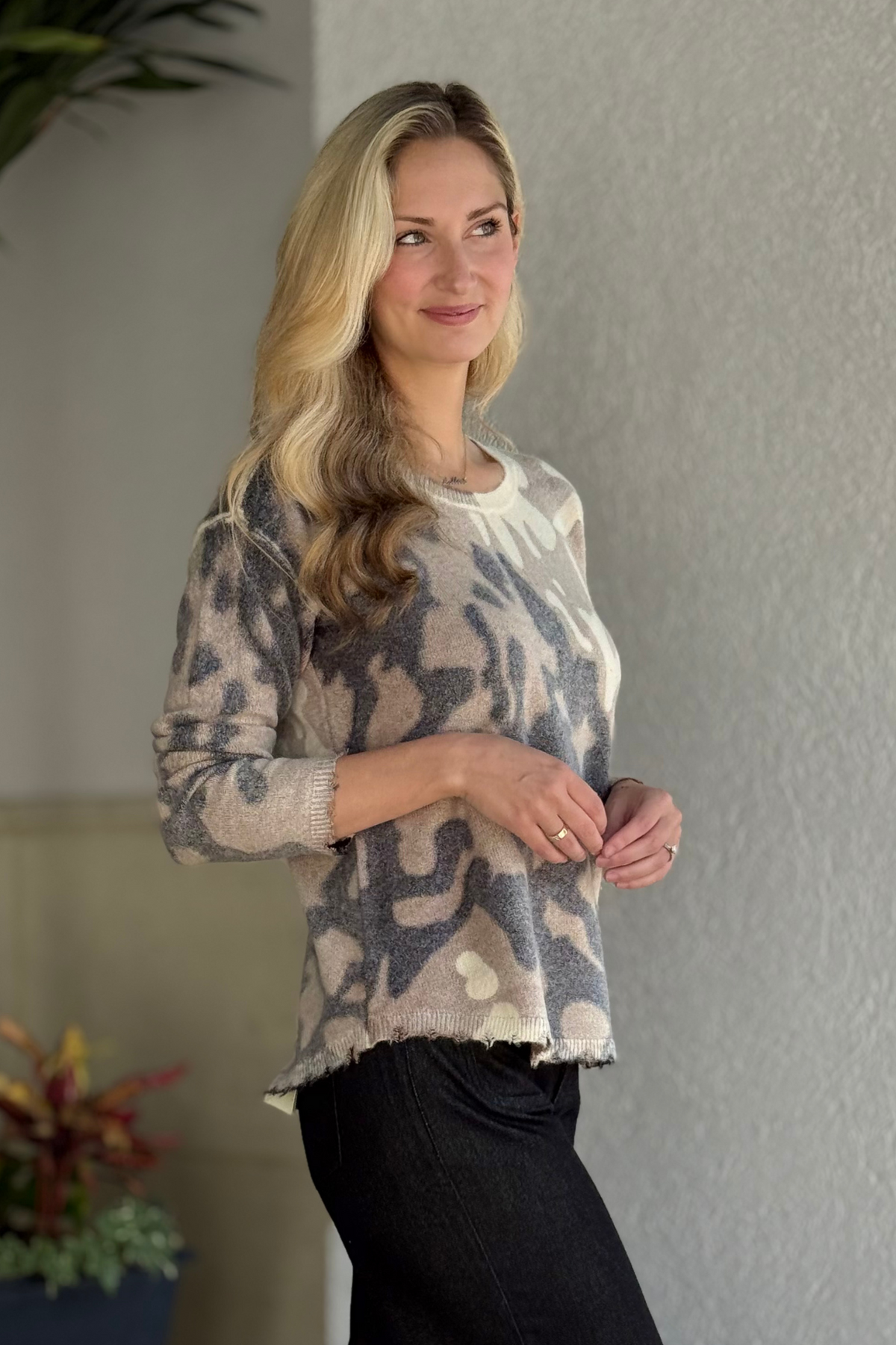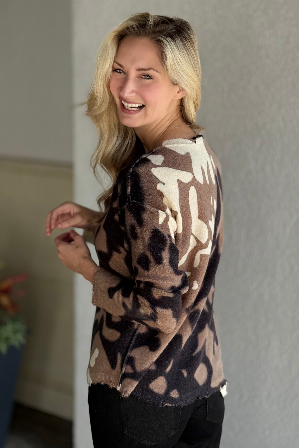 Charlie B Reversible Printed Plush Sweater with Frayed Edge in Spots