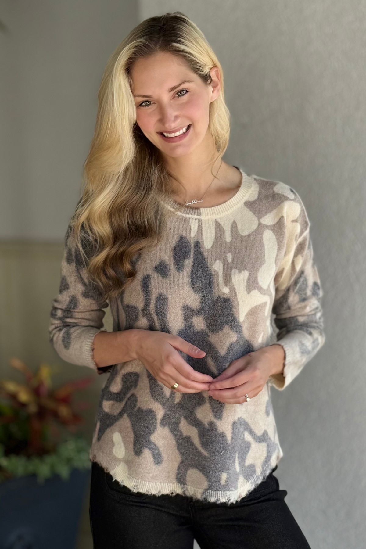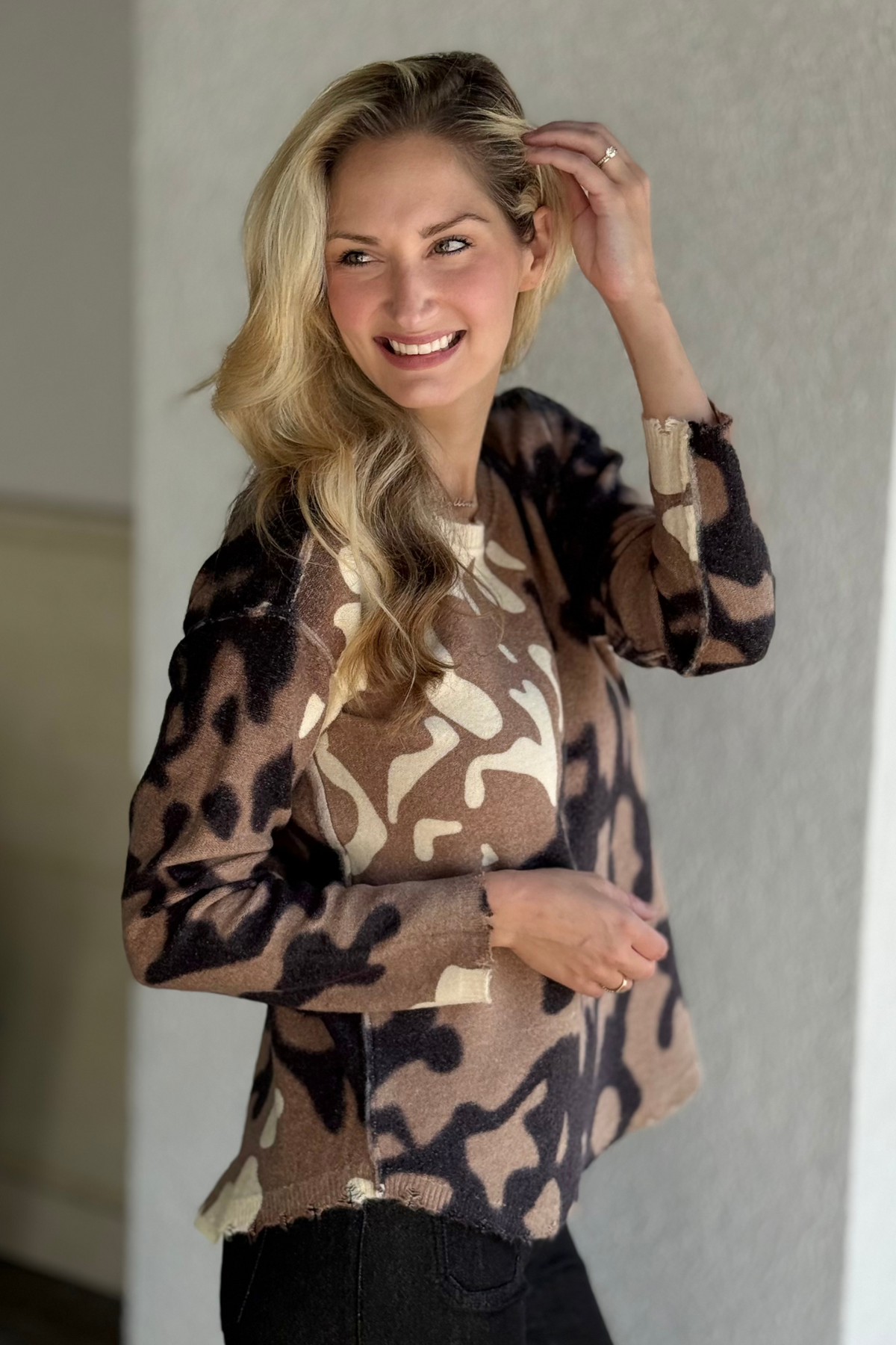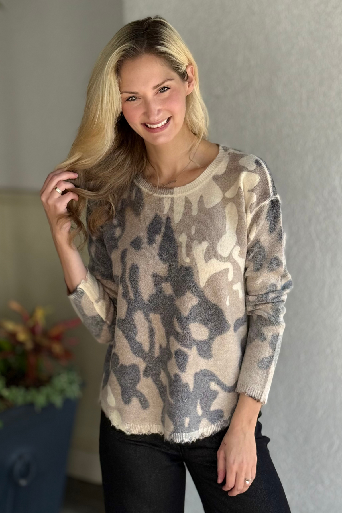 Charlie B Reversible Printed Plush Sweater with Frayed Edge in Spots