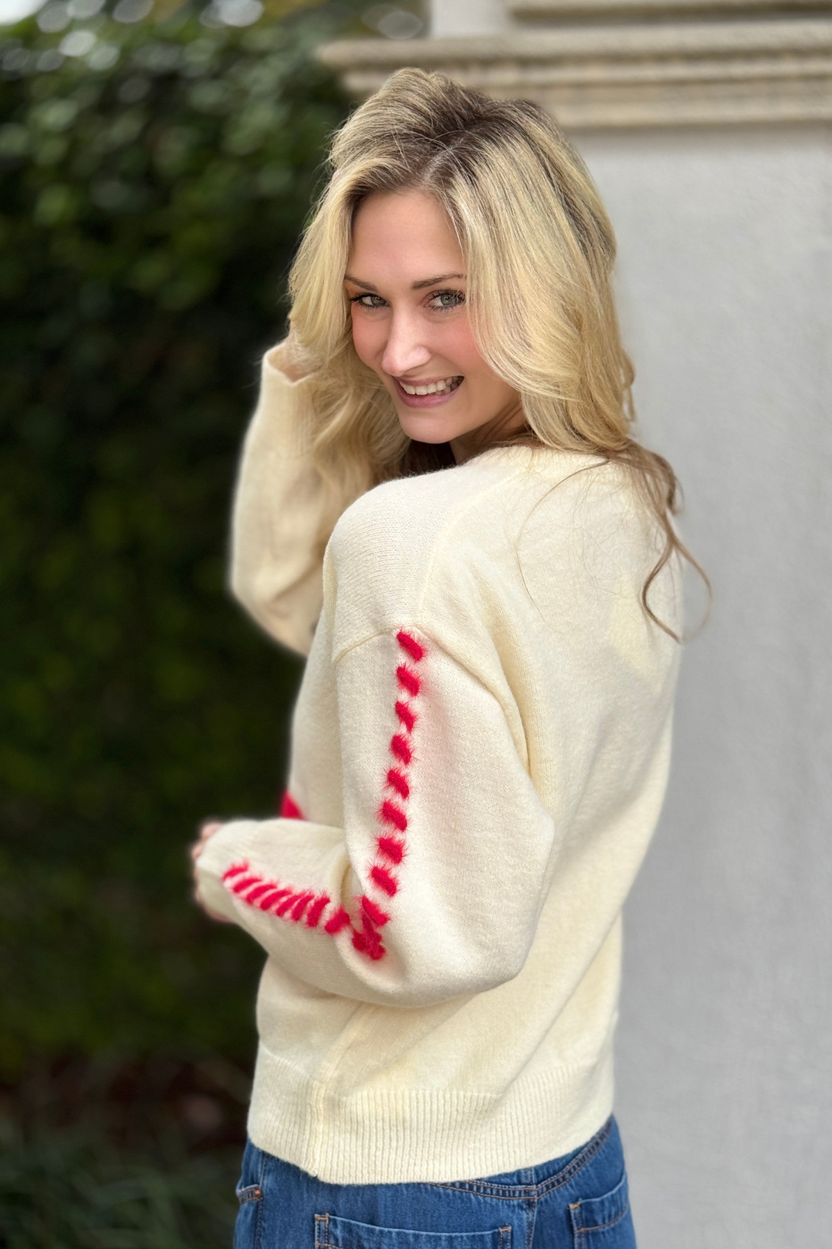 Fall head over heels for cozy charm with the Stitched With Love Fuzzy Heart Knit Sweater. Designed with a relaxed, waist-length fit, this sweater features a ribbed round neckline, drop shoulder long sleeves, and ribbed cuffs and hem for an effortlessly comfortable feel. Bold contrast fuzzy knit hearts bring playful personality, while the whip stitch detailing along the sleeves and body adds eye-catching texture and boutique-worthy charm. Soft to the touch and easy to style, this cozy knit pairs perfectly with denim for casual days, Valentine’s festivities, or anytime you want to wear your heart on your sleeve.