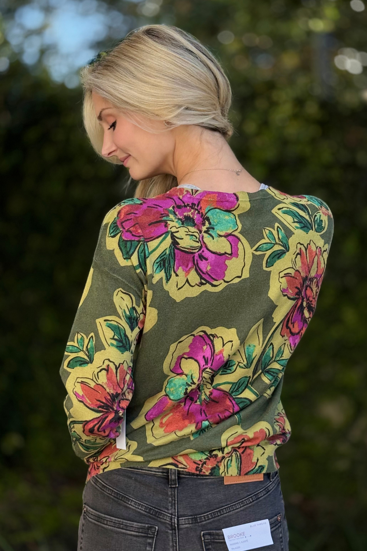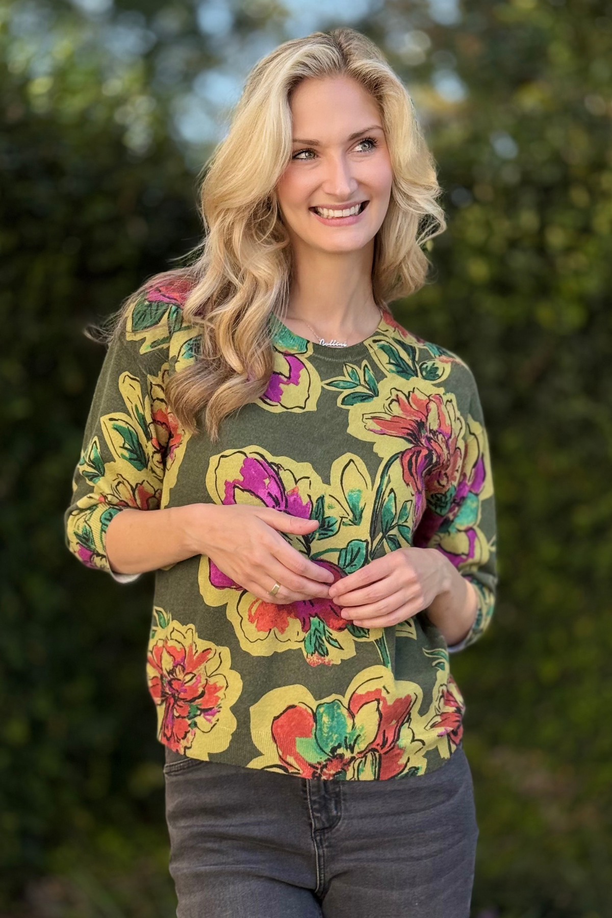 The TRIBAL Soft Yarn Three-Quarter Sleeve Crewneck Sweater delivers cozy comfort with an effortless, feminine touch. Designed in a soft yarn blend that feels as good as it looks, this relaxed crewneck features drop shoulders for ease of movement and a flattering drape. The all-over floral print brings a cheerful, elevated vibe to any outfit, while the three-quarter sleeves offer just the right amount of coverage for transitional weather. Perfect for pairing with jeans, trousers, or skirts, this sweater blends everyday comfort with chic, easygoing style—an instant favorite for your casual wardrobe.