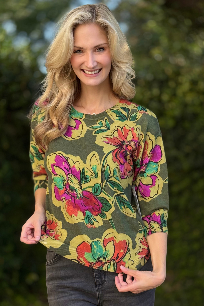 TRIBAL Soft Yarn Floral Crewneck Sweater – 3/4 Sleeve