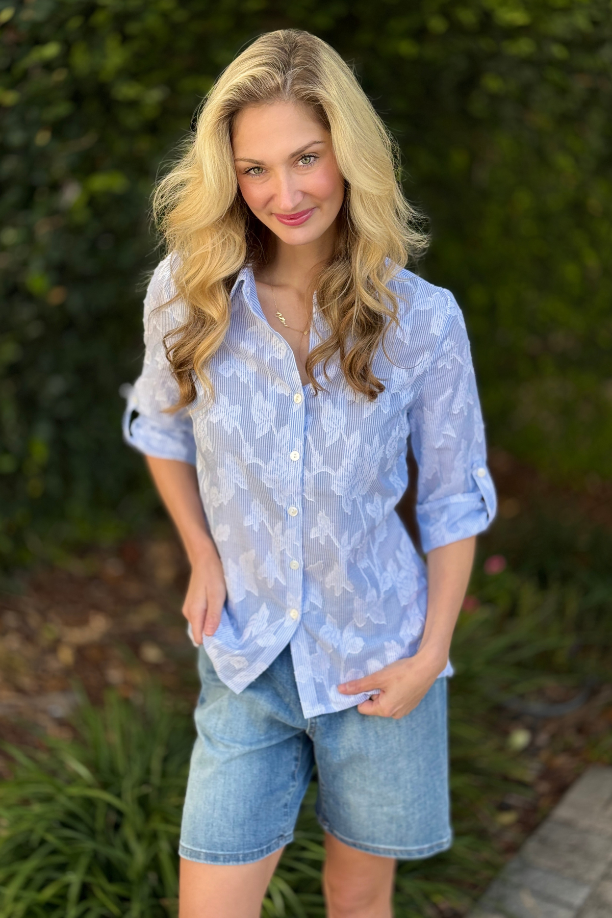 Charlie B Roll-Up Sleeve Embroidered Stripe Blouse