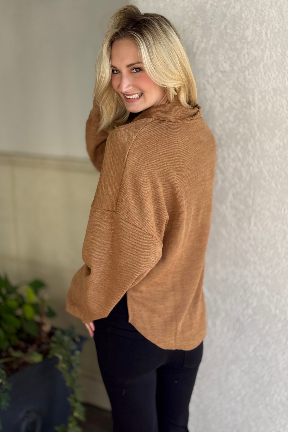 Effortless comfort meets elevated detail in The Carmel Ridge Raw Edge Collared Knit Top. Designed with a relaxed silhouette and extended shoulders, this soft knit gives you that easygoing, laid-back feel while still looking put together. The split neckline features chunky statement buttons for a touch of texture, while the raw-edge seams add a trend-forward finish. Perfect for everyday styling — pair it with denim, leggings, or your go-to joggers for a cozy, chic look. A versatile must-have for every season!