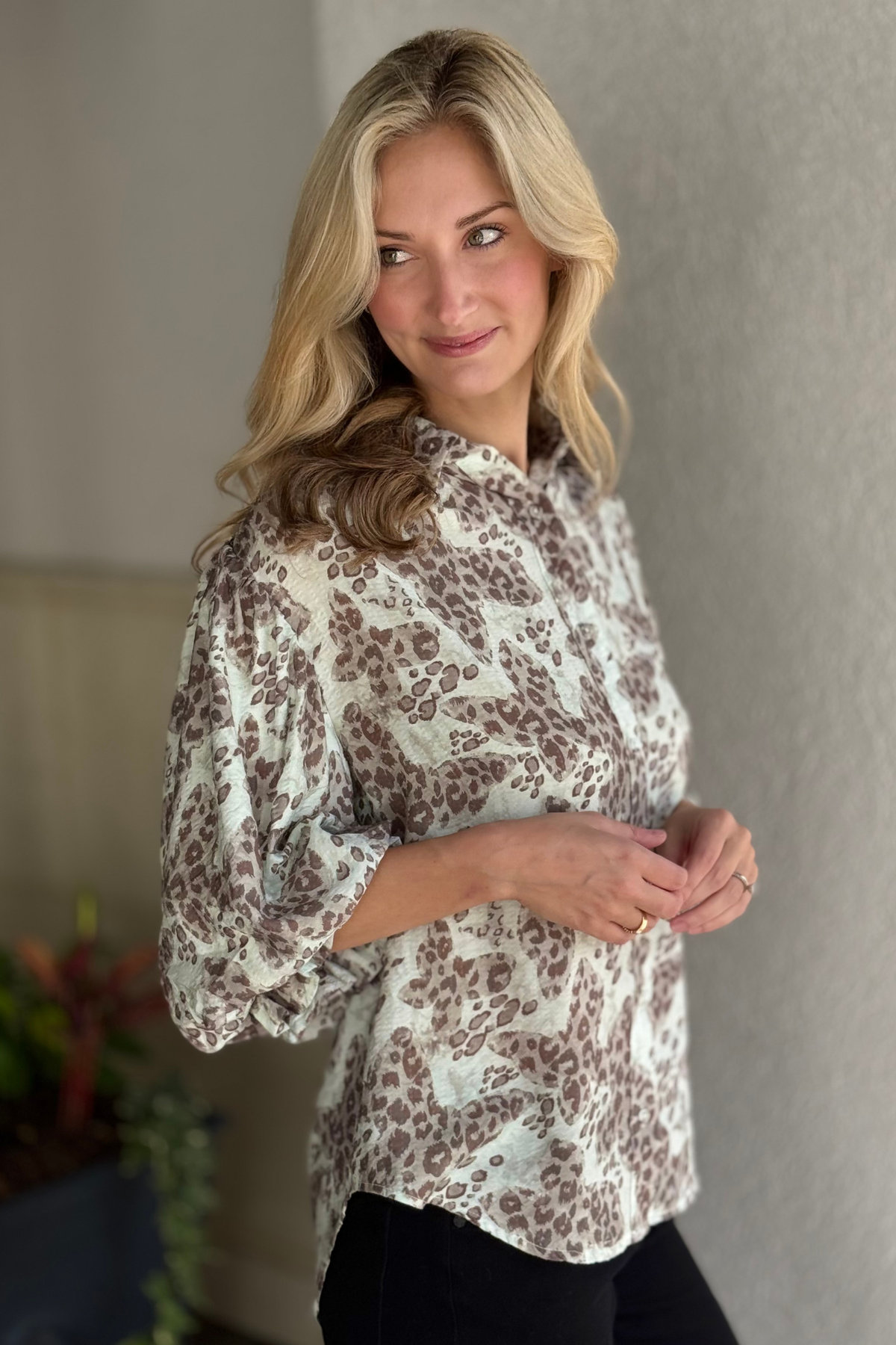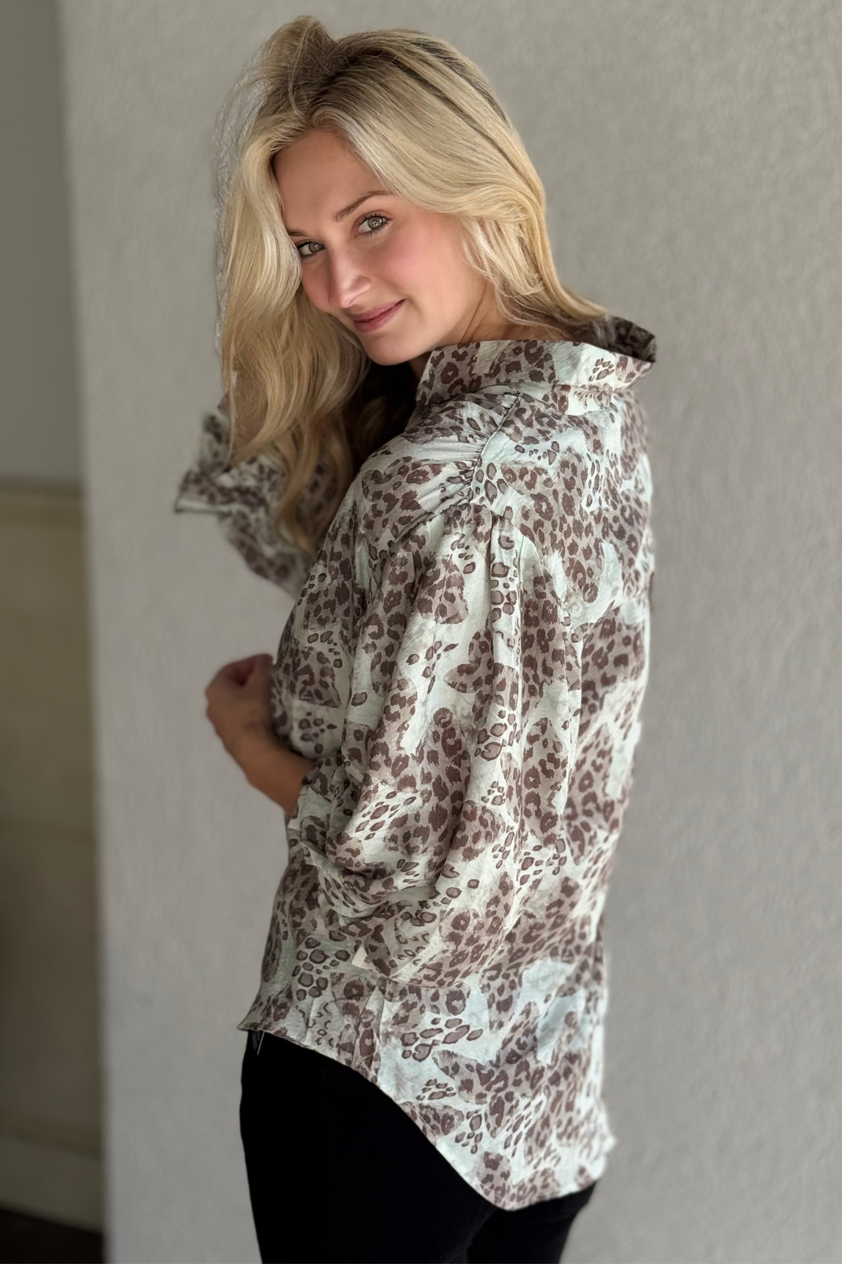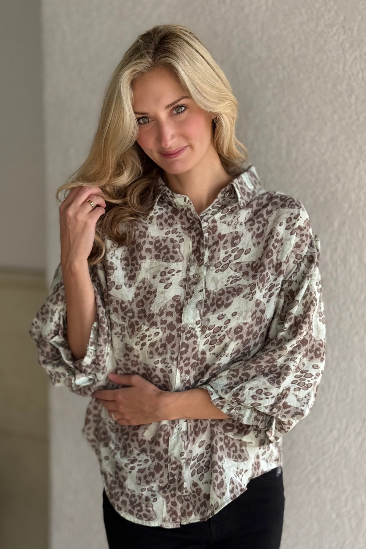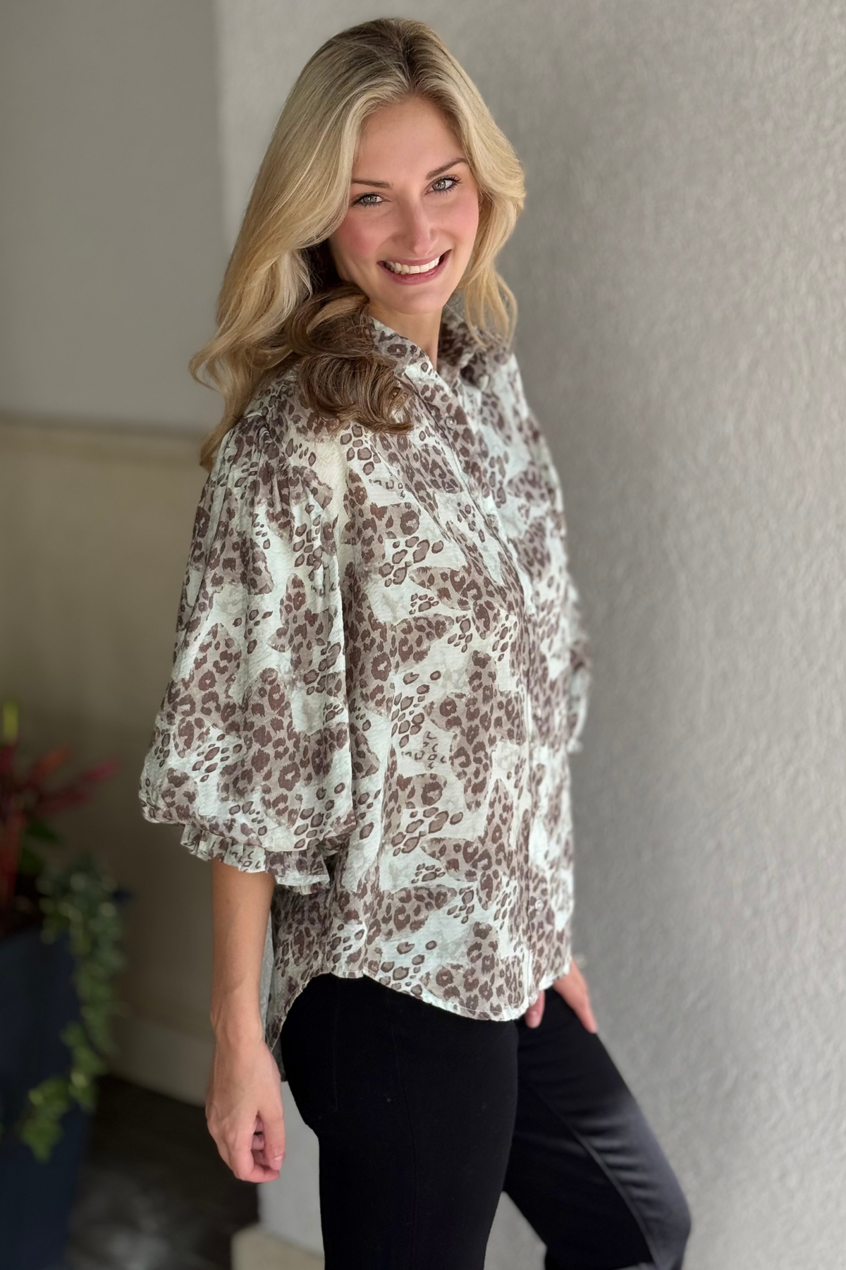 The Barely Wild Popover Top blends soft sophistication with a hint of untamed style. This relaxed button-down features a muted leopard print in earthy tones, giving it an effortlessly chic vibe. The 3/4 length gathered balloon sleeves add a touch of volume, while the lightweight woven fabric drapes beautifully for a flattering fit. Perfect for pairing with denim or dress pants, this top transitions seamlessly from casual days to polished evenings.