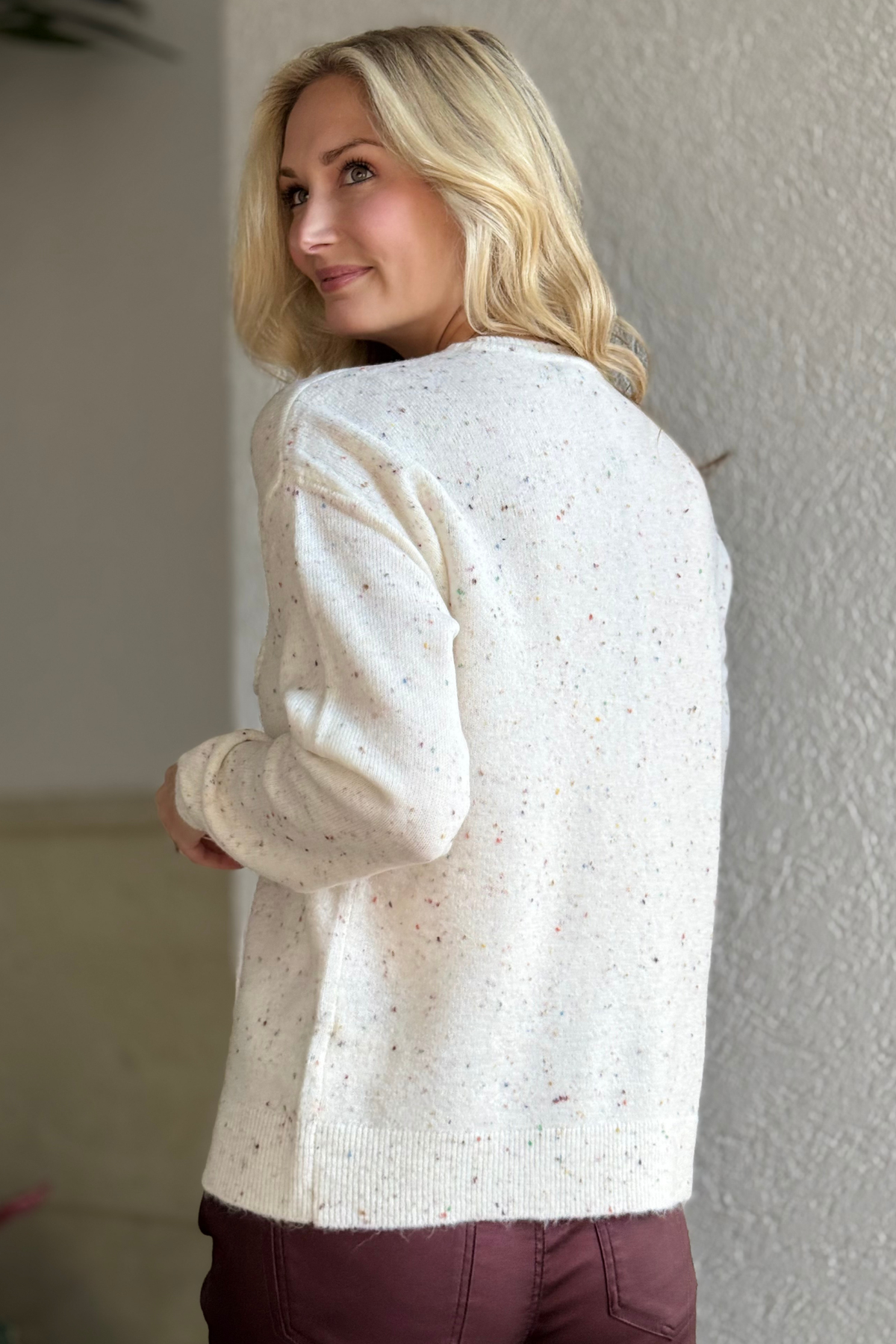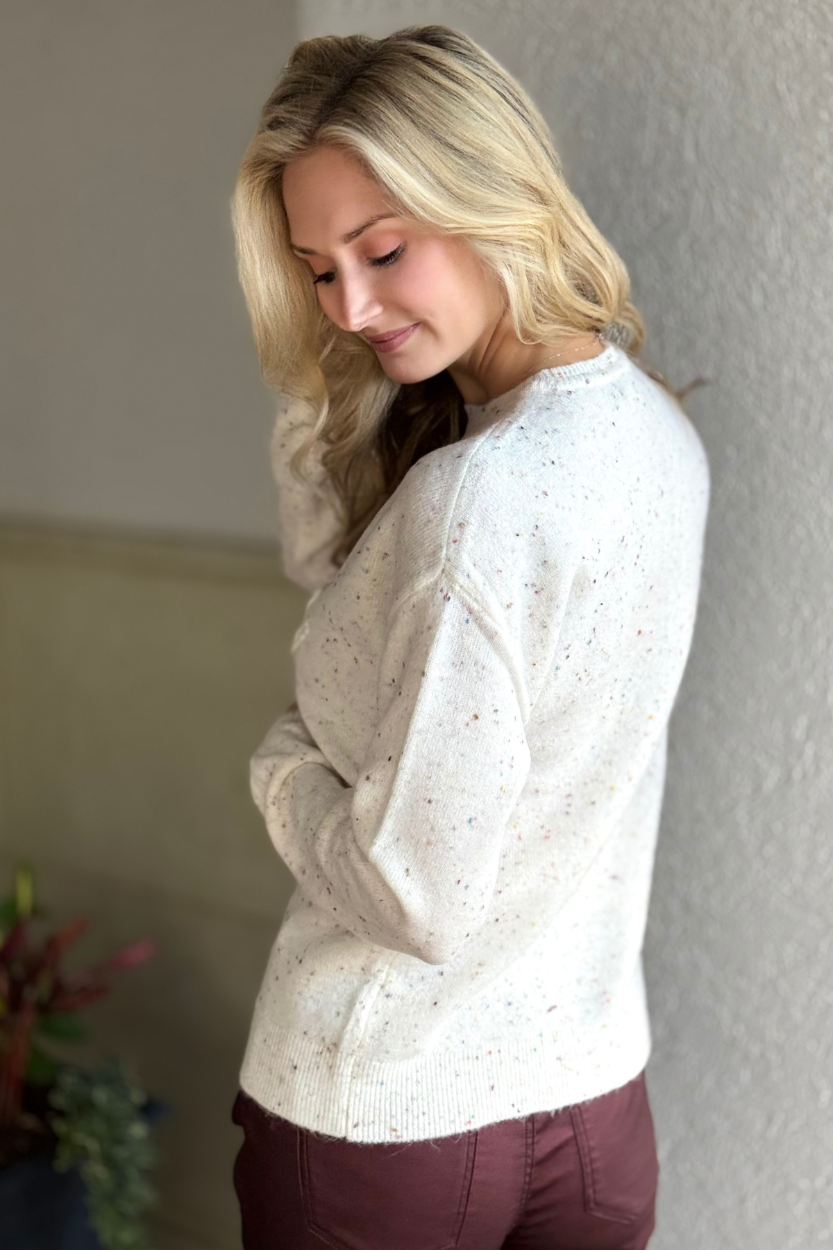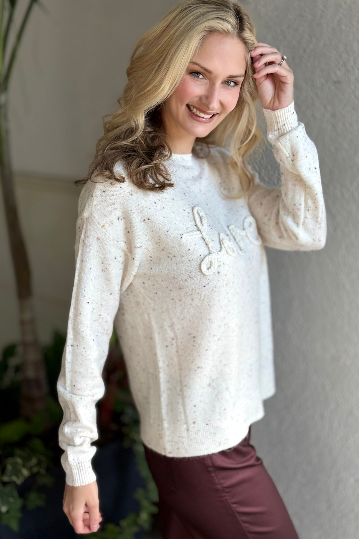Wrap yourself in cozy charm with the Charlie B Braided Love Crew Neck Sweater in soft ecru. This speckled knit features a beautifully braided “Love” detail across the front, adding a touch of heartfelt texture to your everyday style. Designed with a relaxed drop-shoulder fit and long sleeves, it offers both comfort and ease for cool-weather days. Lightweight yet warm, this sweater layers effortlessly over your favorite denim or trousers for a casual, chic fall look.