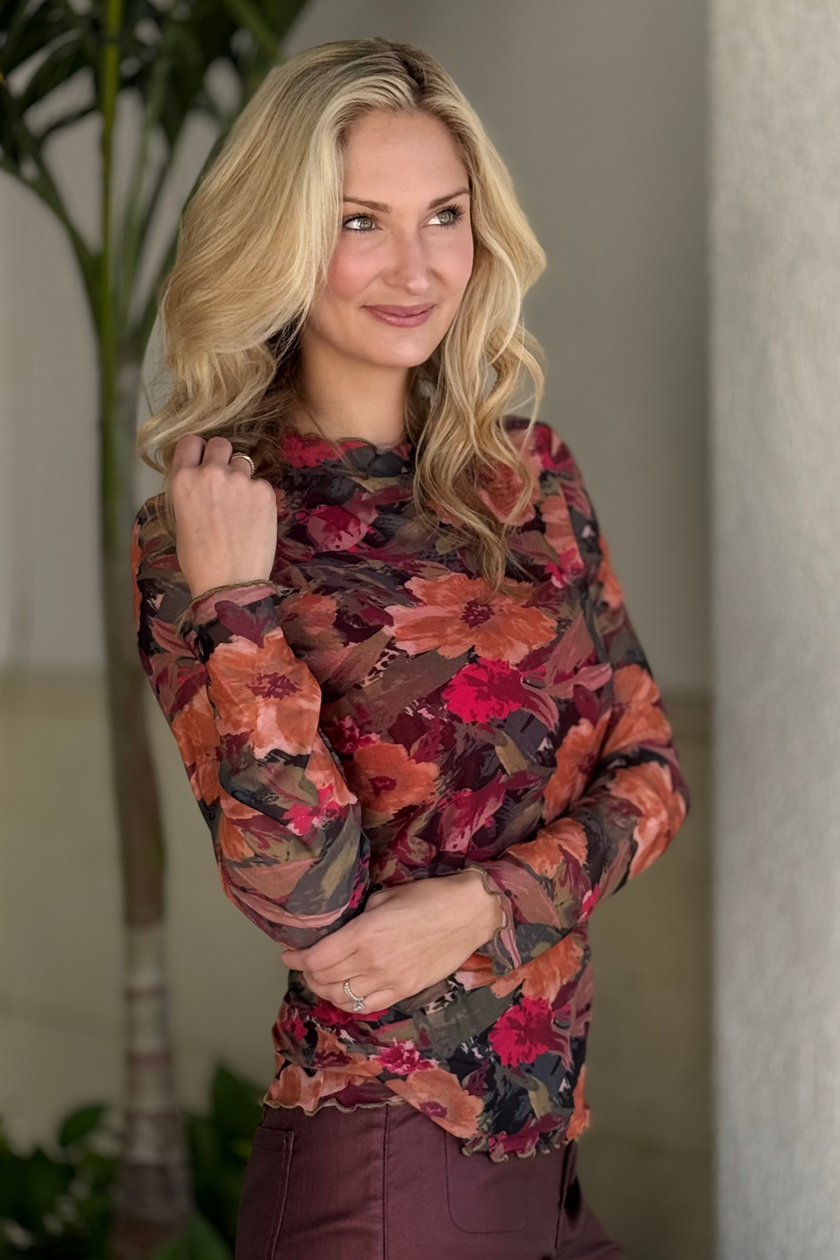 Embrace effortless charm with The Rustic Rose Mesh Top, a sheer floral mesh design that captures the essence of fall. With rich hues of rose, rust, and olive, this top adds warmth and romance to any outfit. The soft, stretchy fabric flatters your shape, while the delicate lettuce-edge trim adds a touch of femininity. Lightweight and versatile, it’s perfect for layering under a jacket or wearing on its own for a bold yet sophisticated look.