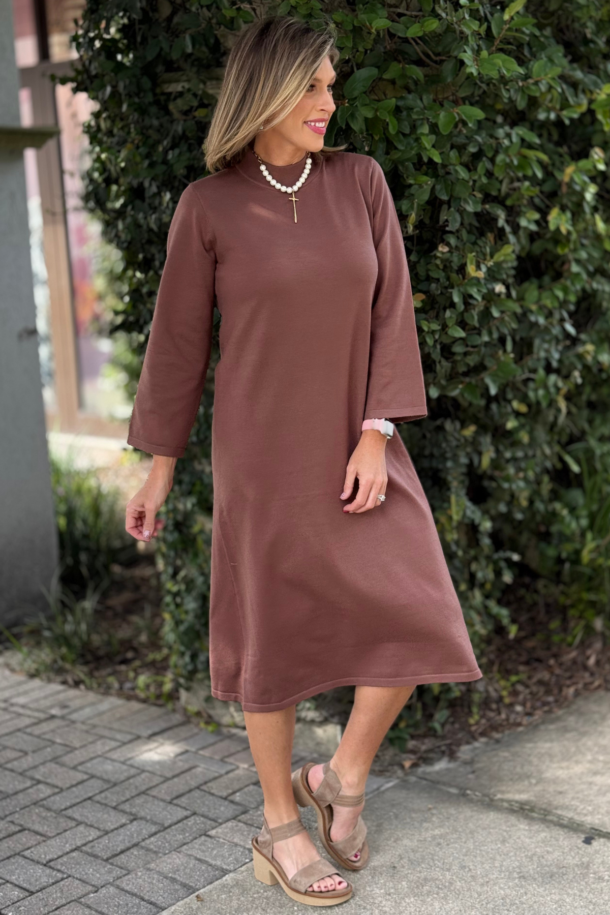 Cozy meets sophistication in The Malibu Sweater Midi Dress. Crafted from a soft, stretchy knit, this dress features a flattering mock neckline and relaxed silhouette for an effortlessly elegant look. The long sleeves and midi length make it a timeless choice for fall and winter styling. Dress it up with boots and a scarf for brunch or layer with a jacket for an easy, polished ensemble.
