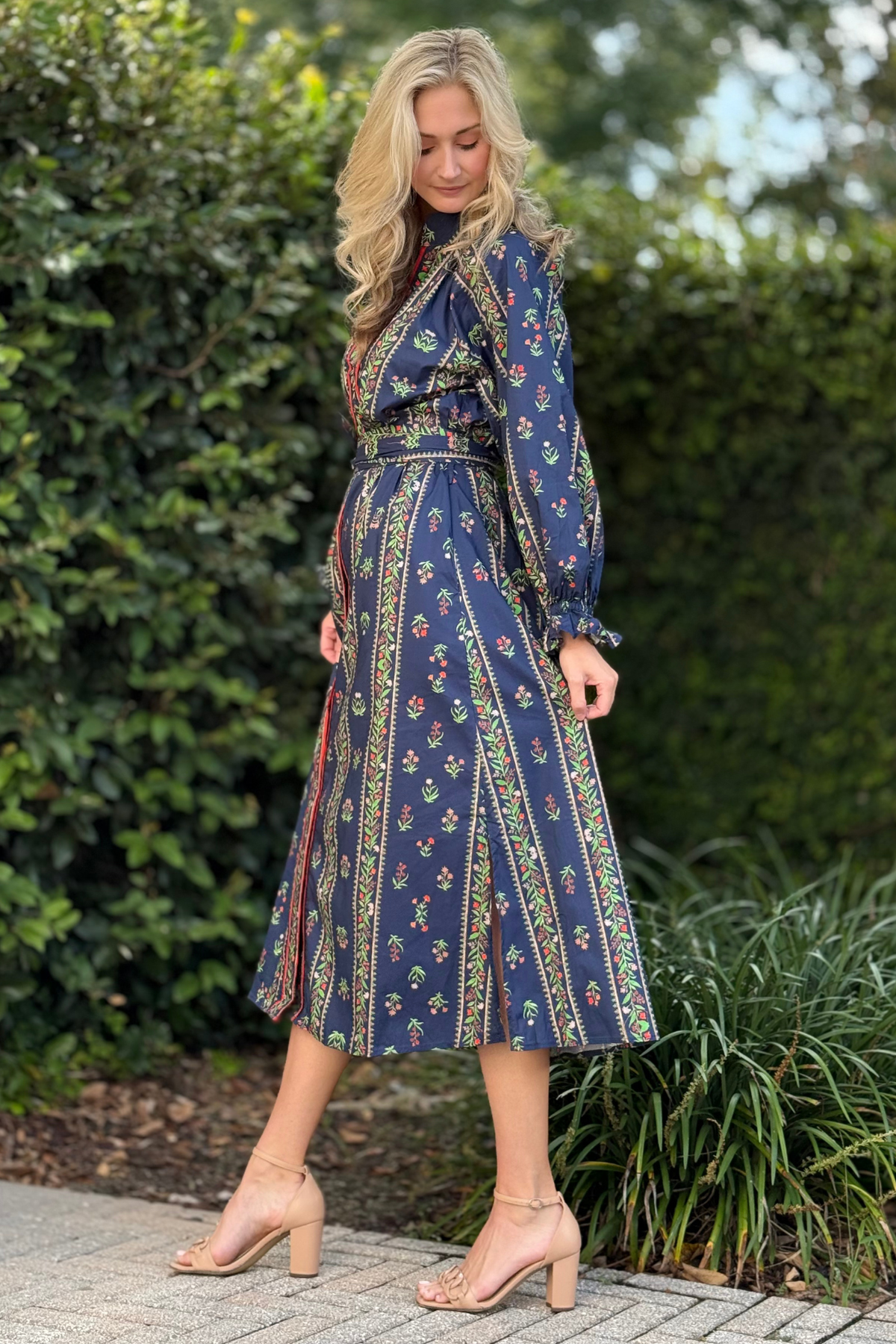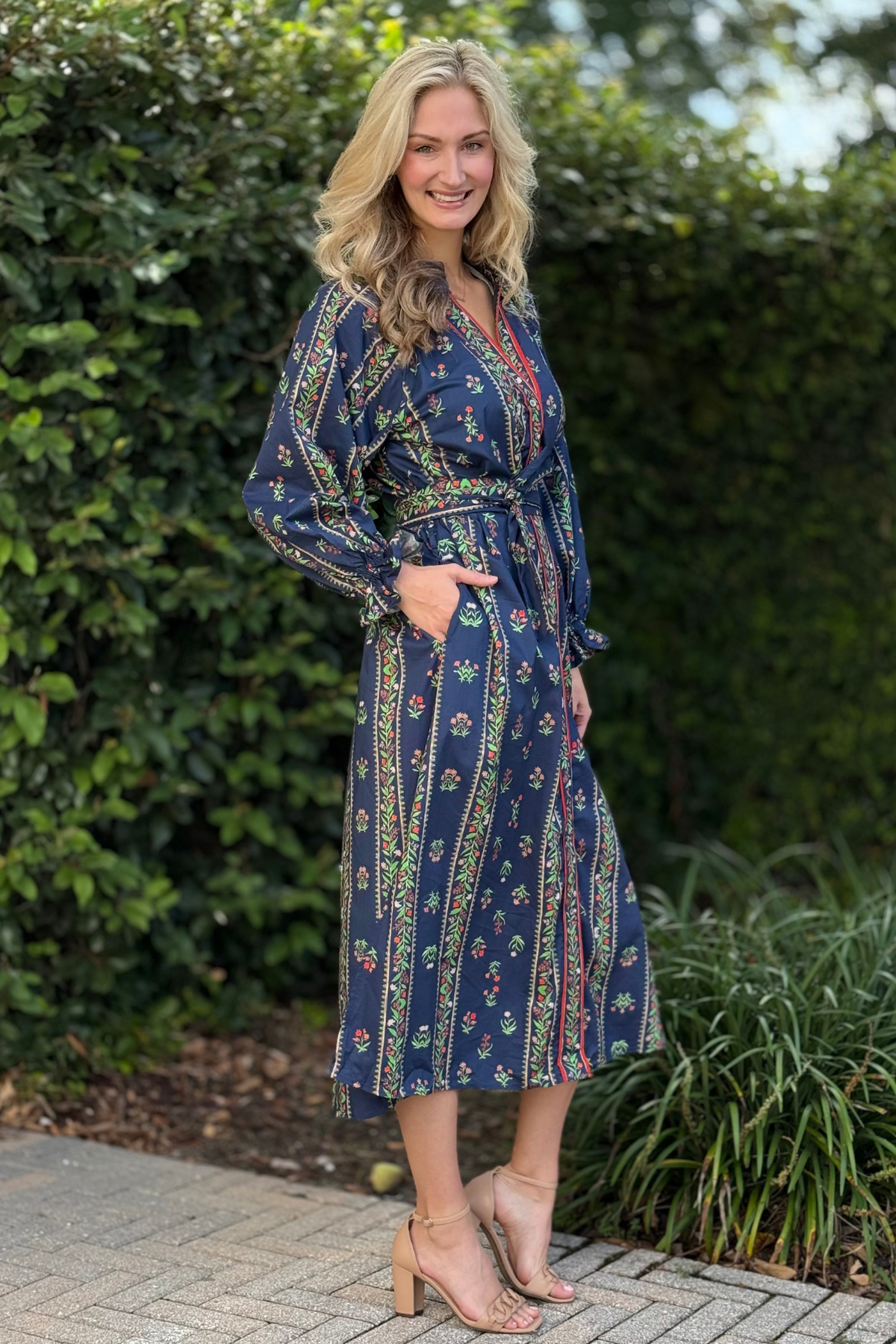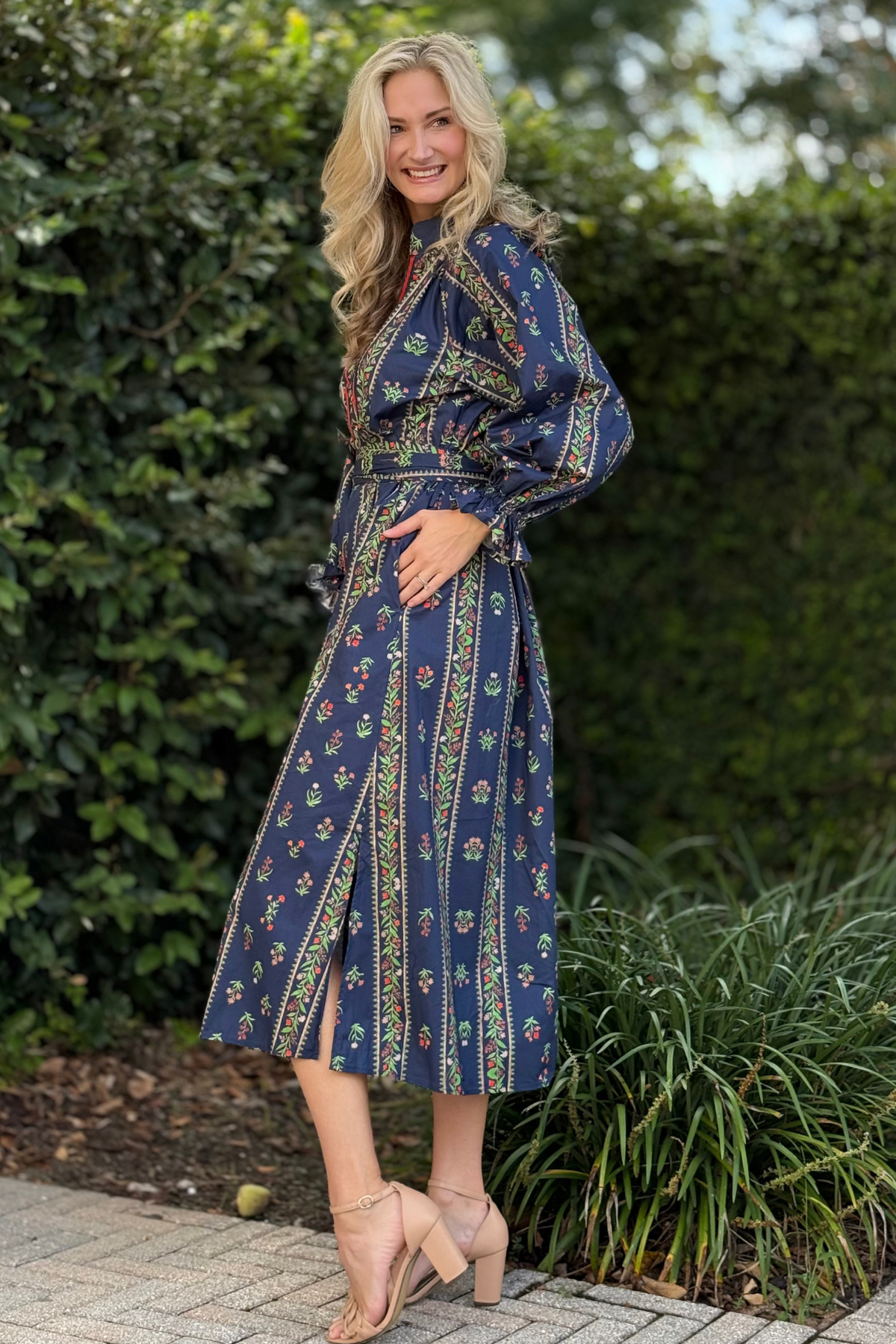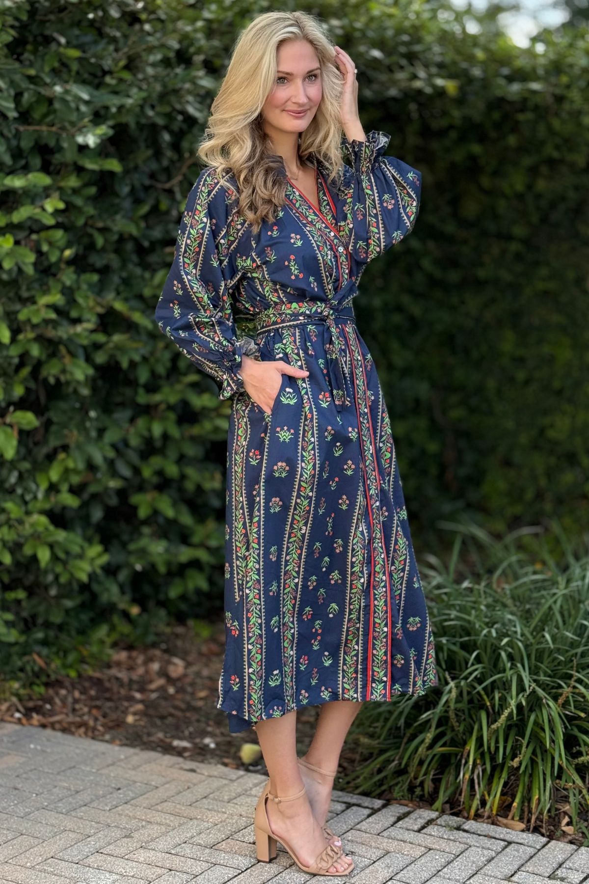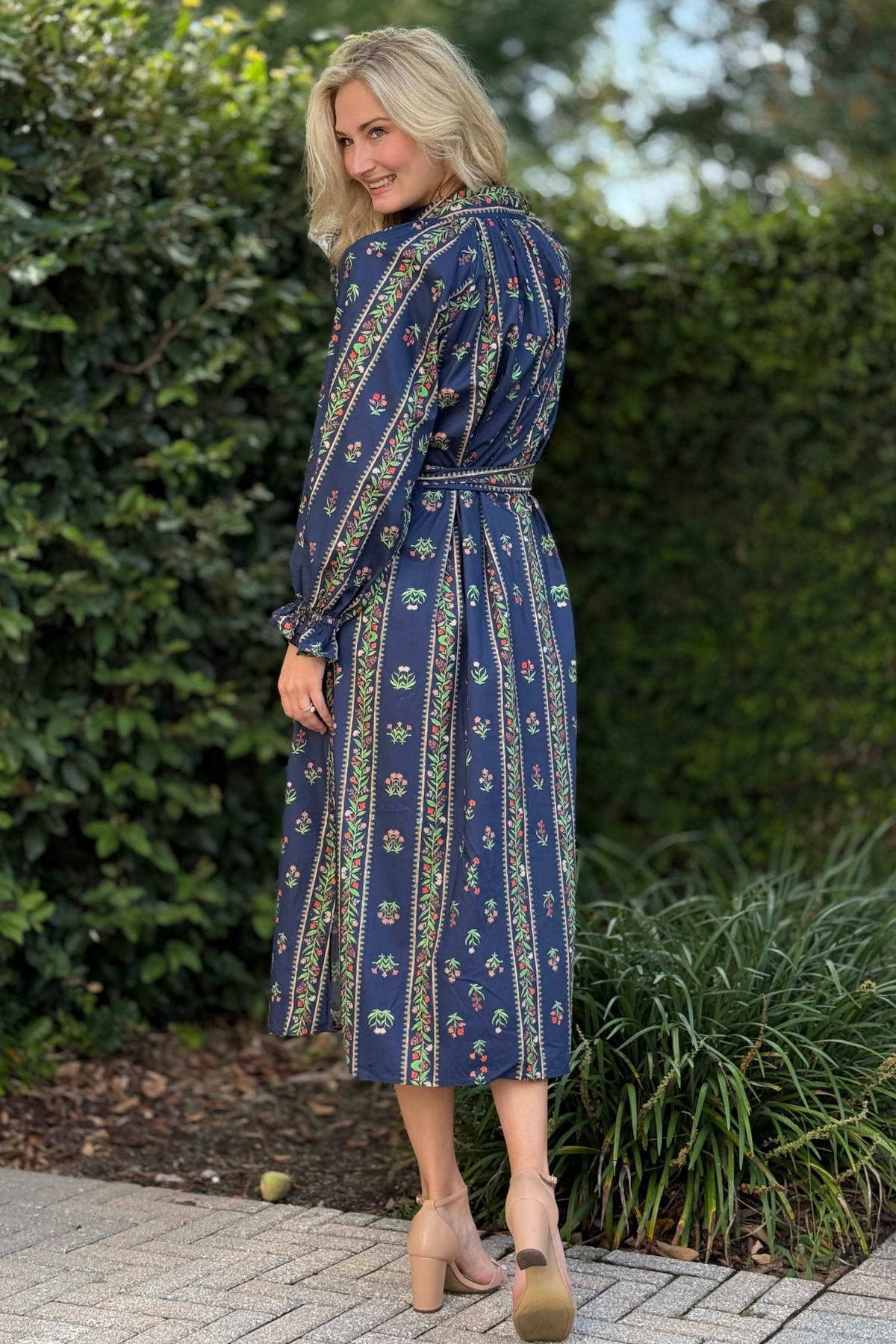 Feminine and effortlessly polished, The Willow Floral Midi Dress blends timeless charm with modern ease. Featuring a navy base with linear floral patterns in rich autumn tones, this shirt dress captures the essence of fall elegance. The pleated ruffle neckline, contrast insets, and self-tie belt add thoughtful detail and a flattering silhouette. Long sleeves and side pockets balance practicality with style, making this dress perfect for workdays, weekend outings, or seasonal events. Crafted from breathable cotton, it’s a versatile piece that transitions seamlessly through your calendar.