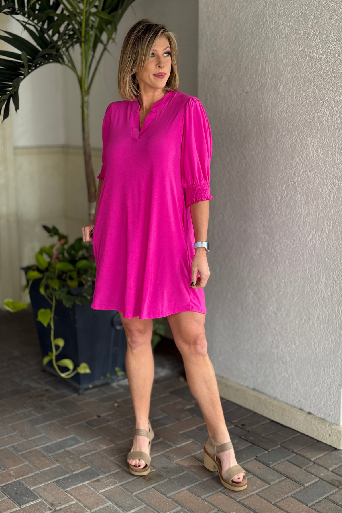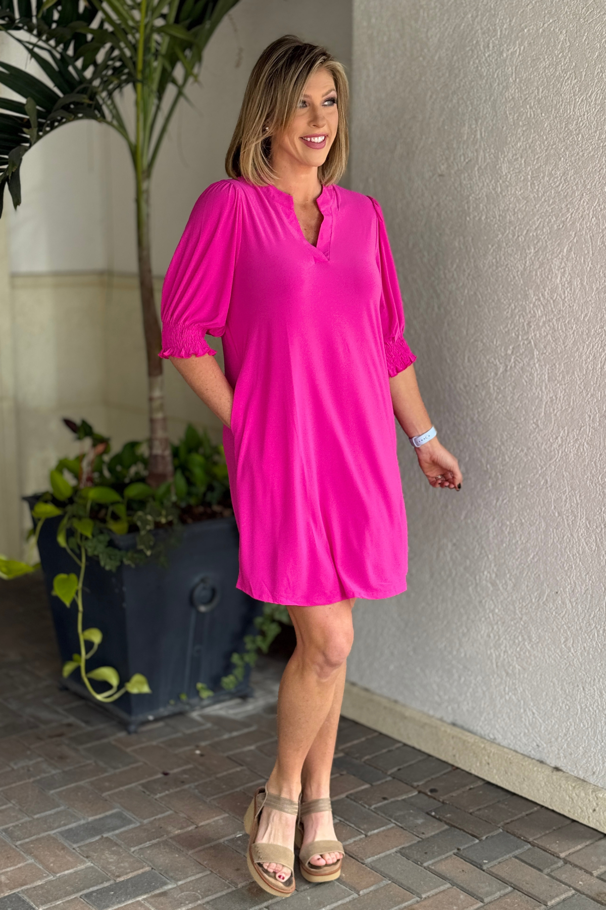 The TPN Effortless Shirt Dress in Runway Pink is the definition of chic, easy dressing. Designed in Dear Scarlett’s signature wrinkle-free fabric, this dress delivers a polished look with unmatched comfort. Featuring a classic collar, button placket neckline, and functional pockets, it blends timeless structure with everyday wearability. Smocked sleeves add a soft, feminine touch while offering a flattering fit through the arms. The relaxed silhouette makes this dress perfect for workdays, church, luncheons, travel, and special occasions when you want to look put together without the effort. A standout piece from the TPN Collection, this vibrant hot pink dress brings confidence and versatility to your wardrobe.