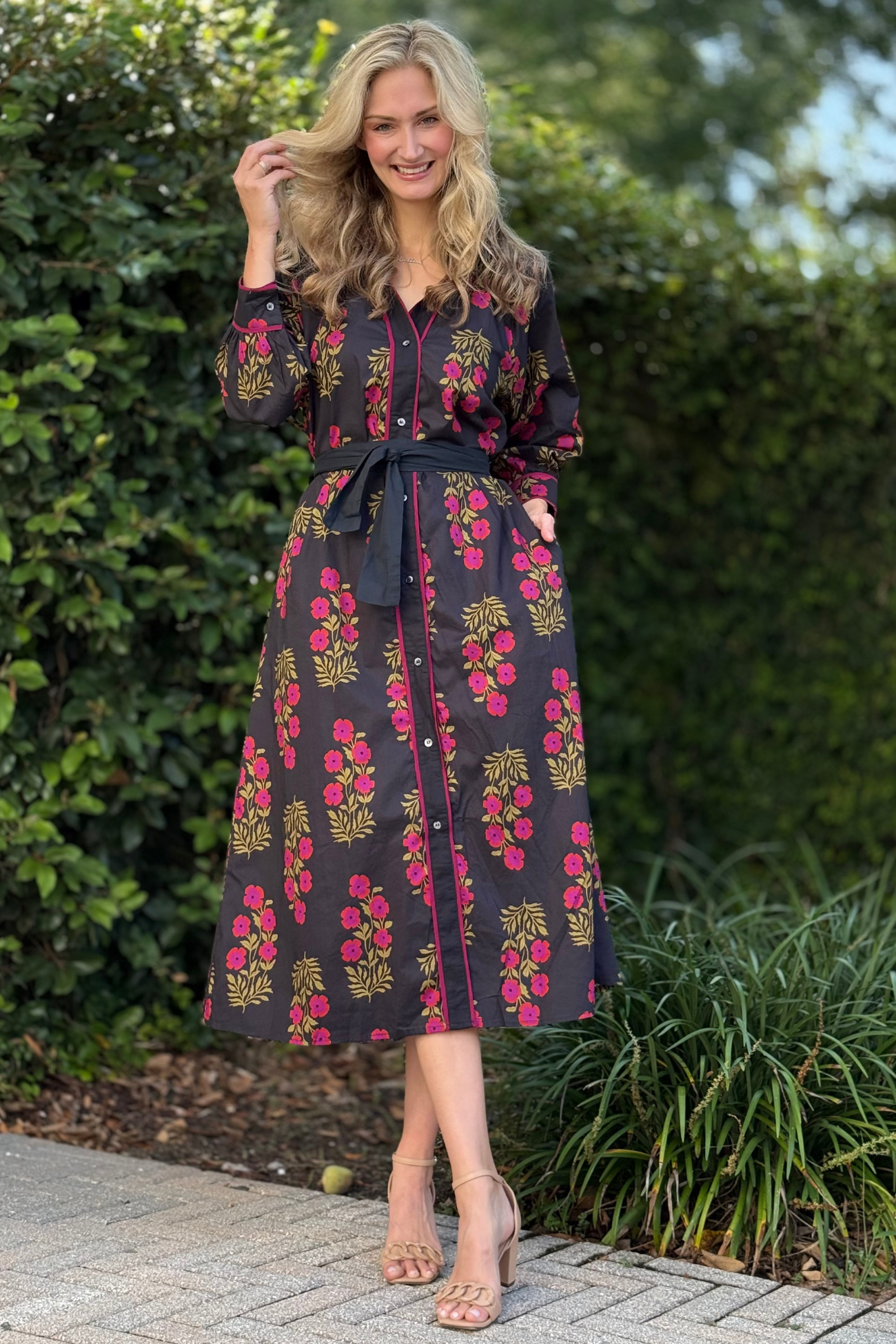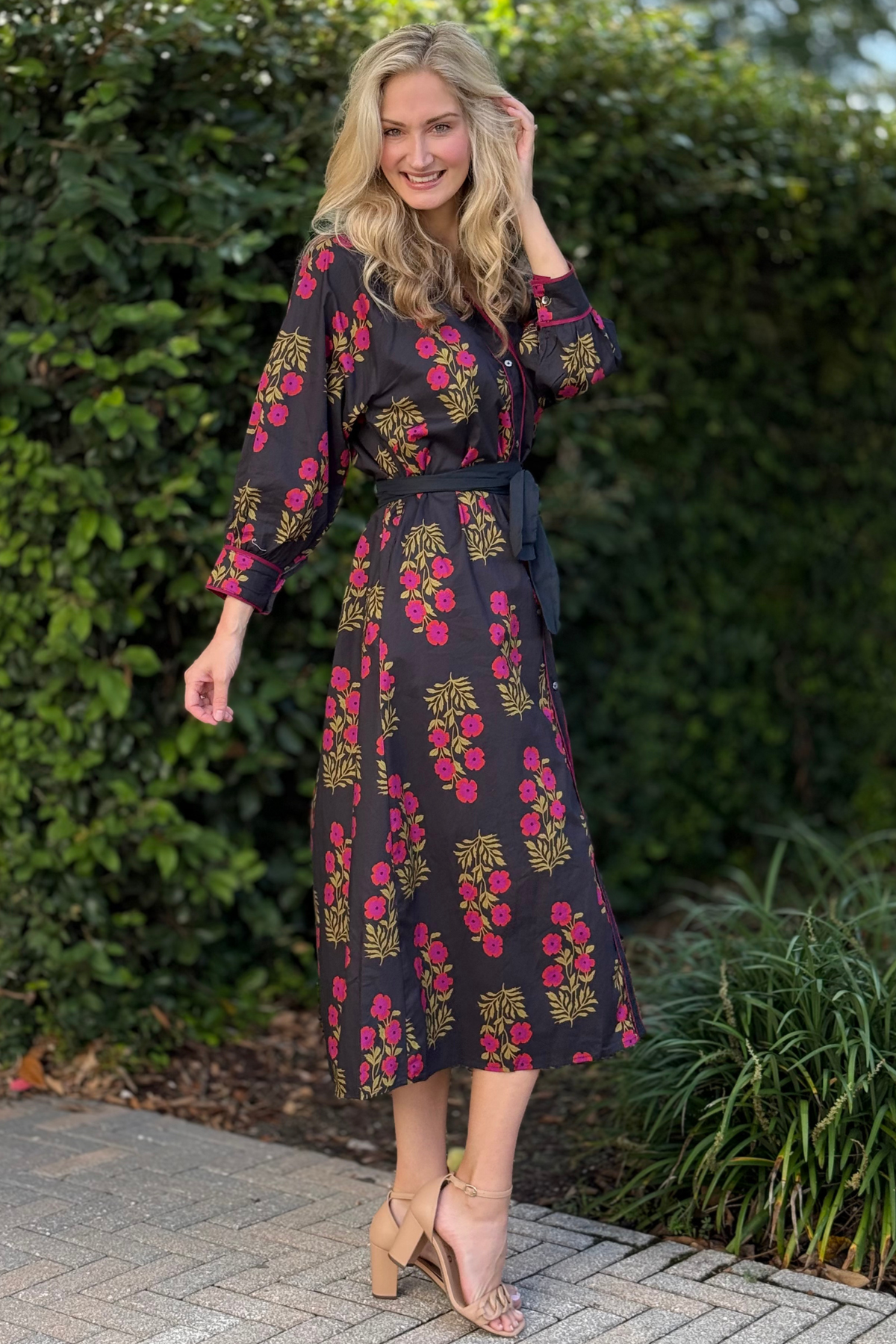 A removable self-tie belt cinches the waist for a flattering fit, while the fully lined interior ensures smooth comfort and an elegant drape. Effortlessly versatile, this dress can be styled buttoned up for a refined look or worn open as a chic duster over jeans and a tank. Whether for work, special occasions, or a cozy weekend brunch, the Victorian Vine Dress is your go-to for timeless beauty and effortless grace.