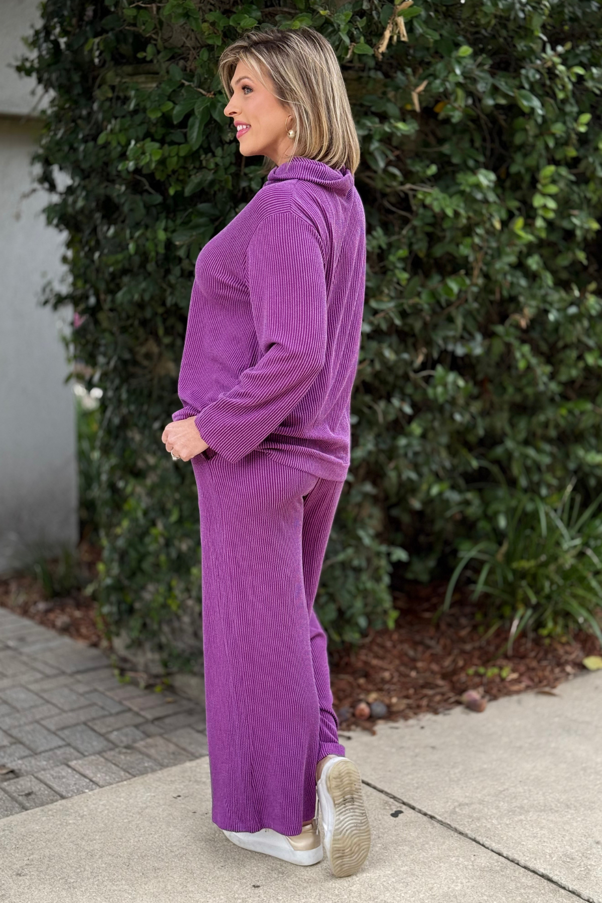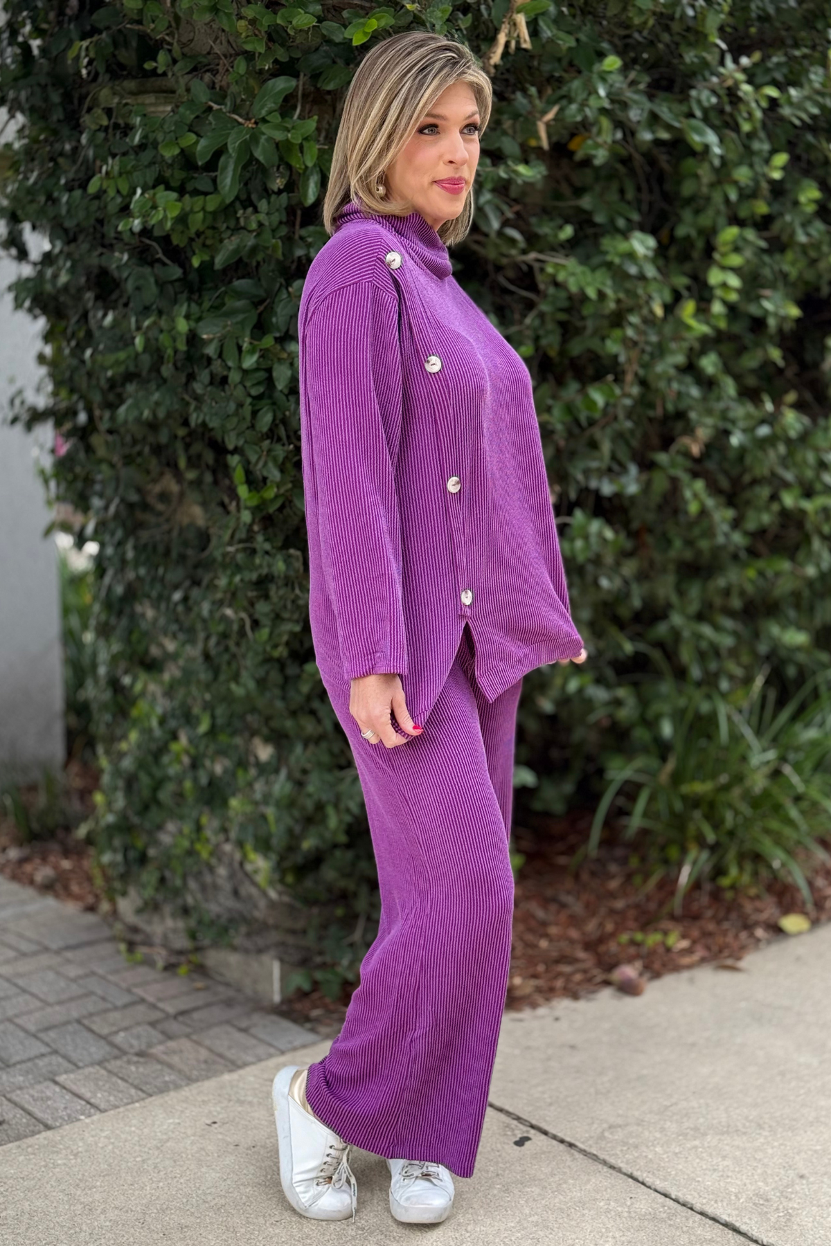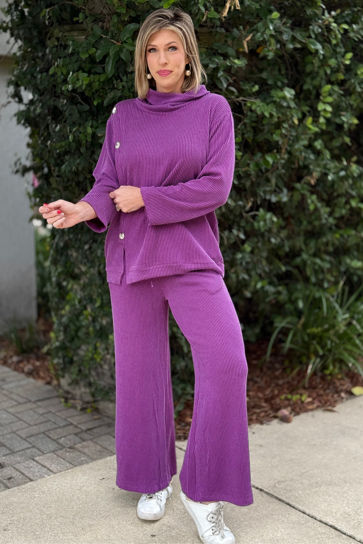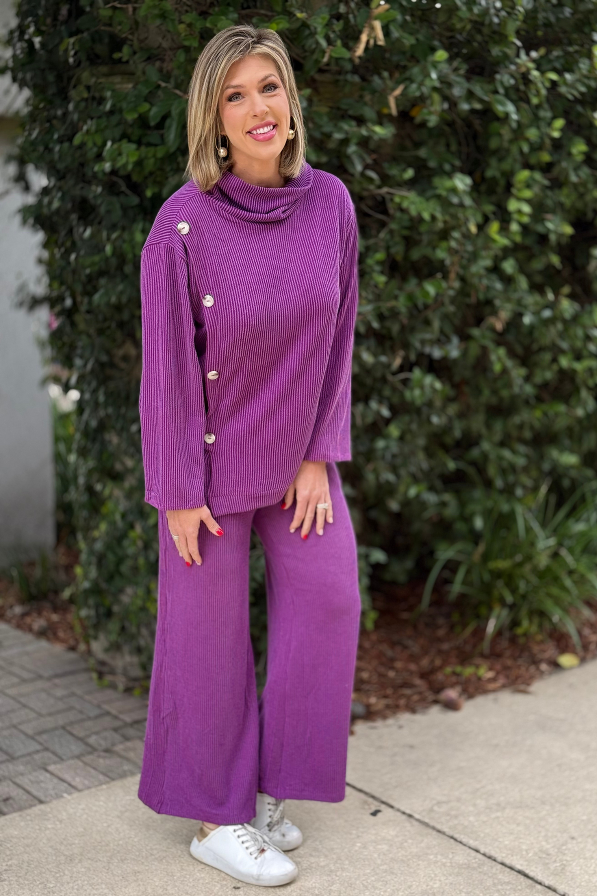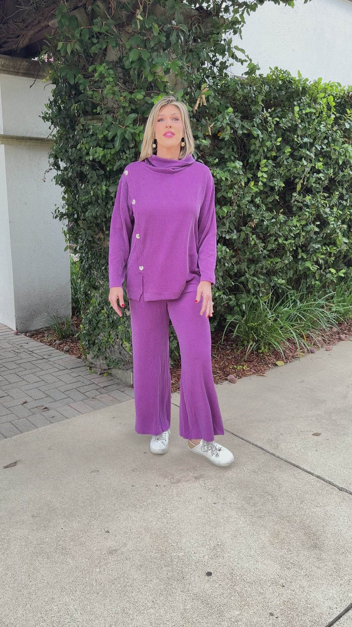 Step into rich, effortless comfort with The Lavish Lounge Rib Set – Eggplant. This luxe two-piece ribbed set features a soft cowl-neck tunic with statement button detailing and a relaxed, flowy fit that flatters every shape. The coordinating elastic-waist pants deliver cozy movement and everyday elegance in one easy outfit.