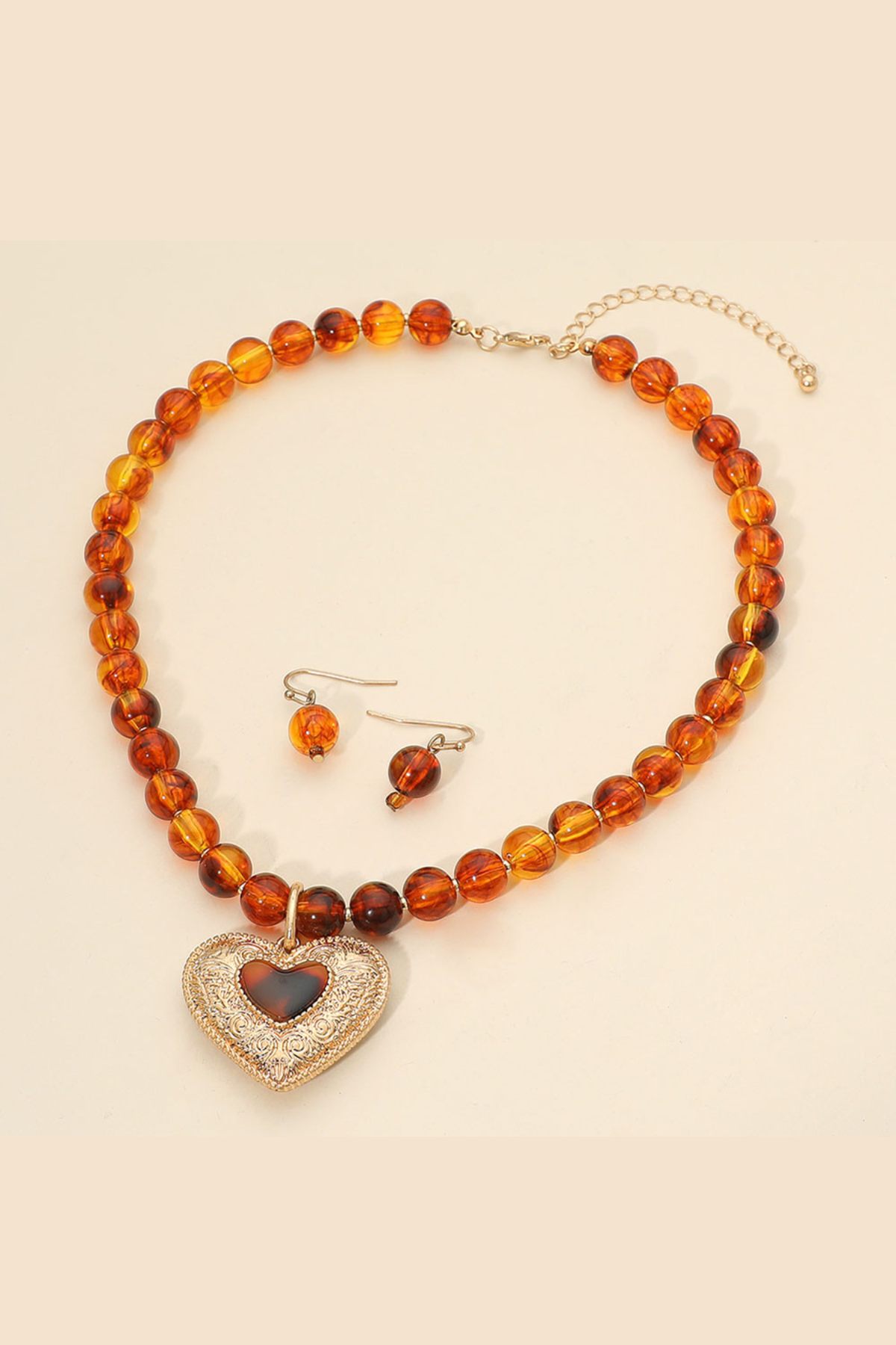 The Golden Heirloom Heart Beaded Statement Necklace Set brings timeless, vintage-inspired elegance to any look. Designed with warm-toned translucent beads and a beautifully detailed heart charm pendant, this statement necklace adds rich texture and classic charm. The coordinating drop earrings complete the set, creating a cohesive and elevated accessory pairing that feels both nostalgic and modern. Perfect for styling with cozy knits, flowy dresses, or elevated everyday outfits, this set effortlessly transitions from casual days to special occasions with ease. Crafted to be lead and nickel compliant, it offers beauty you can feel good about wearing.