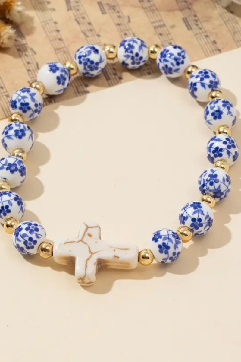 Blue Porcelain Faith Cross Stretch Bracelet