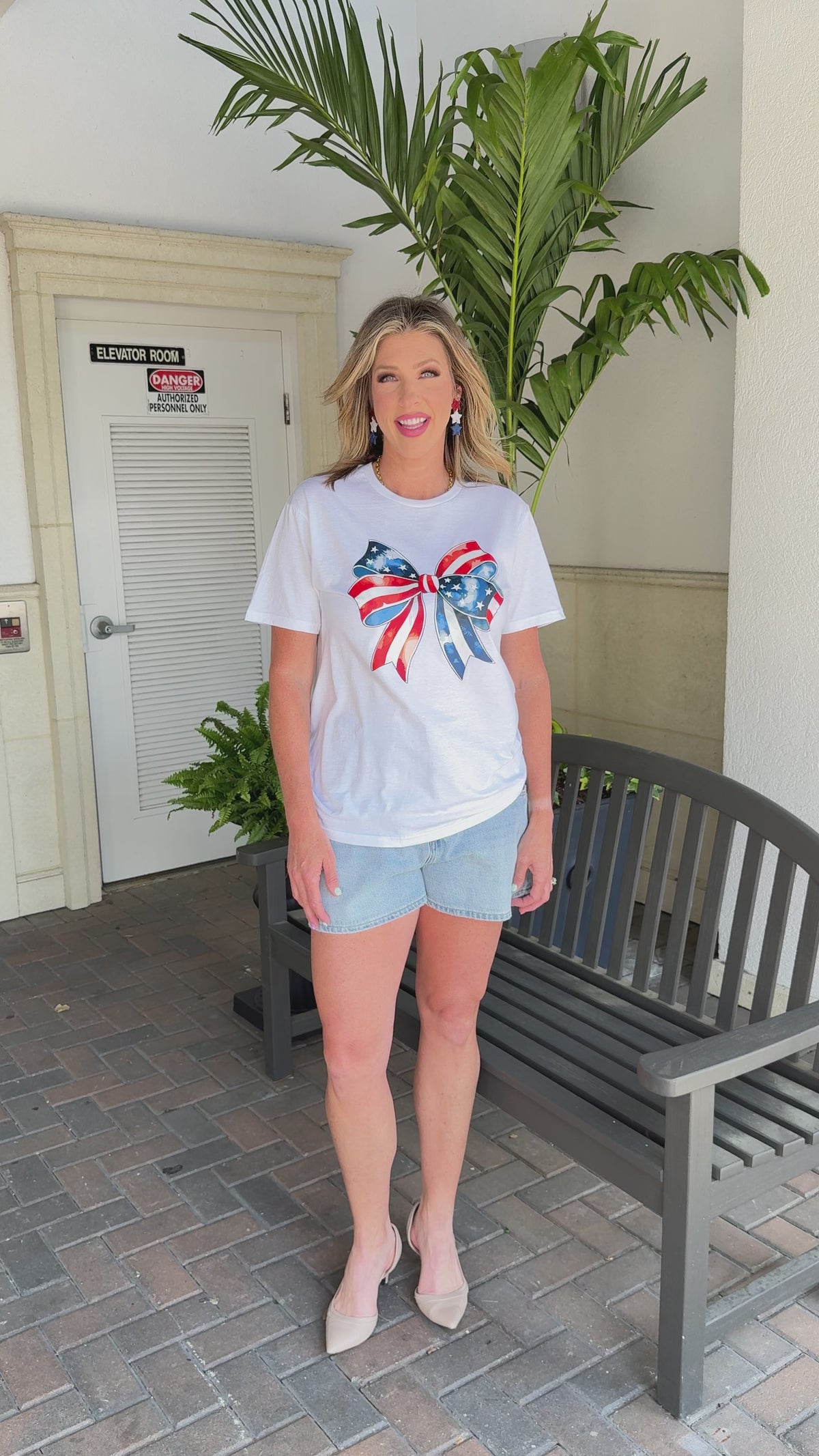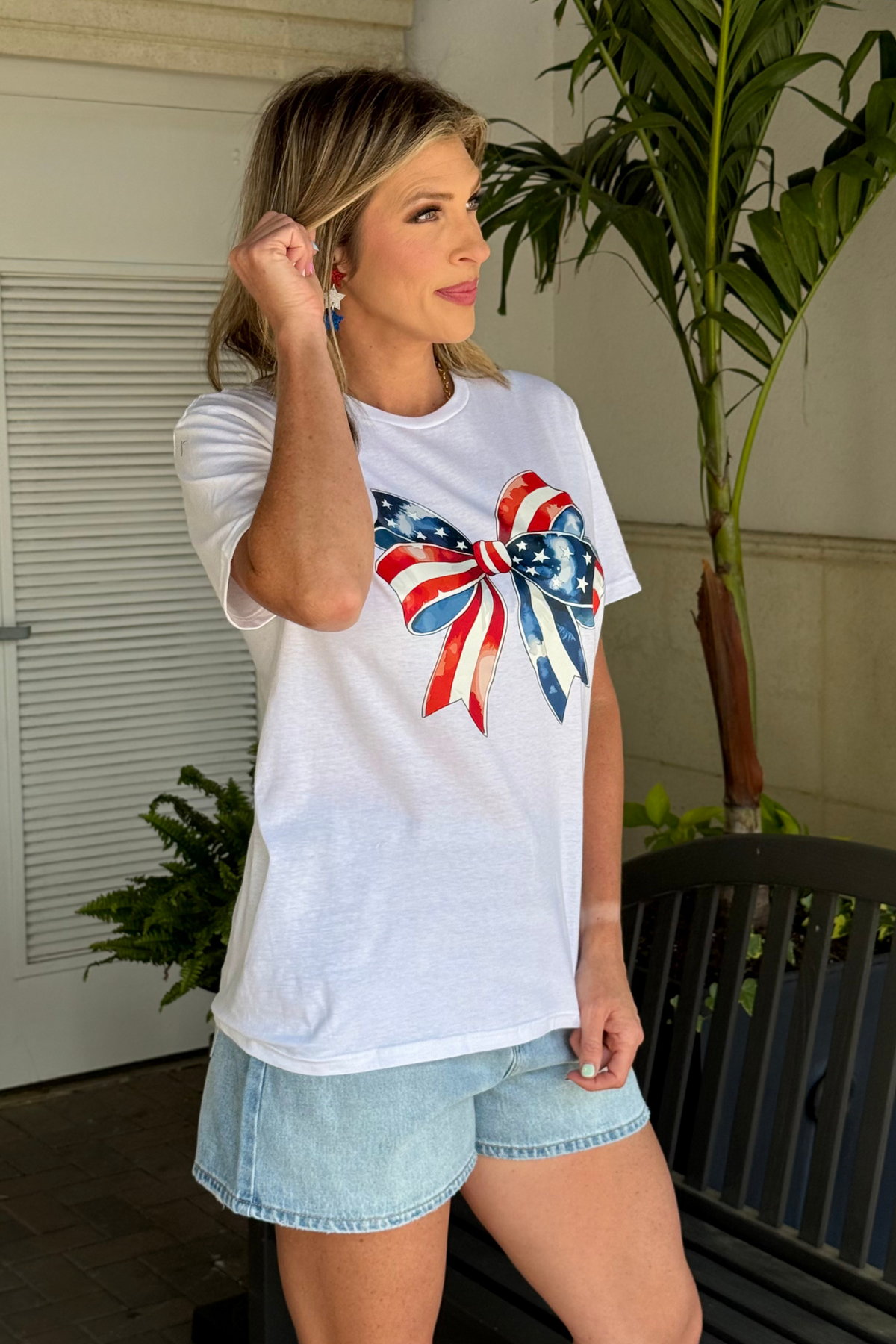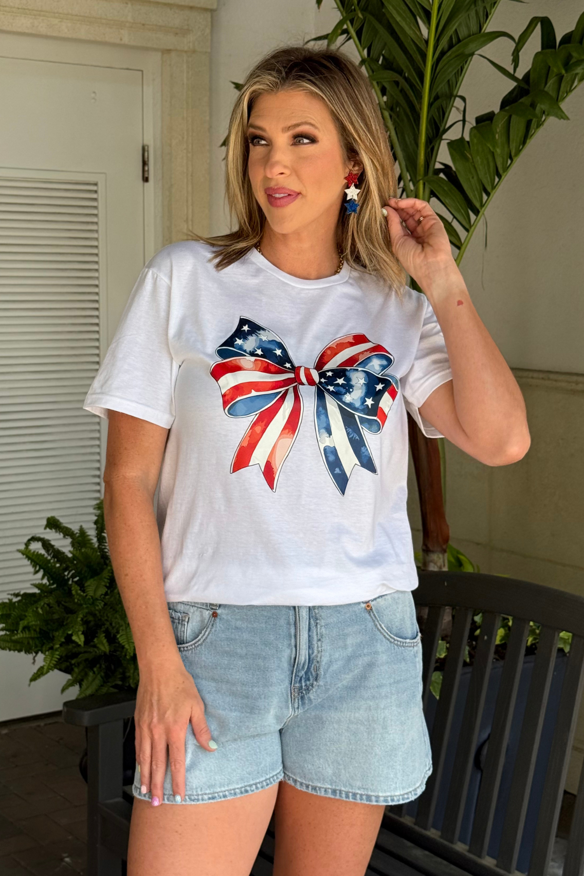 Add a playful twist to your patriotic look with the All-American Bow Tee. This soft, classic crewneck t-shirt features a bold red, white, and blue bow detail that brings just the right amount of charm to your everyday style.