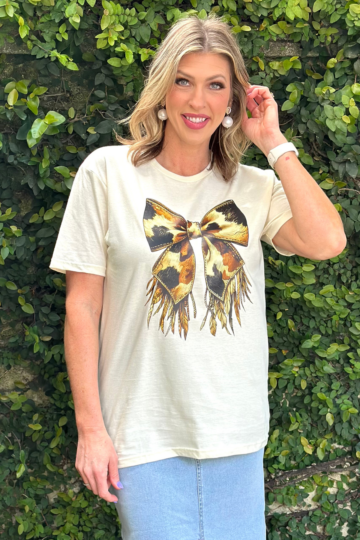 Add a bold western-chic touch to your wardrobe with our Cowhide Bow Crewneck Tee! This stylish graphic tee features a beautifully detailed cowhide-print bow with rustic fringe and feather accents, creating the perfect mix of feminine charm and country flair. Made from soft, breathable fabric, this relaxed-fit crewneck is perfect for casual outings, concerts, or layering under your favorite jacket. Pair it with denim shorts or jeans for an effortlessly trendy look!