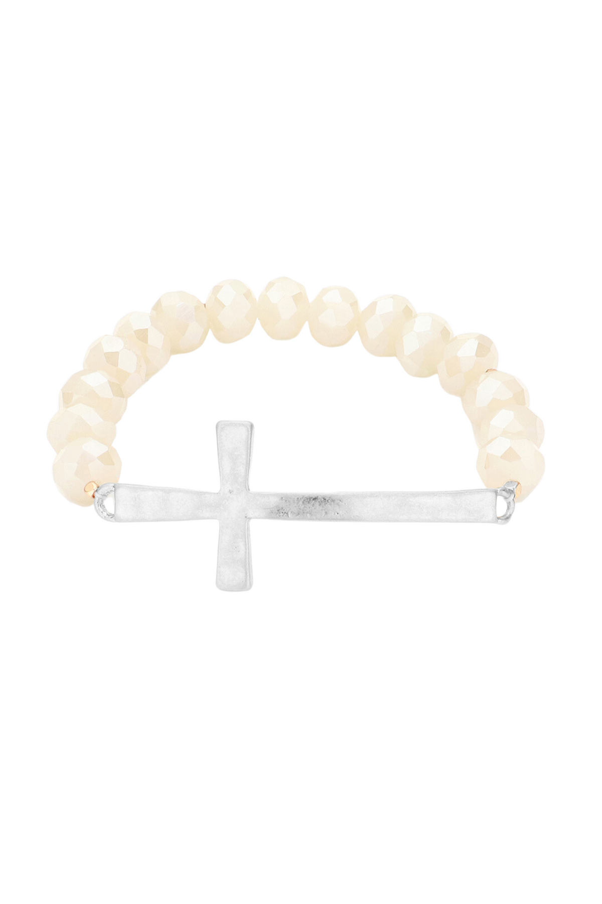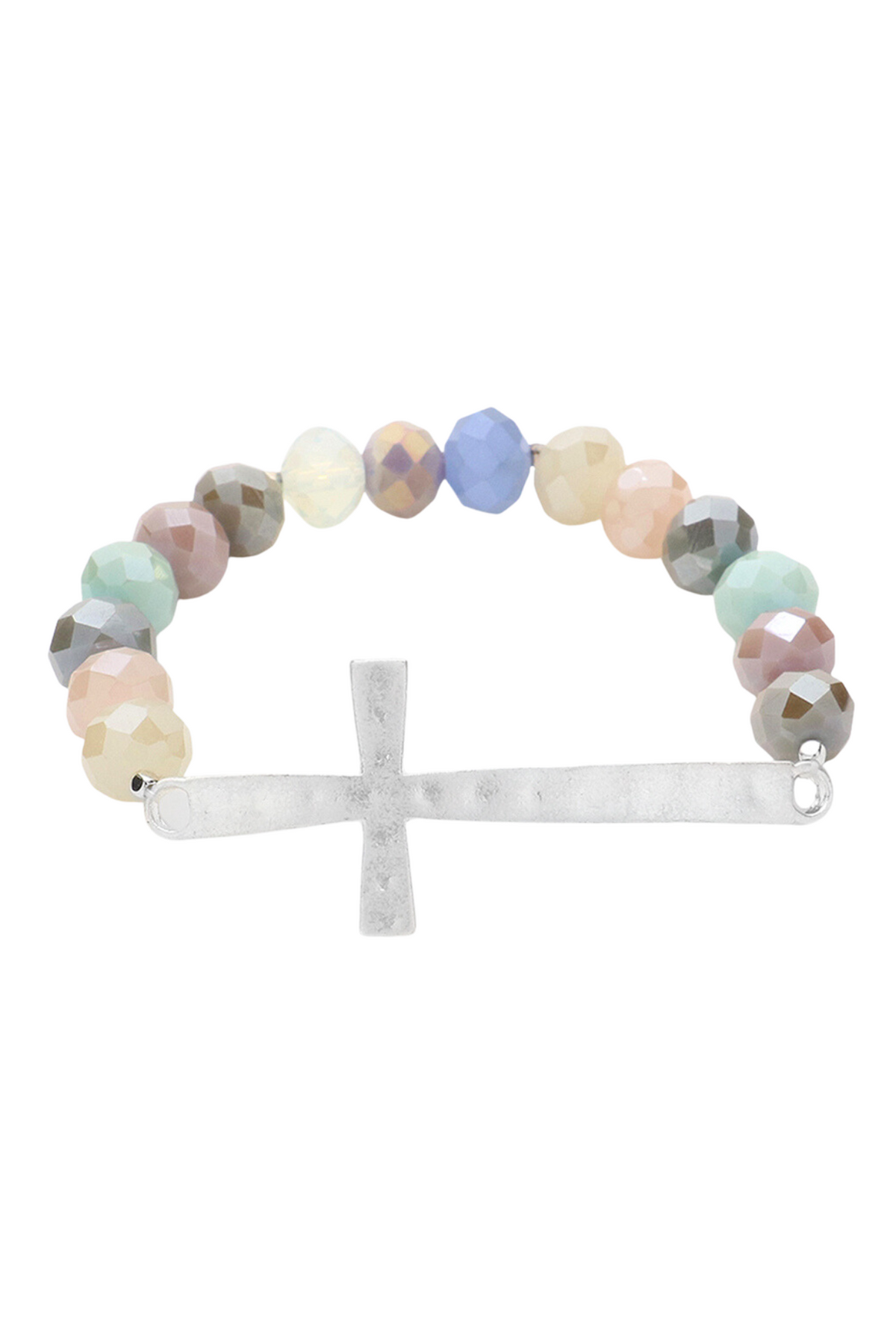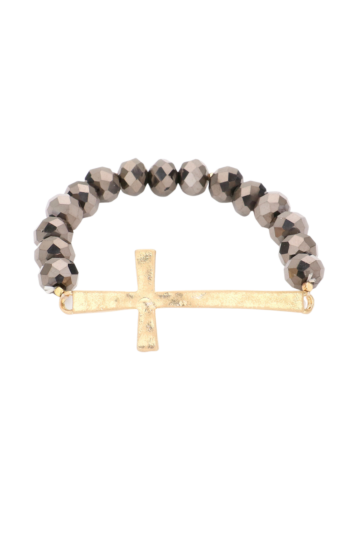 Make a statement with this contemporary hammered metal cross accented stretch bracelet. Its faceted bead design provides a sparkly shine, while its stretchable material ensures a comfortable fit for any wrist. Lead and Nickel compliant, this stylish and sophisticated bracelet is the perfect addition to any outfit.