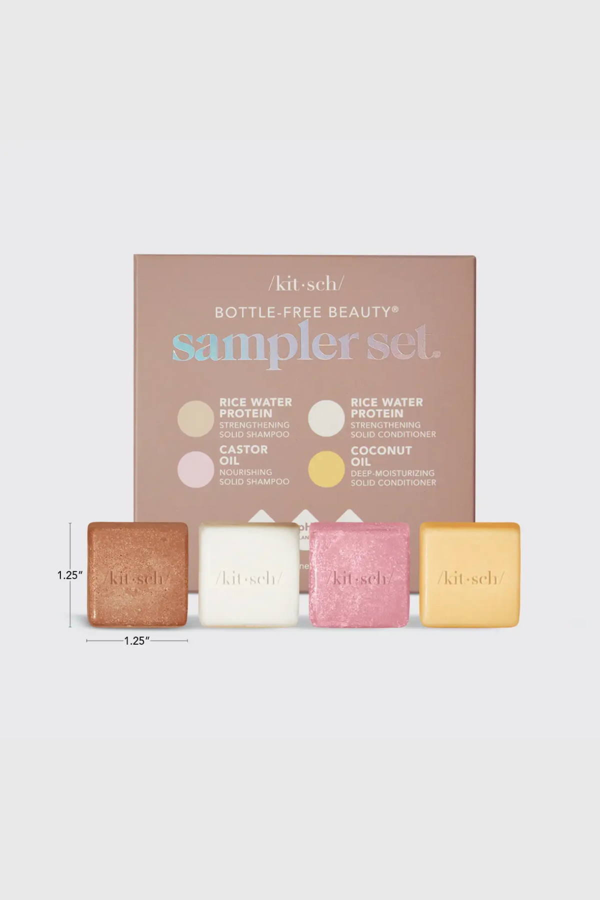 The KITSCH Bottle-Free Beauty 4pc Sampler Set includes one of each of their best-selling formulas. The Rice Water Strengthening Shampoo gently cleanses while promoting overall hair length and density, while the Rice Water Strengthening Conditioner helps leave hair feeling repaired and shiny. The Castor Oil Nourishing Shampoo provides a gentle cleanse while adding shine and moisture, and the Coconut Oil Deep-Moisturizing Conditioner leaves hair feeling silky and hydrated. All formulas are free of parabens, phthalates, sulfates, silicones, and artificial fragrance, and are designed to help reduce single-use plastic—making them as kind to the planet as they are to your hair.