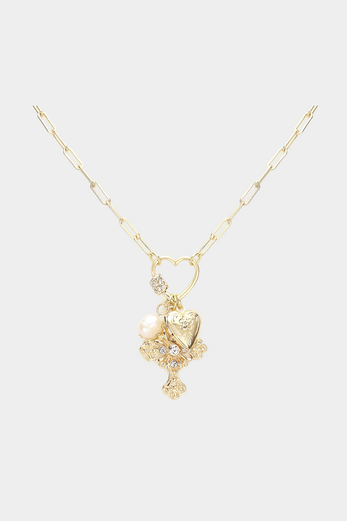 Pearl Stone Paved Cross Heart Locket Pendant Necklace