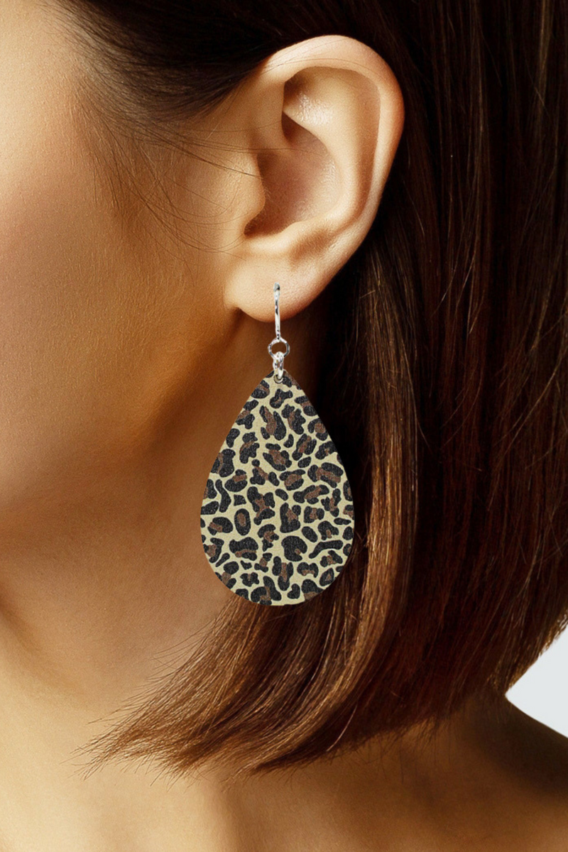 Leopard Print Teardrop Wood Dangle Earrings-Brown