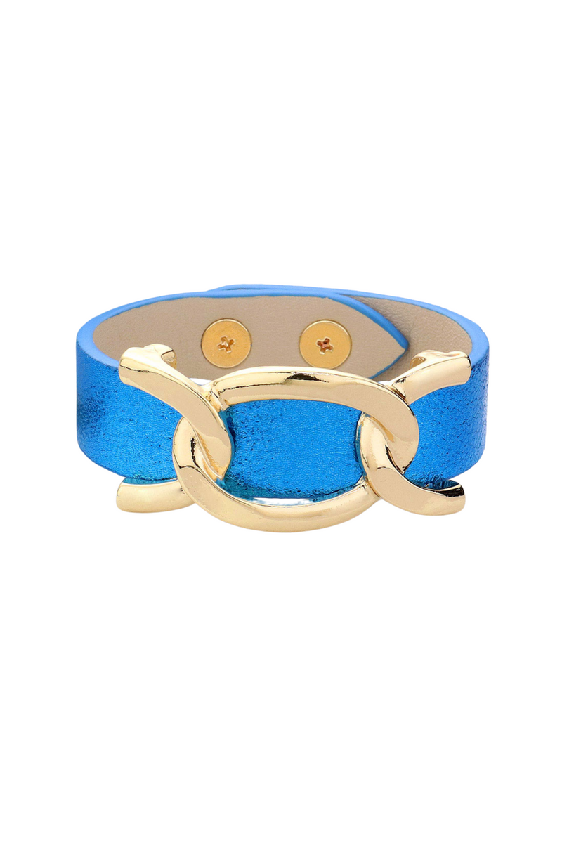 Faux Sparkle Leather Metal Link Accented Snap Bracelet