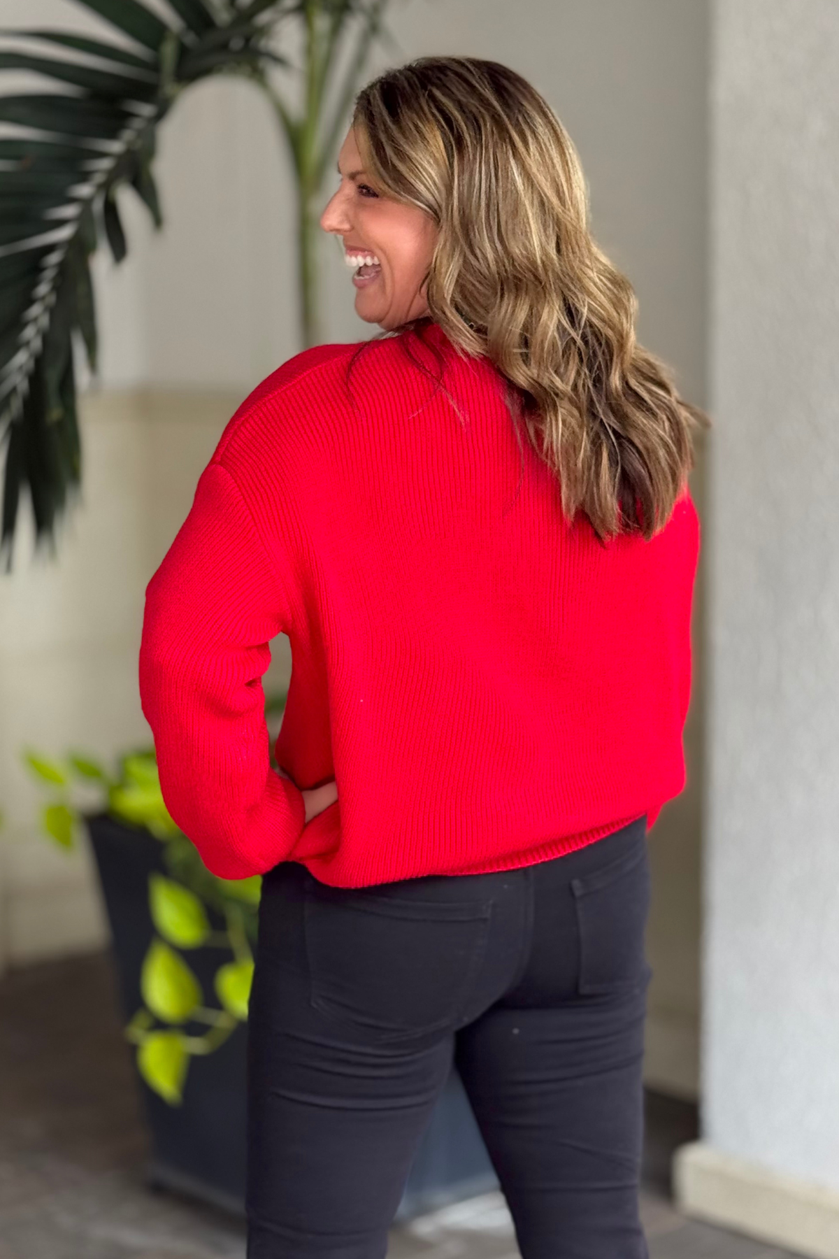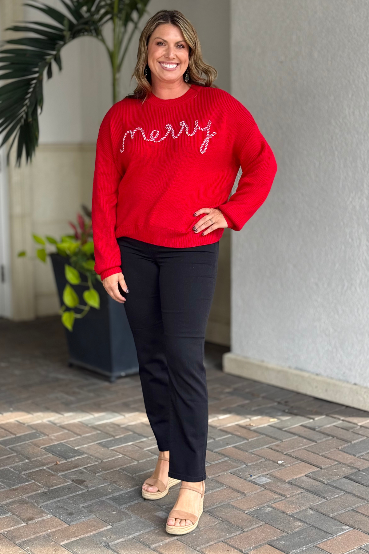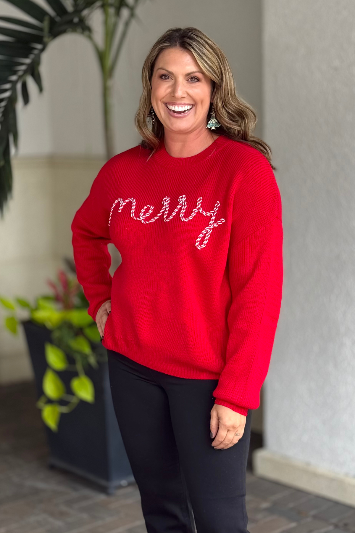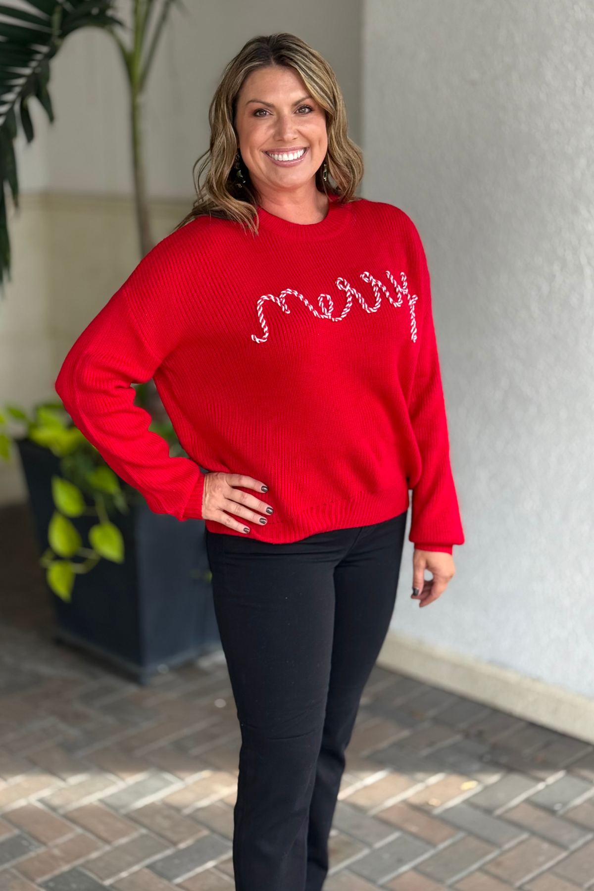 Stay merry all season long in this cheerful red knit sweater! Featuring a playful candy-cane-inspired embroidery that spells out “Merry,” this cozy piece brings a sweet and festive twist to your winter wardrobe. Crafted from a soft, warm knit with a relaxed fit, it’s perfect for holiday gatherings, cookie decorating, or simply curling up with a mug of cocoa. Dress it up with sparkly earrings or keep it casual with jeans — either way, it’s pure holiday joy in sweater form.