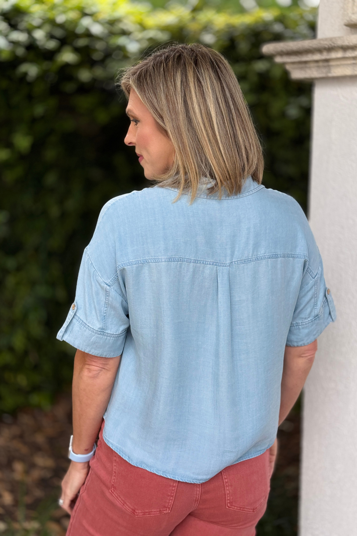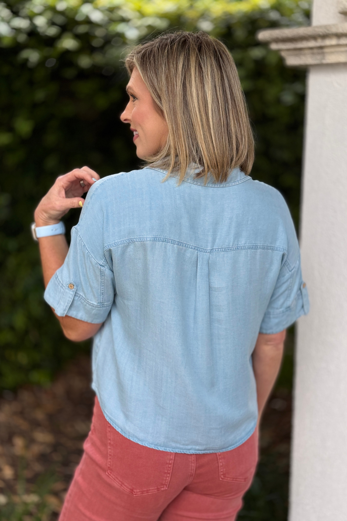 Effortless, lightweight, and endlessly versatile—the Charlie B Easy Days Tencel Button-Up in Light Denim Blue is a customer favorite for a reason. Designed with a classic shirt collar, short sleeves with button tab detail, and functional chest pockets, this top offers that perfectly relaxed yet polished look. The ultra-soft Tencel fabric gives it a breathable, lightweight feel that drapes beautifully without clinging, making it ideal for warm spring and summer days. The soft light denim blue shade makes styling easy—pair it with white denim, colored jeans, or shorts for a fresh, everyday outfit. Whether worn tucked, untucked, or layered open, this is one of those grab-and-go pieces you’ll live in. And since it’s a top seller with no restock, you’ll want to grab it while you can.