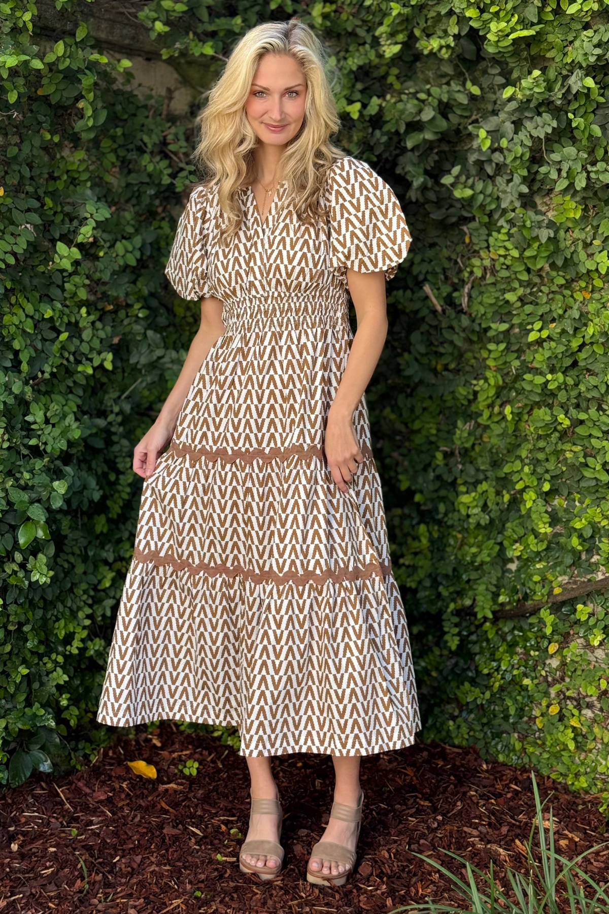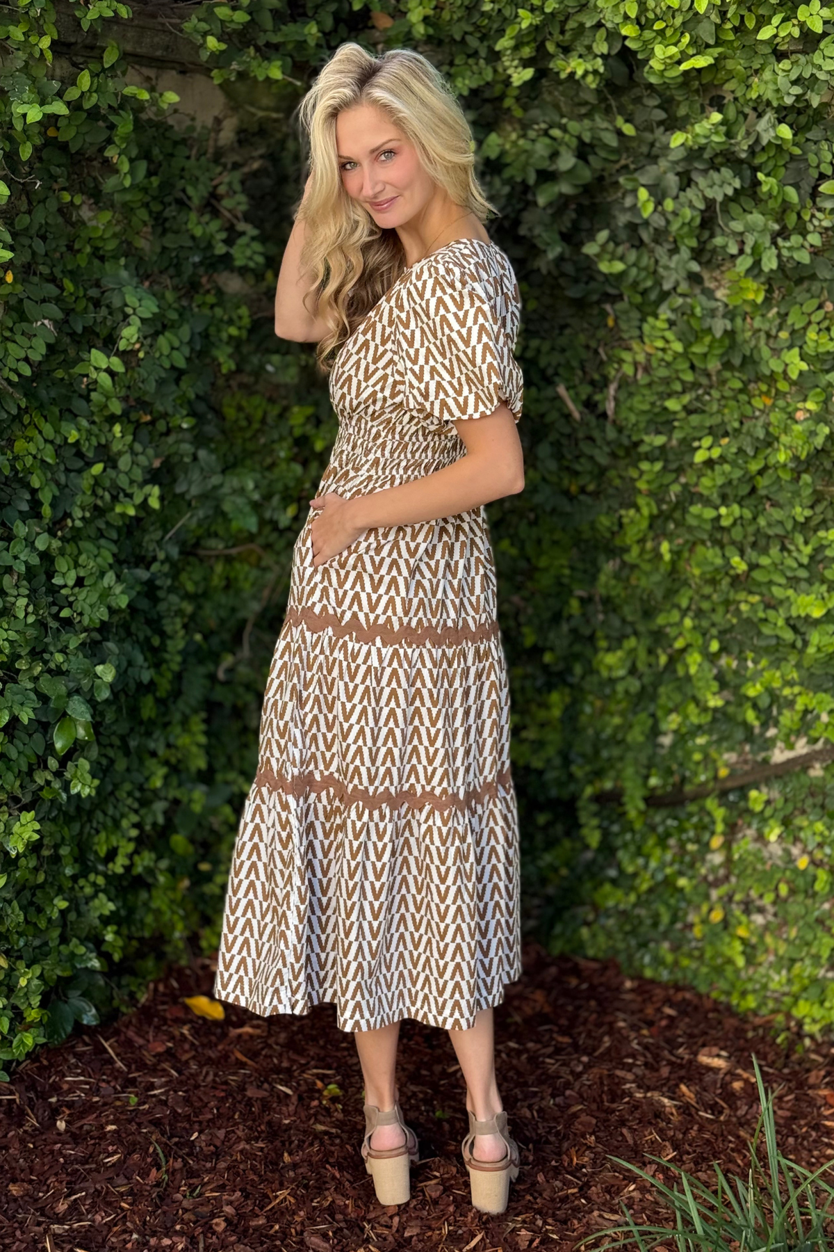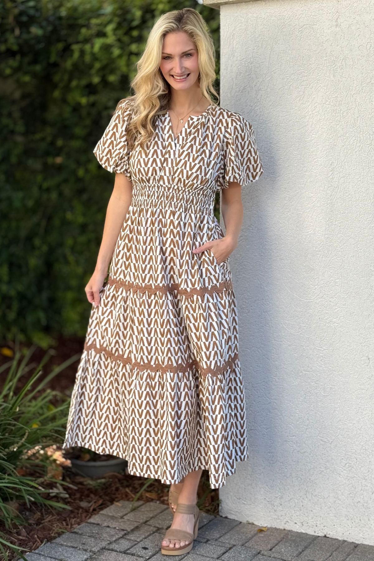 The Coffee Canvas Geometric Smocked Midi Dress brings effortless charm and everyday sophistication to your wardrobe. Crafted from breathable cotton, this dress features a unique geometric print, a soft slit neckline, and puffed short sleeves for a feminine silhouette. The smocked waistline creates a flattering, comfortable fit, while the tiered skirt is finished with subtle contrast trim that adds a refined pop of detail. Designed with hidden side pockets for practicality, this midi is perfect for work, brunch, or weekend outings—an easy, stylish favorite you'll reach for all season long.