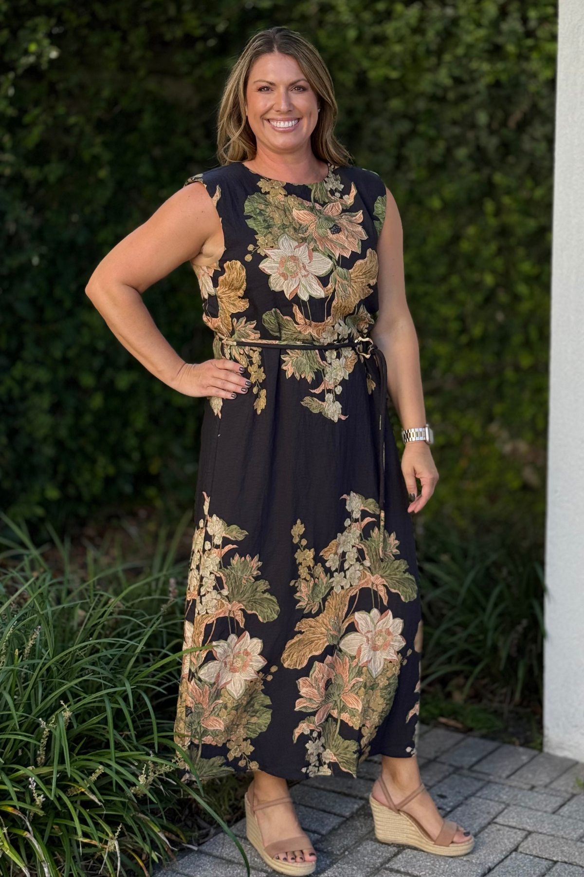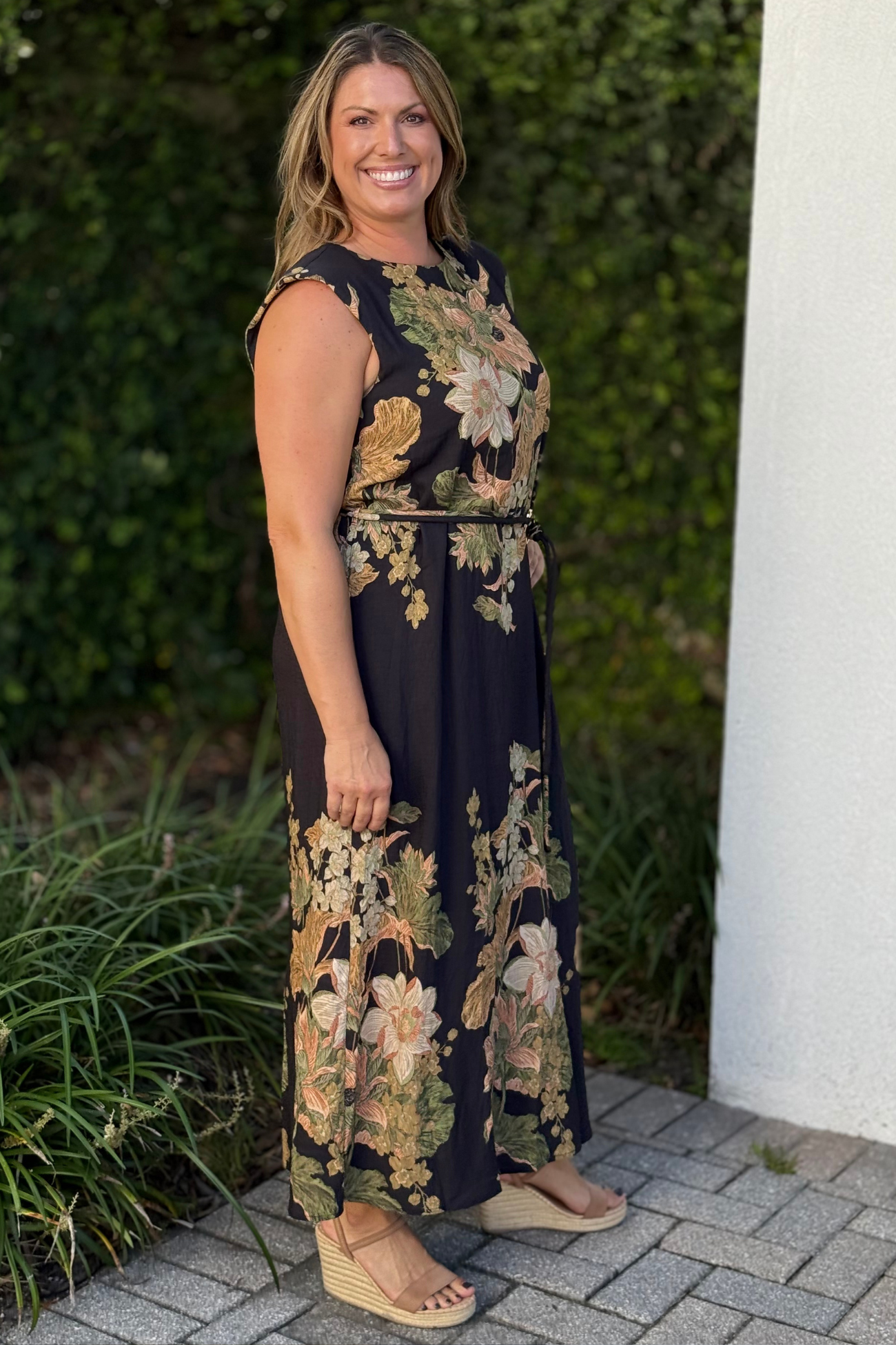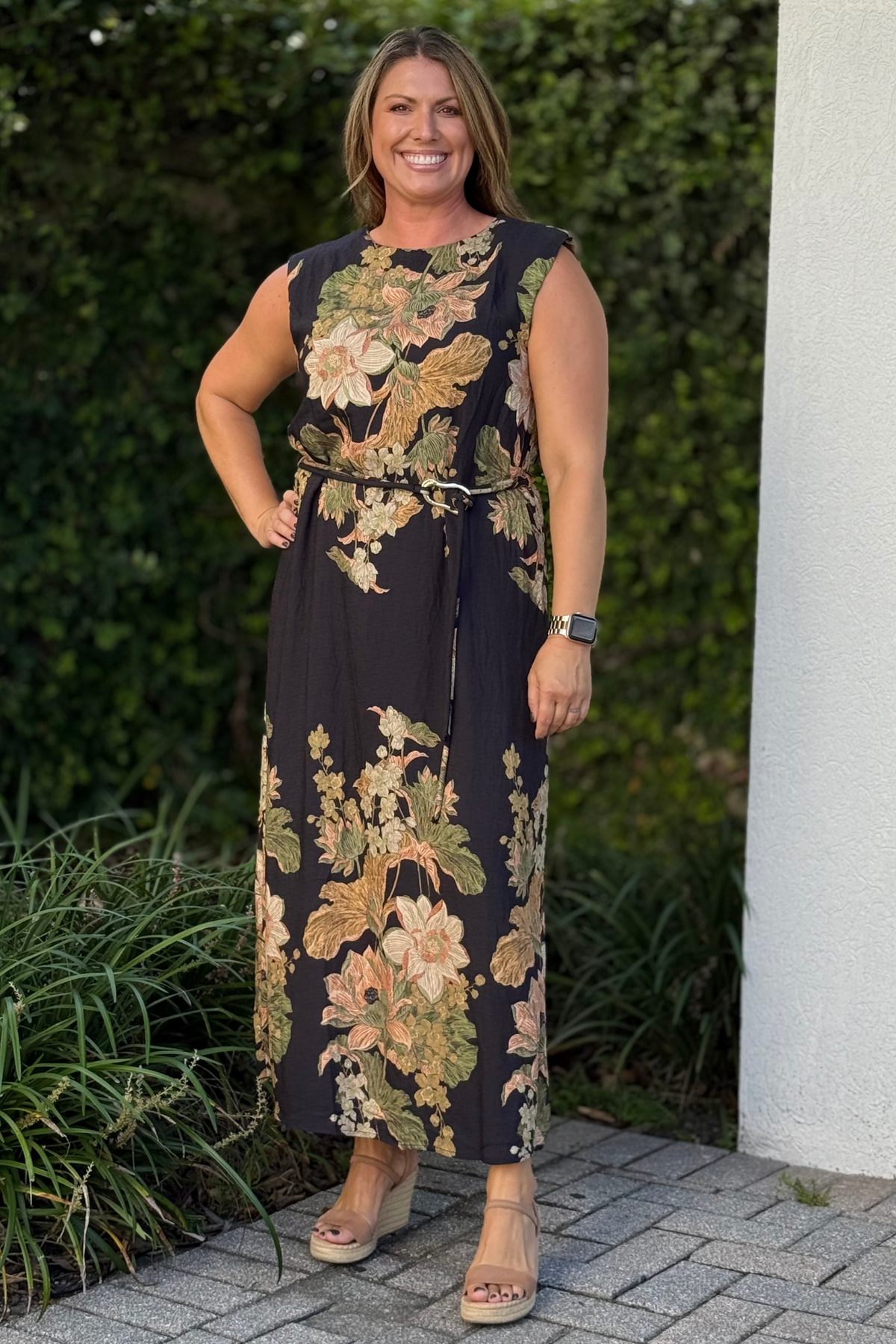 The Golden Bloom Midi Dress brings effortless elegance to your wardrobe with its striking black backdrop and rich floral prints in earthy tones. The sleeveless silhouette and lightweight rayon blend fabric flow beautifully, while the braided tie belt lets you cinch the waist for a perfectly flattering fit. Ideal for fall weddings, brunch dates, or an elevated everyday outing, this dress moves with you from season to season in graceful style.