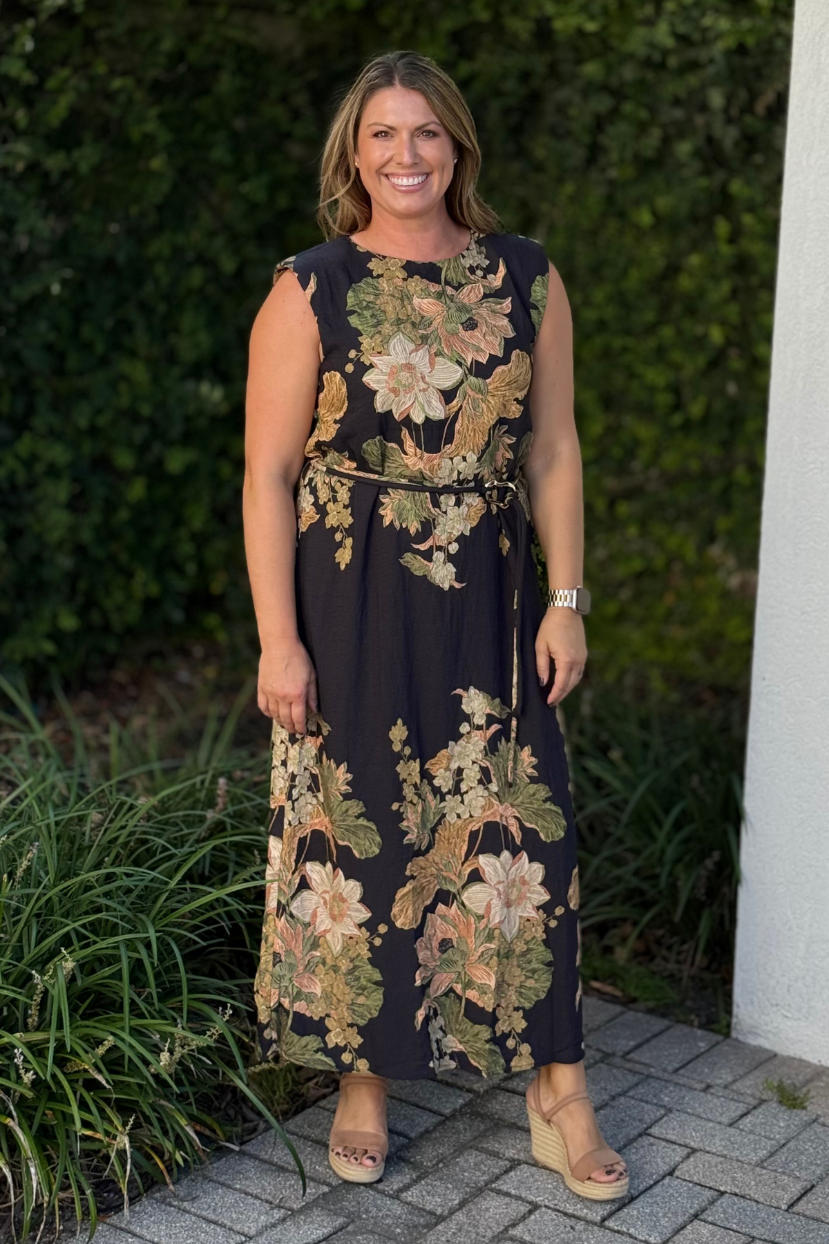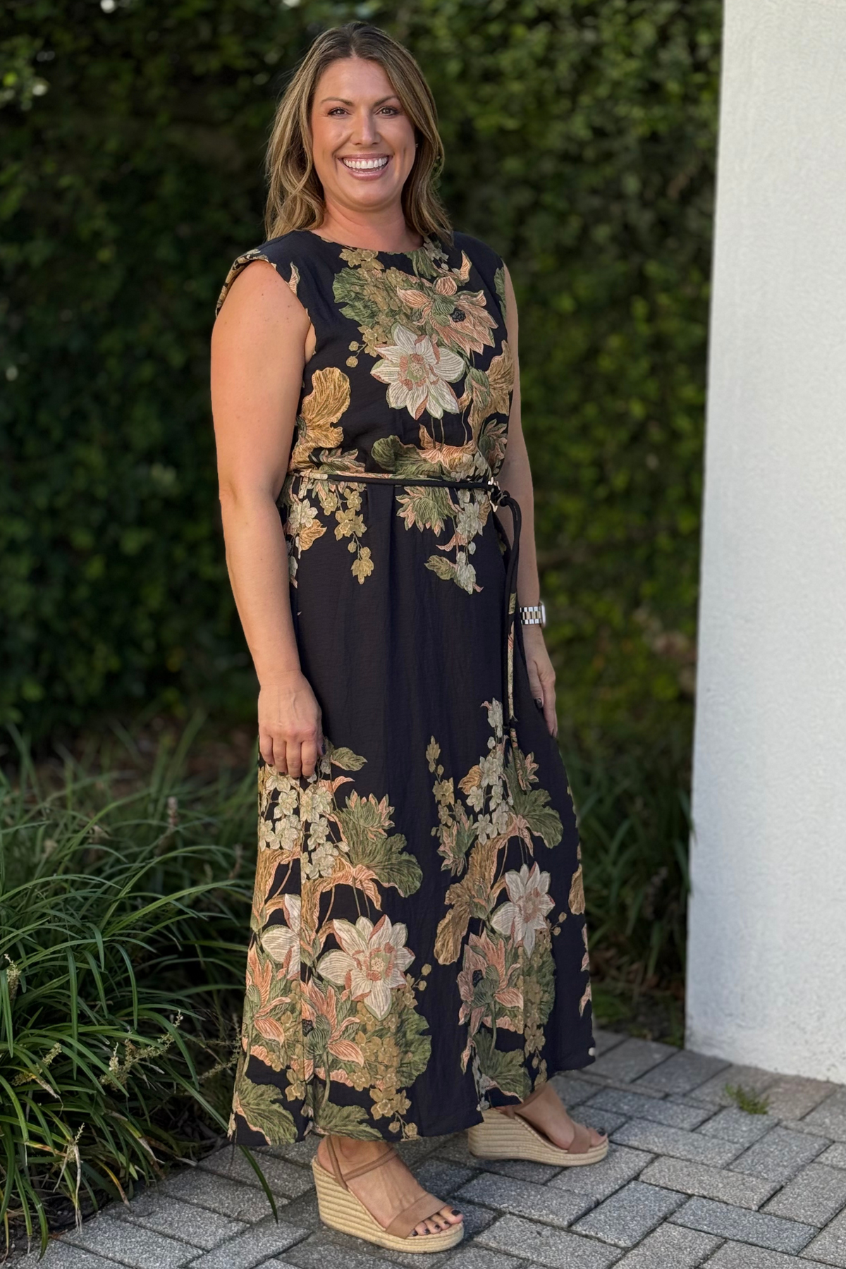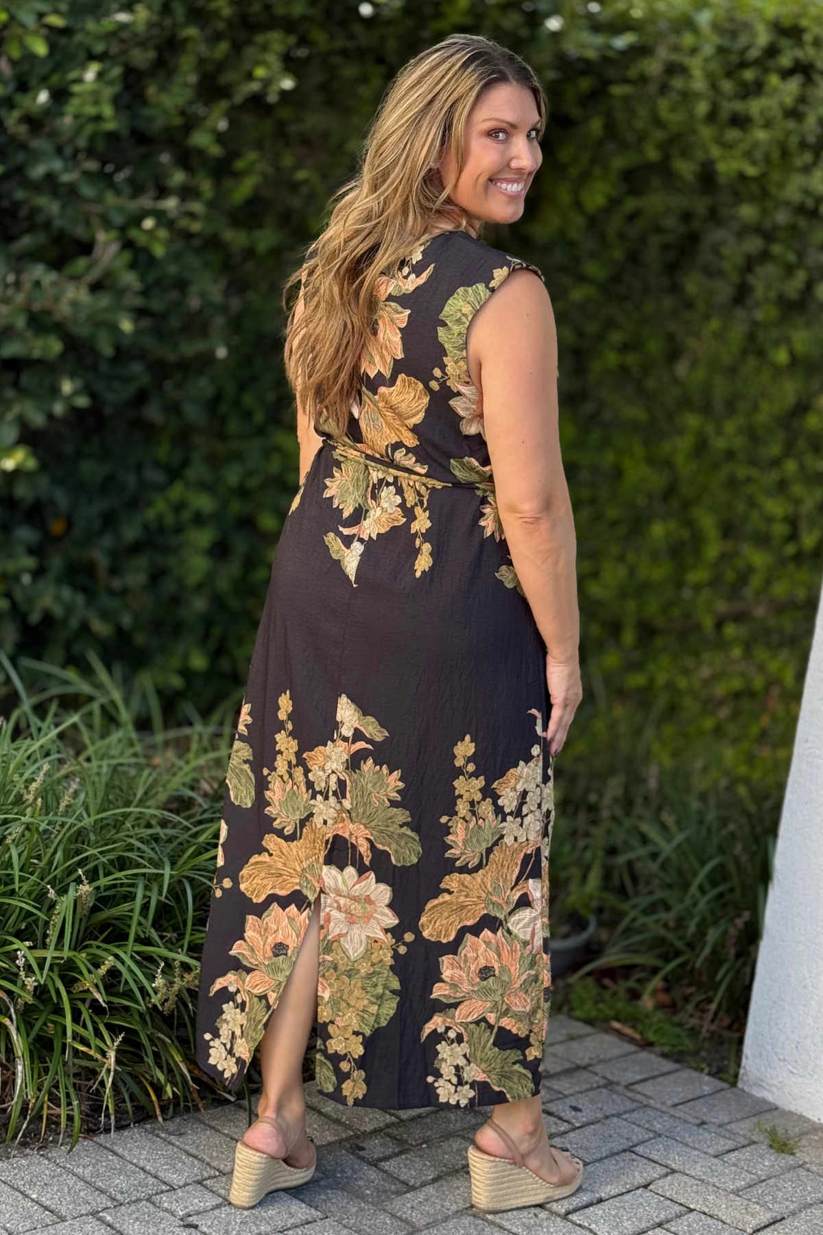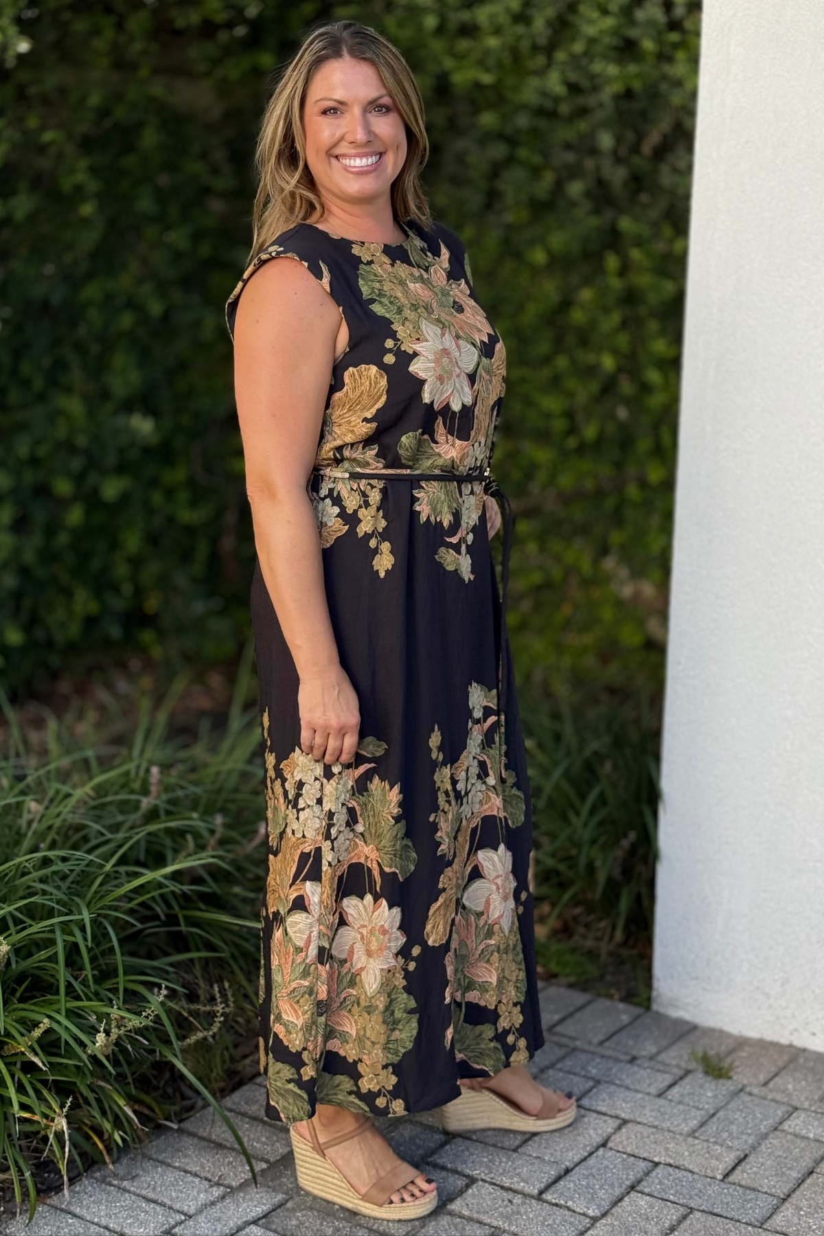 The Golden Bloom Midi Dress brings effortless elegance to your wardrobe with its striking black backdrop and rich floral prints in earthy tones. The sleeveless silhouette and lightweight rayon blend fabric flow beautifully, while the braided tie belt lets you cinch the waist for a perfectly flattering fit. Ideal for fall weddings, brunch dates, or an elevated everyday outing, this dress moves with you from season to season in graceful style.