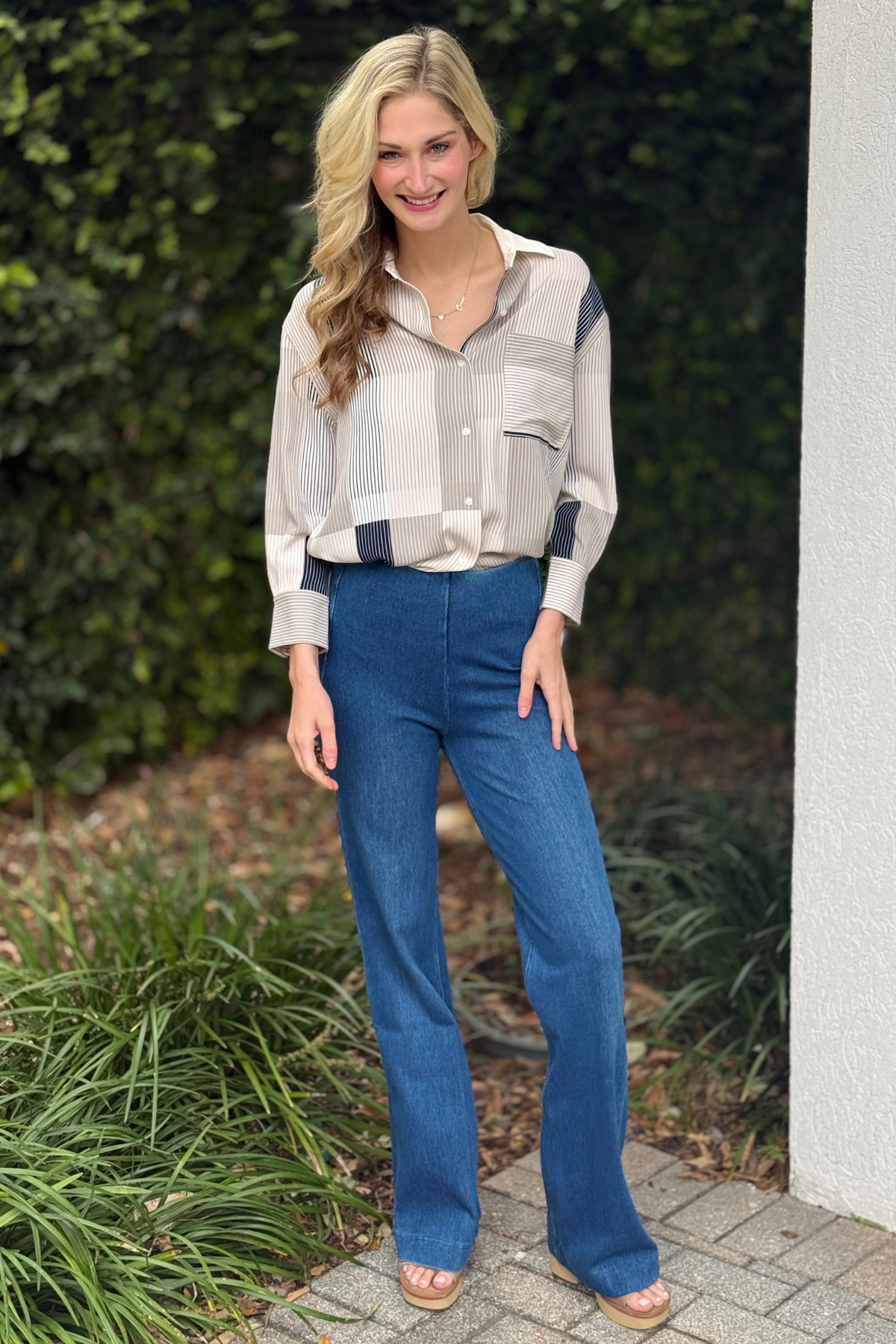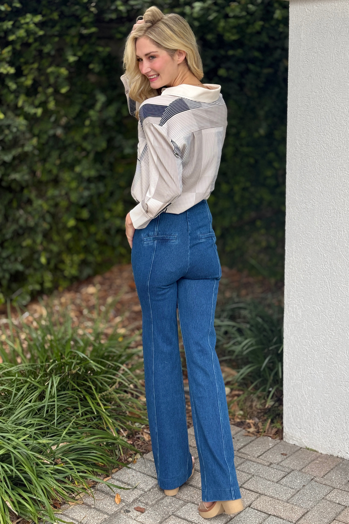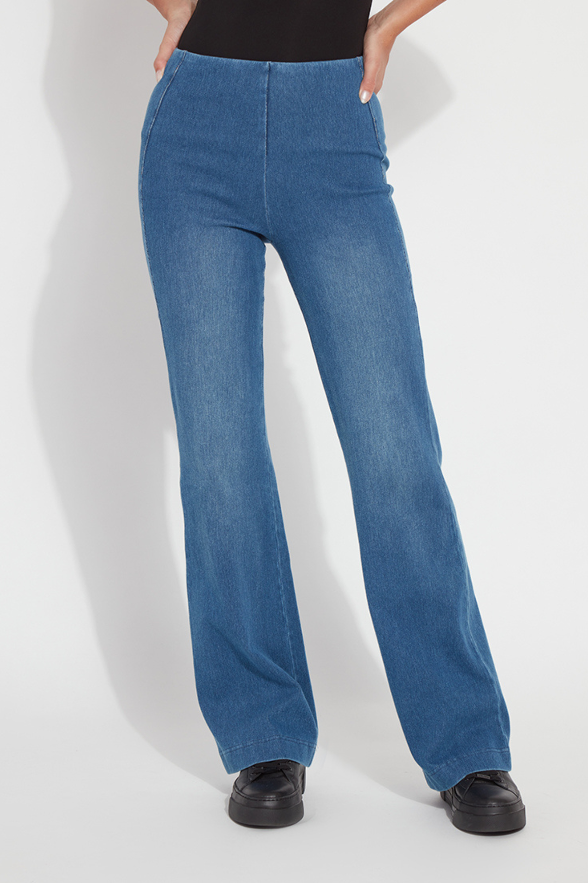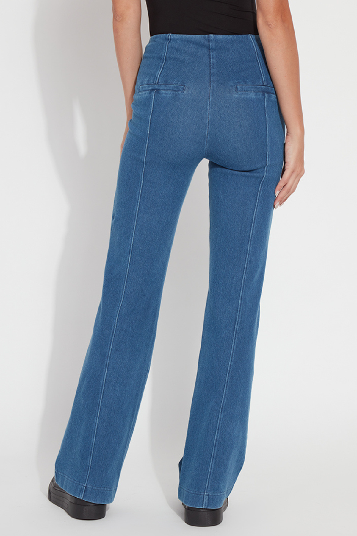 Thoughtfully designed with forward-shifted seams, this trouser creates the illusion of a slimmer hip while beautifully skimming through the hip and thigh before flowing into a straight flare leg. The mid-wash denim finish keeps the look versatile for casual styling or elevated outfit pairings. Finished with back welt pockets and a clean pull-on design, these trousers combine modern structure with the softness and ease Lyssé is known for.