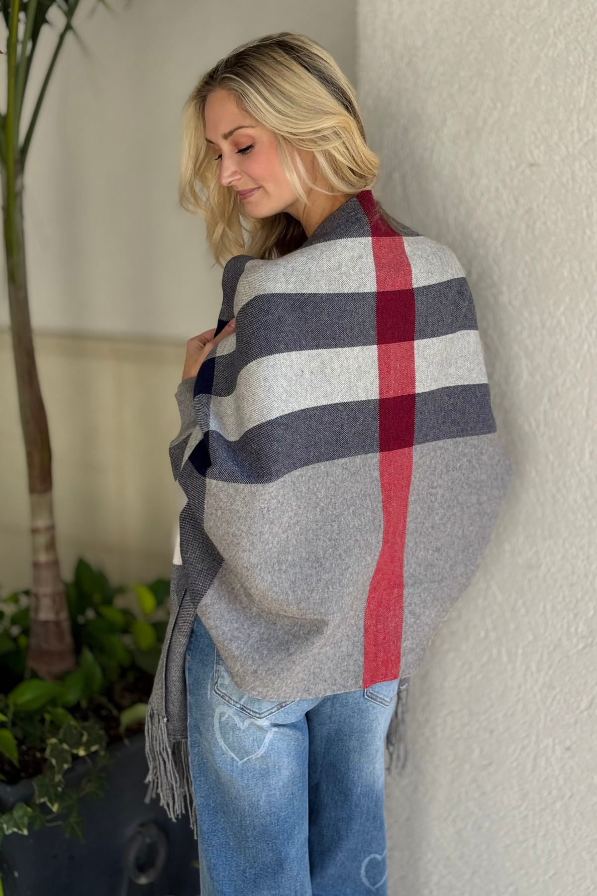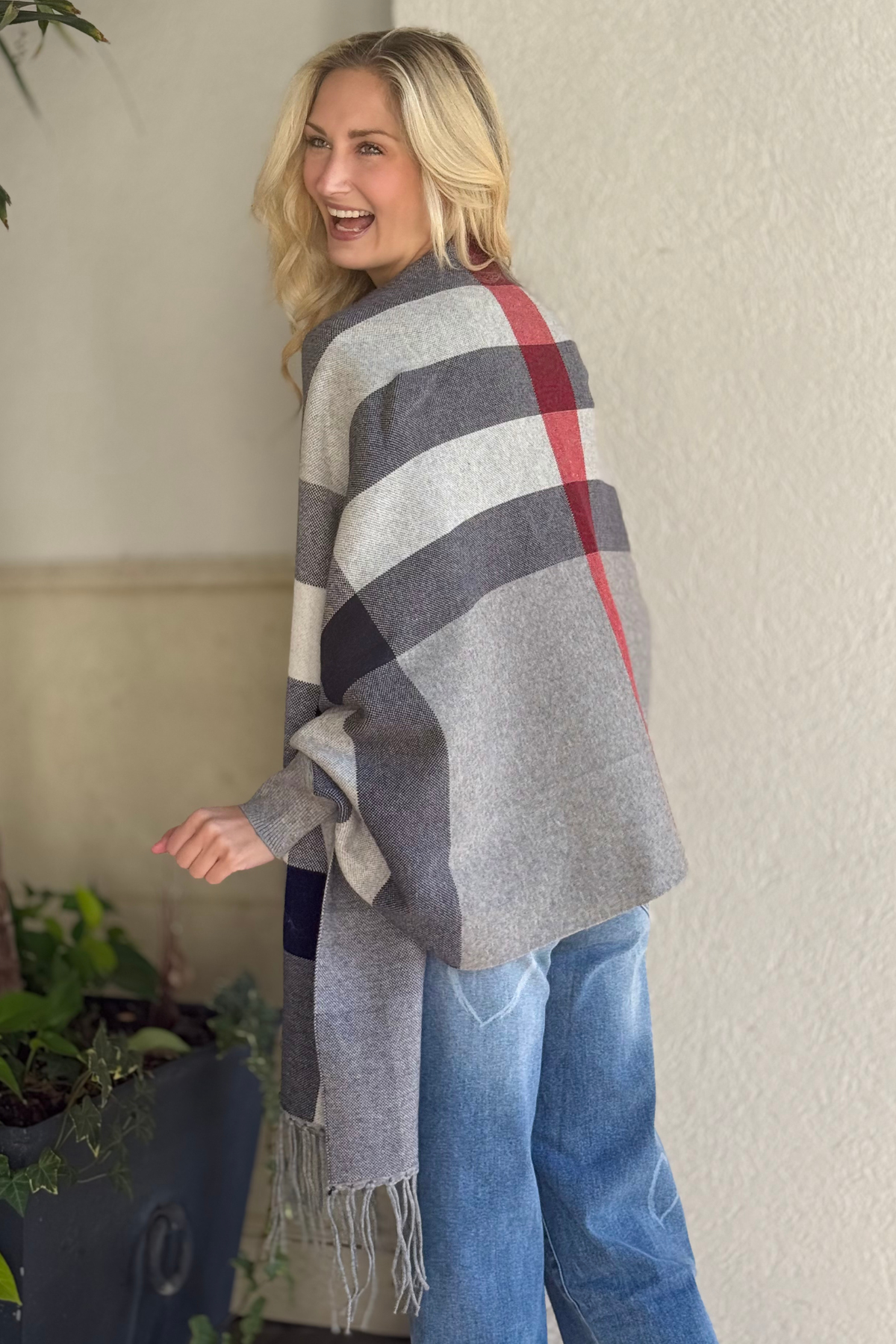 Classic and cozy, this navy checkered shawl poncho brings effortless style to cool-weather layering. Made from soft acrylic, it features an open-front design, relaxed sleeves, and fringe detailing for a chic, easy-flowing look. The bold navy check pattern pairs beautifully with jeans, leggings, or travel outfits.